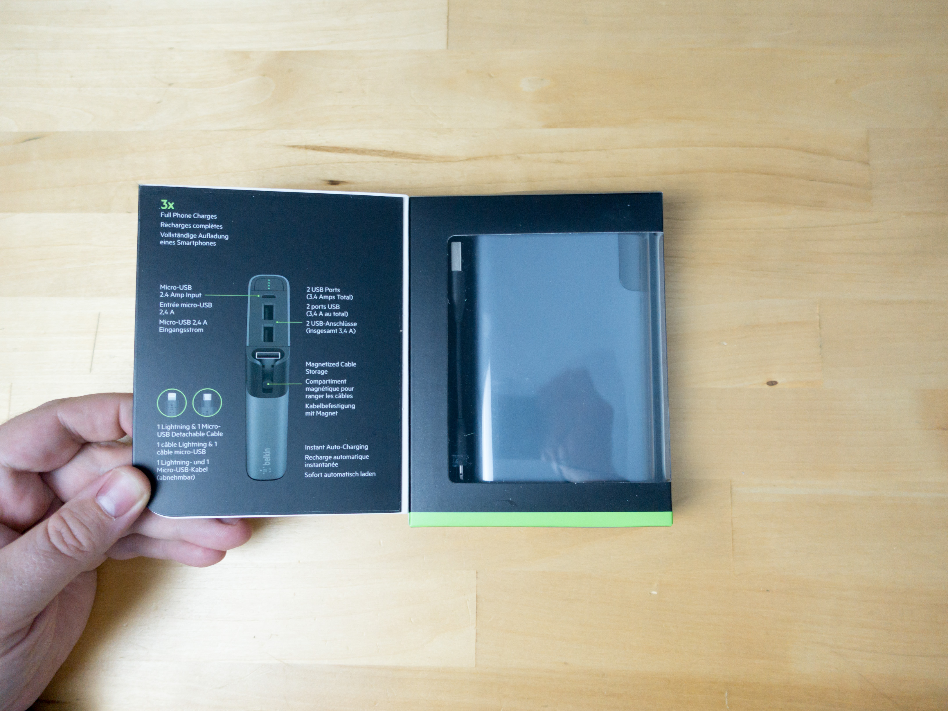 Et … sur le coté on remarque un emplacement pour le câble de charge ! C’est vraiment ça la grosse nouveauté de cette batterie, Belkin a prévu un rangement intégré du câble, et je trouve ça très malin. Il m’arrive souvent d’avoir une batterie sous la main, sans câble USB, et c’est plutôt frustrant.