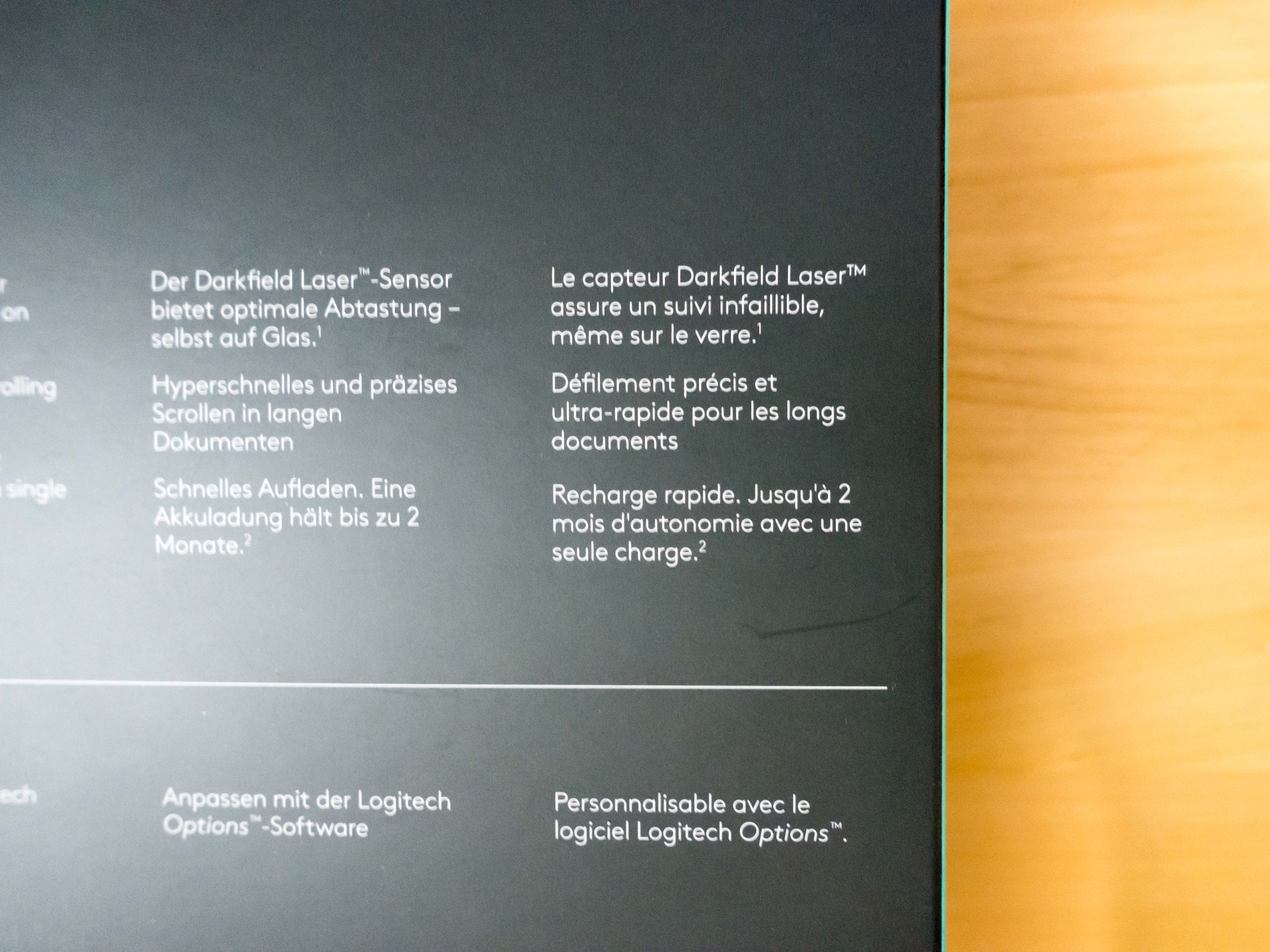 Comme toujours avec les produits haut de gamme de Logitech, on a droit à un emballage plutôt sympa. Une boite relativement grosse (voir énorme), qui s’ouvre et se referme (avec un petit aimant intégré …) et qui présente bien le produit. On découvre donc en observant un peu la boite que la souris qu’elle est adaptée à toutes les surfaces, et qu’elle peut se connecter sur 3 appareils en même temps.