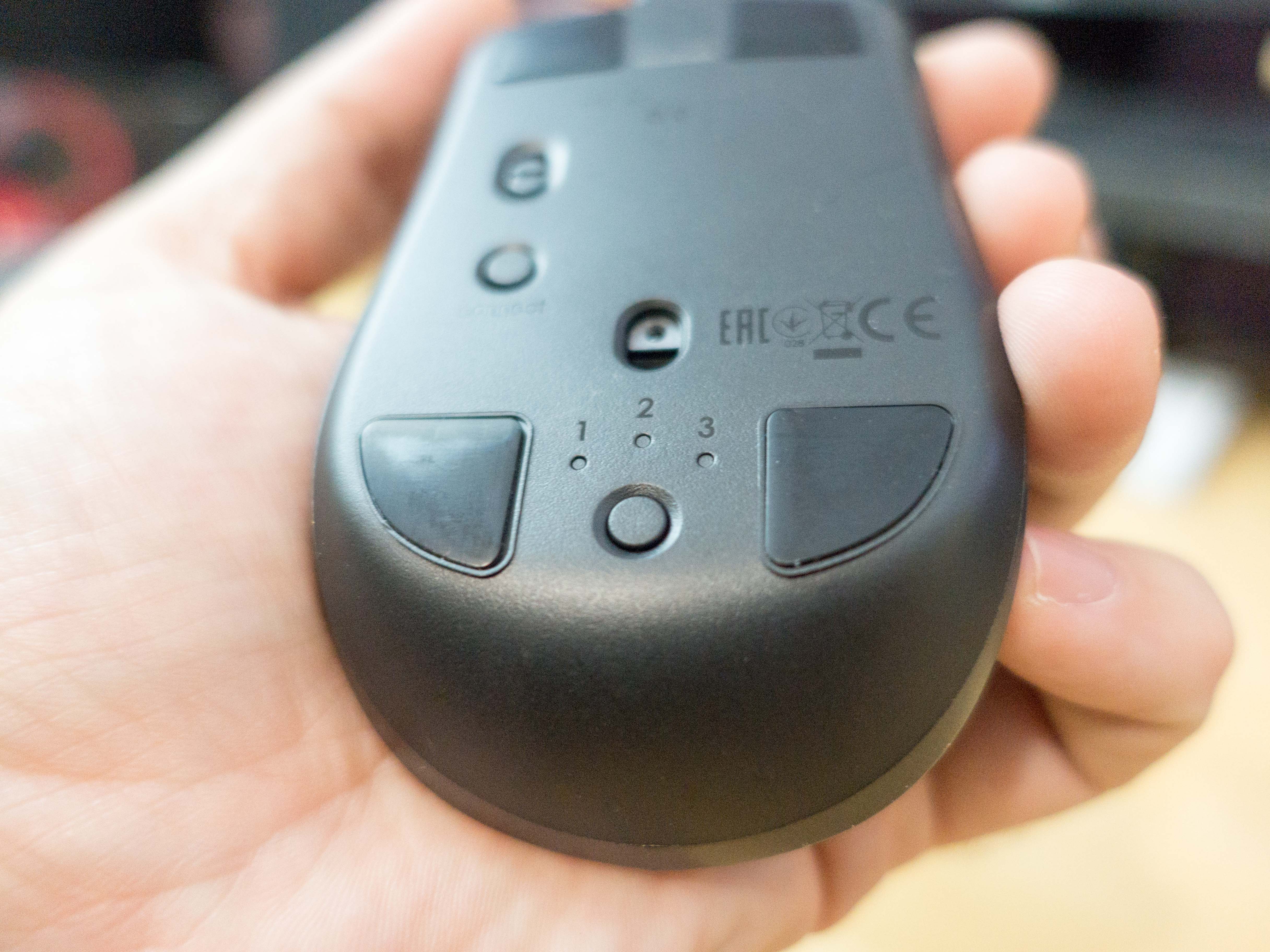 J’aime particulièrement les formes « lowpoly » des flancs latéraux, qui donnent à cette souris un coté moderne et plutôt classe. Sous le dessous, rien de bien spécifique si ce n’est un petit bouton & une LED qui permettra de switcher entre les différents appareils appairés (3). Le bouton est plutot facile à cliquer. On a ensuite 4 pads de glisse plutot petits, et un bouton ON/OFF accompagné d’un bouton d’appairage bluetooth.
