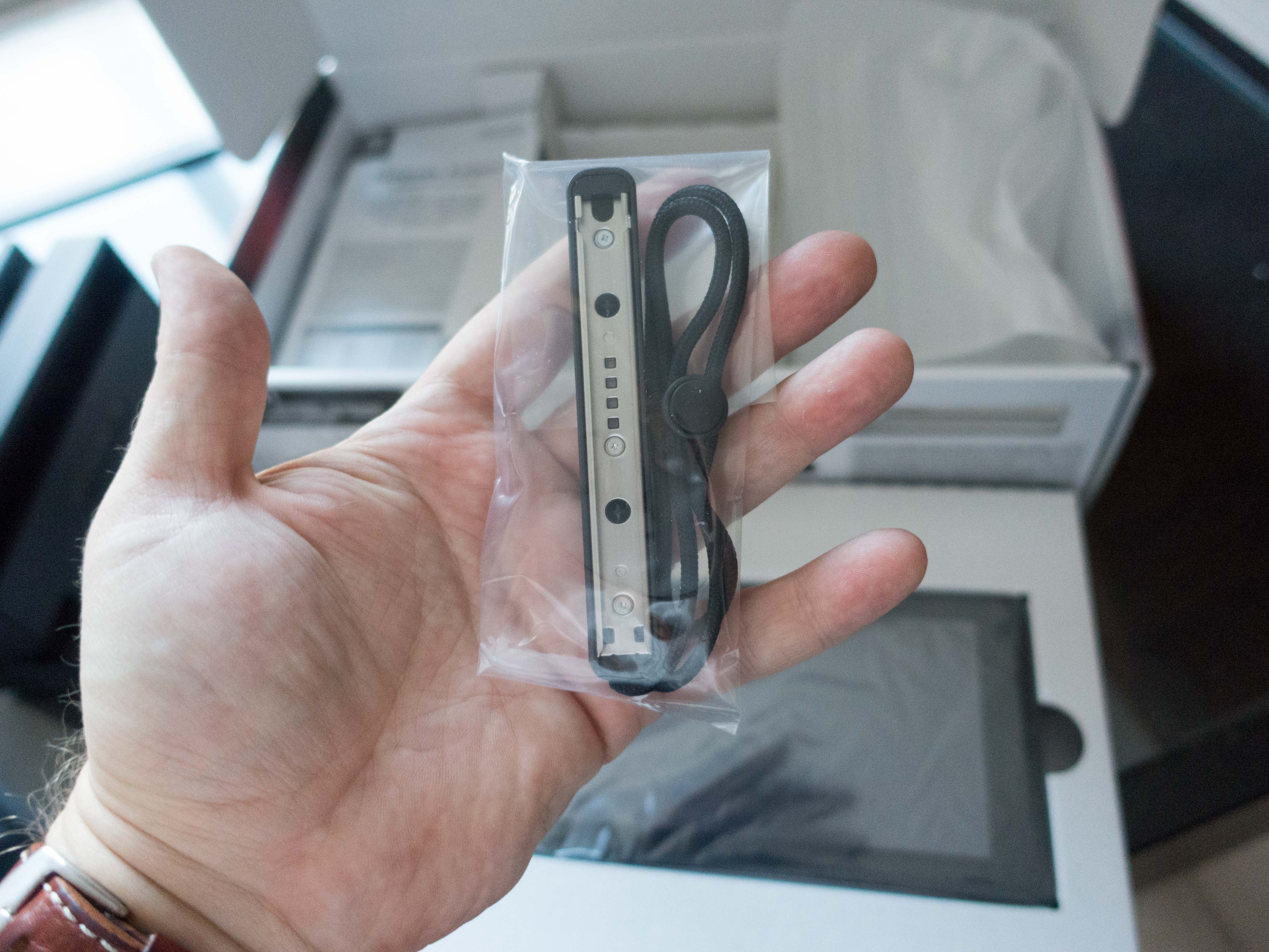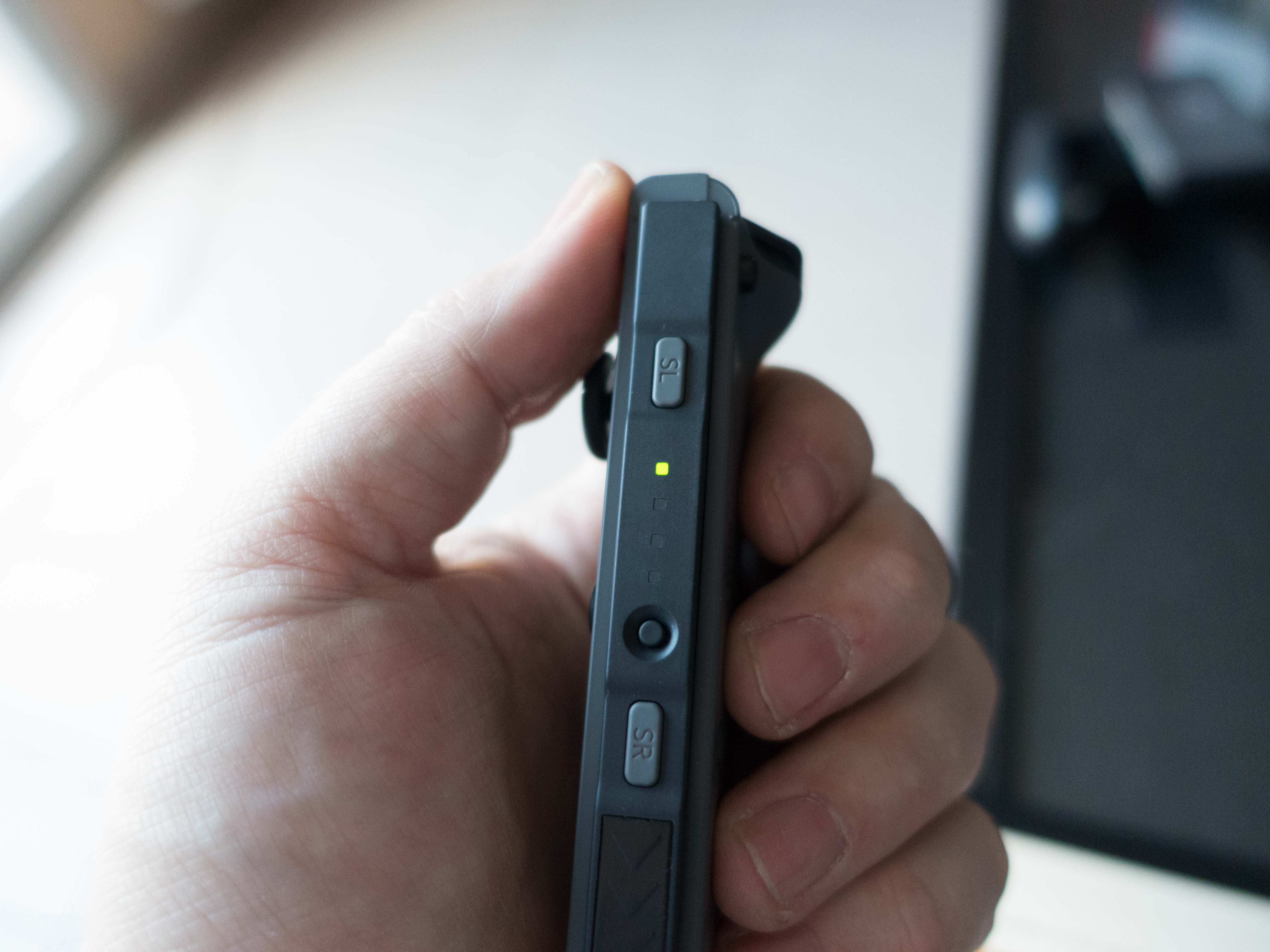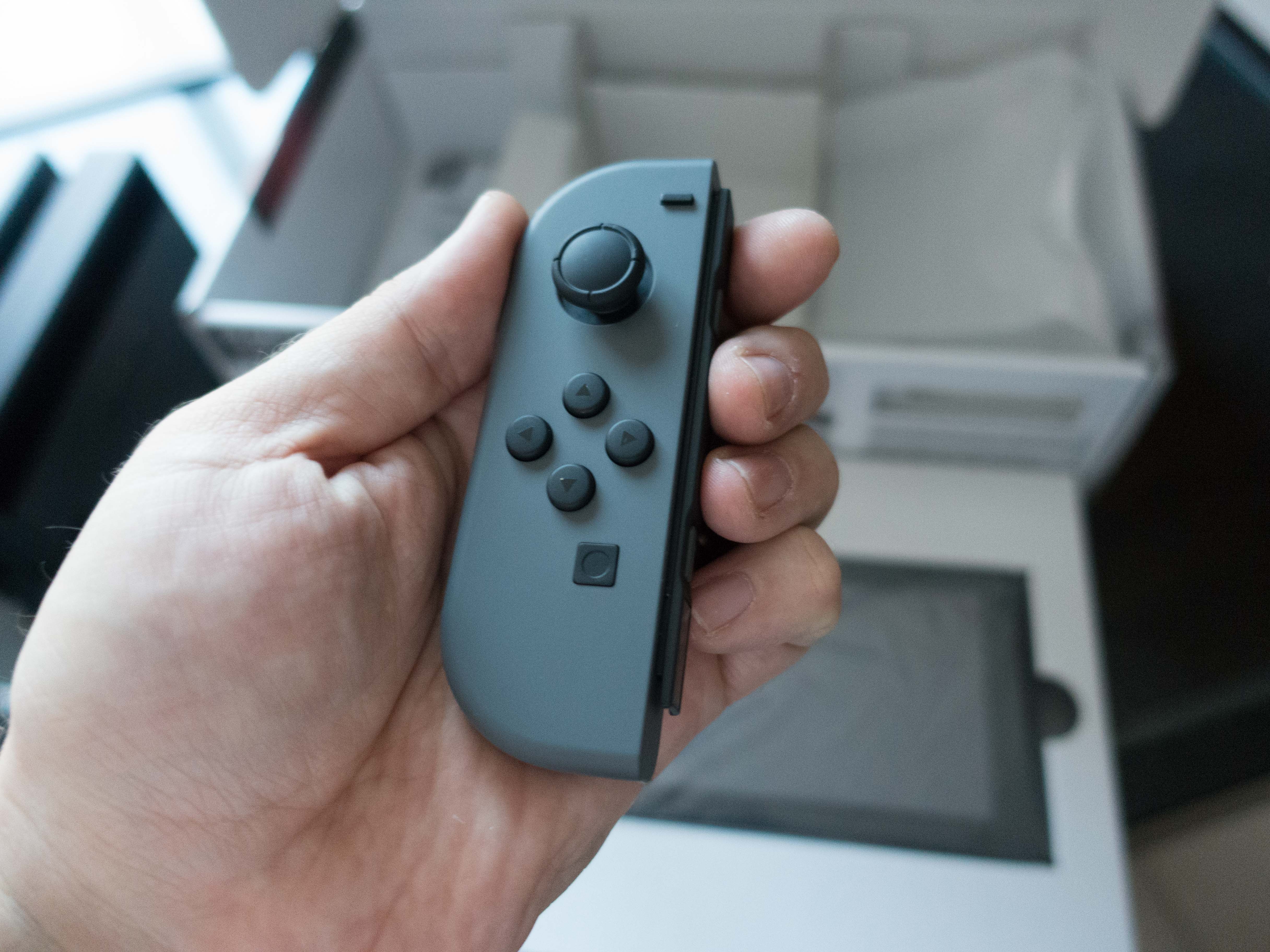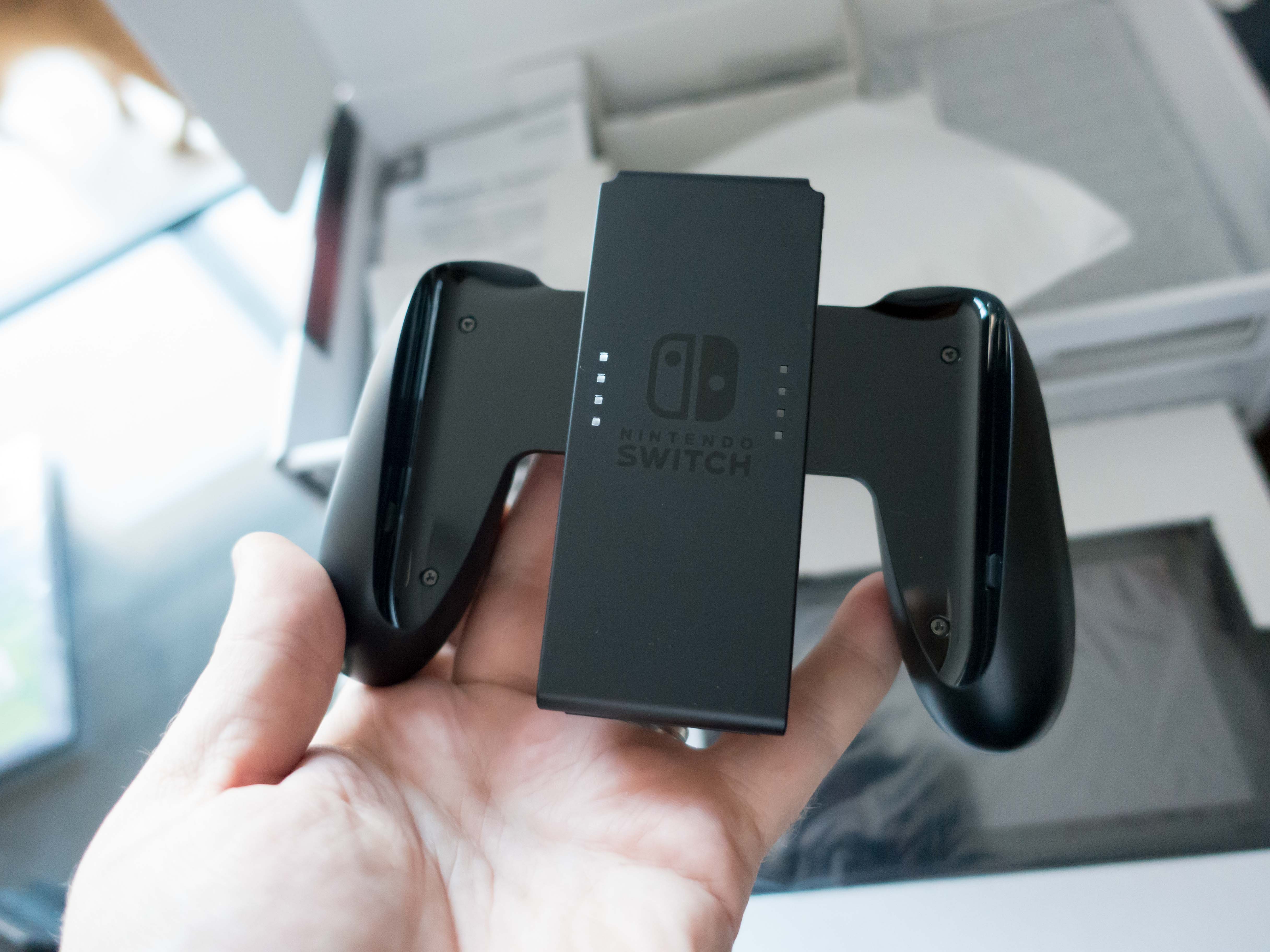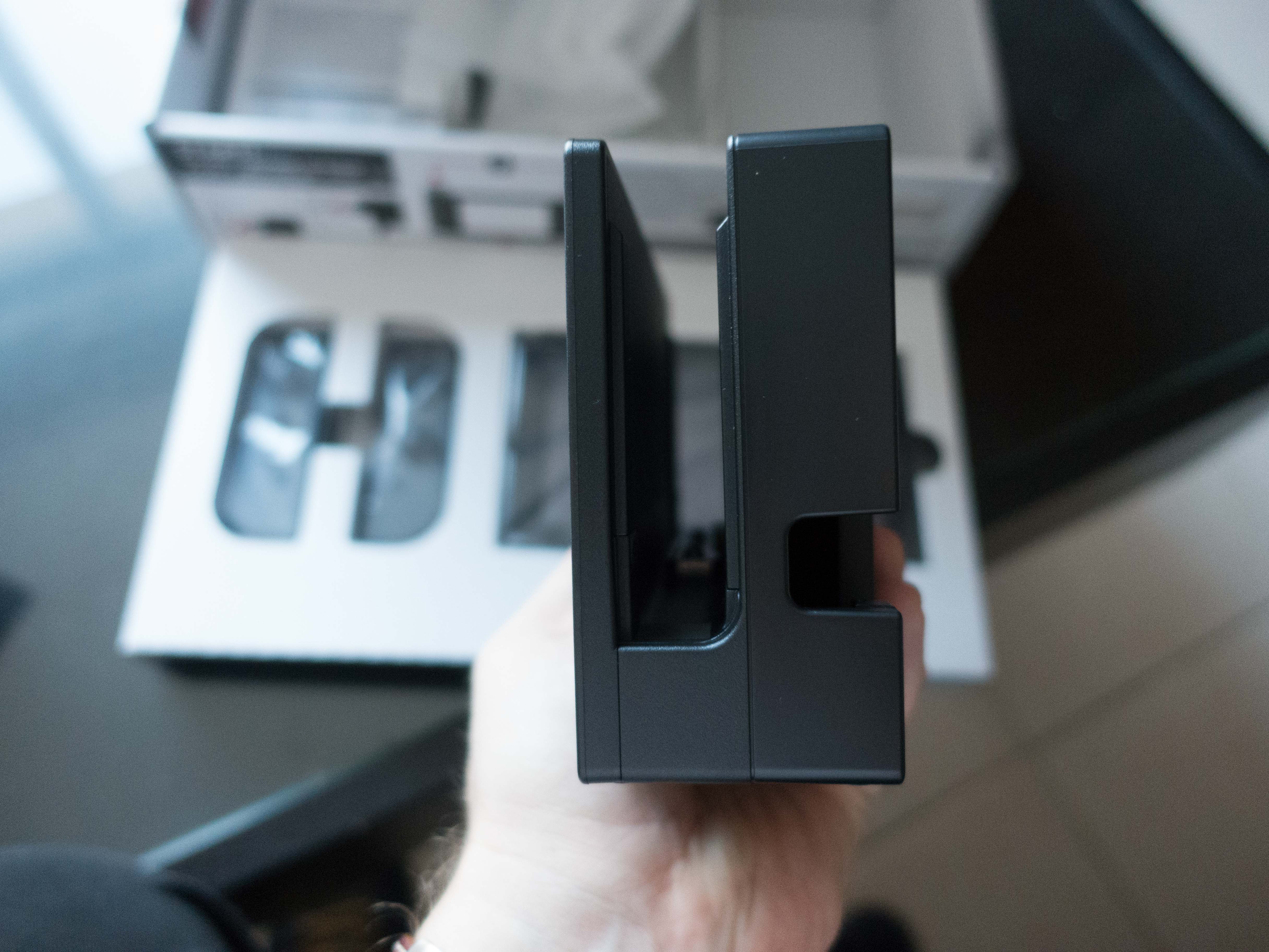 J’ai ensuite installé les JoyCons sur la console et…. la magie du « clic clic » opère. J’adore le bruit que font les glissières au moment du verrouillage des manettes (ça a été forcément travaillé par Nintendo) ! Au passage je découvre aussi que Nintendo livre un petit support pour fixer les JoyCons quand on veut jouer en mode console de salon. Pratique.