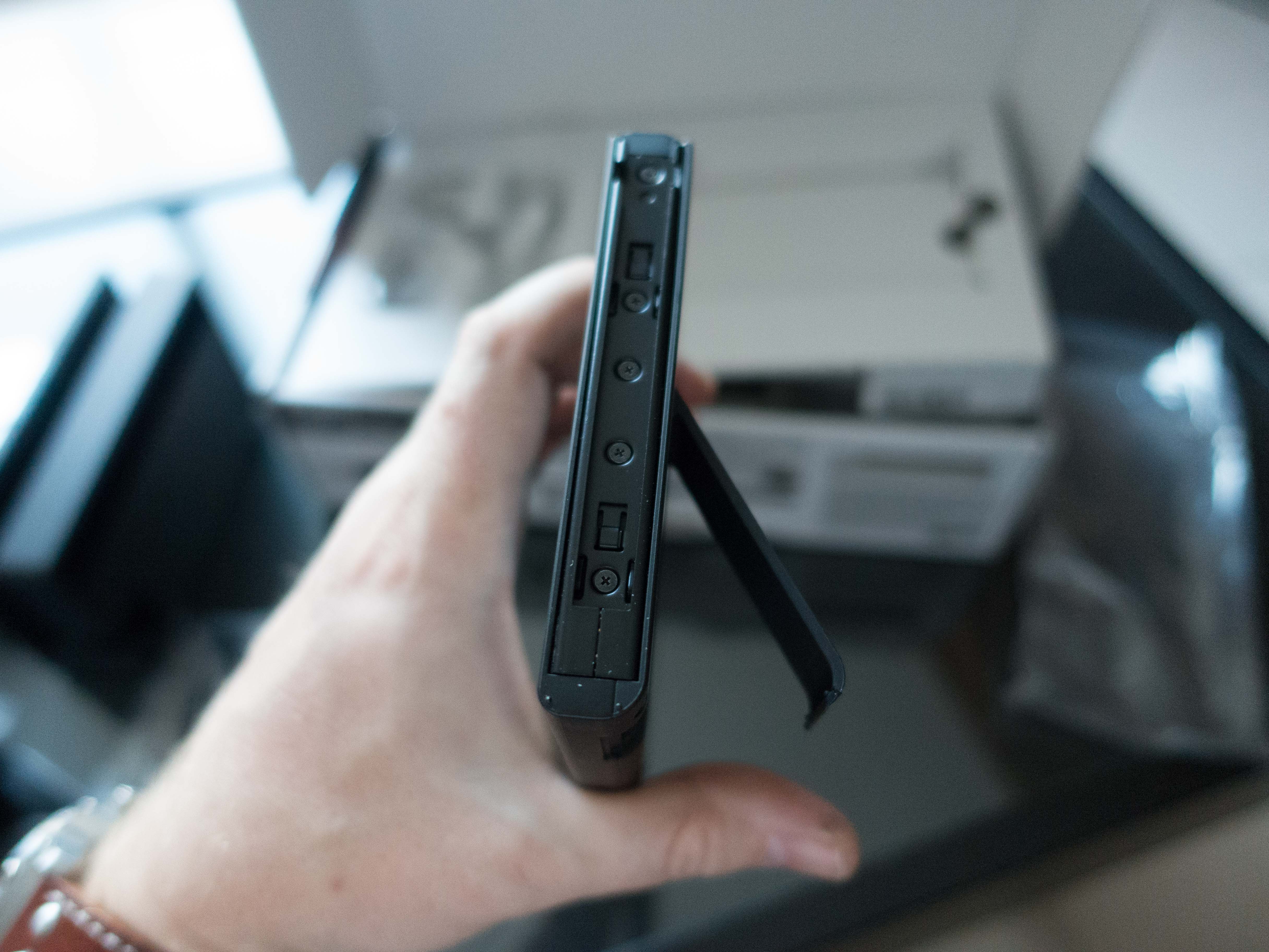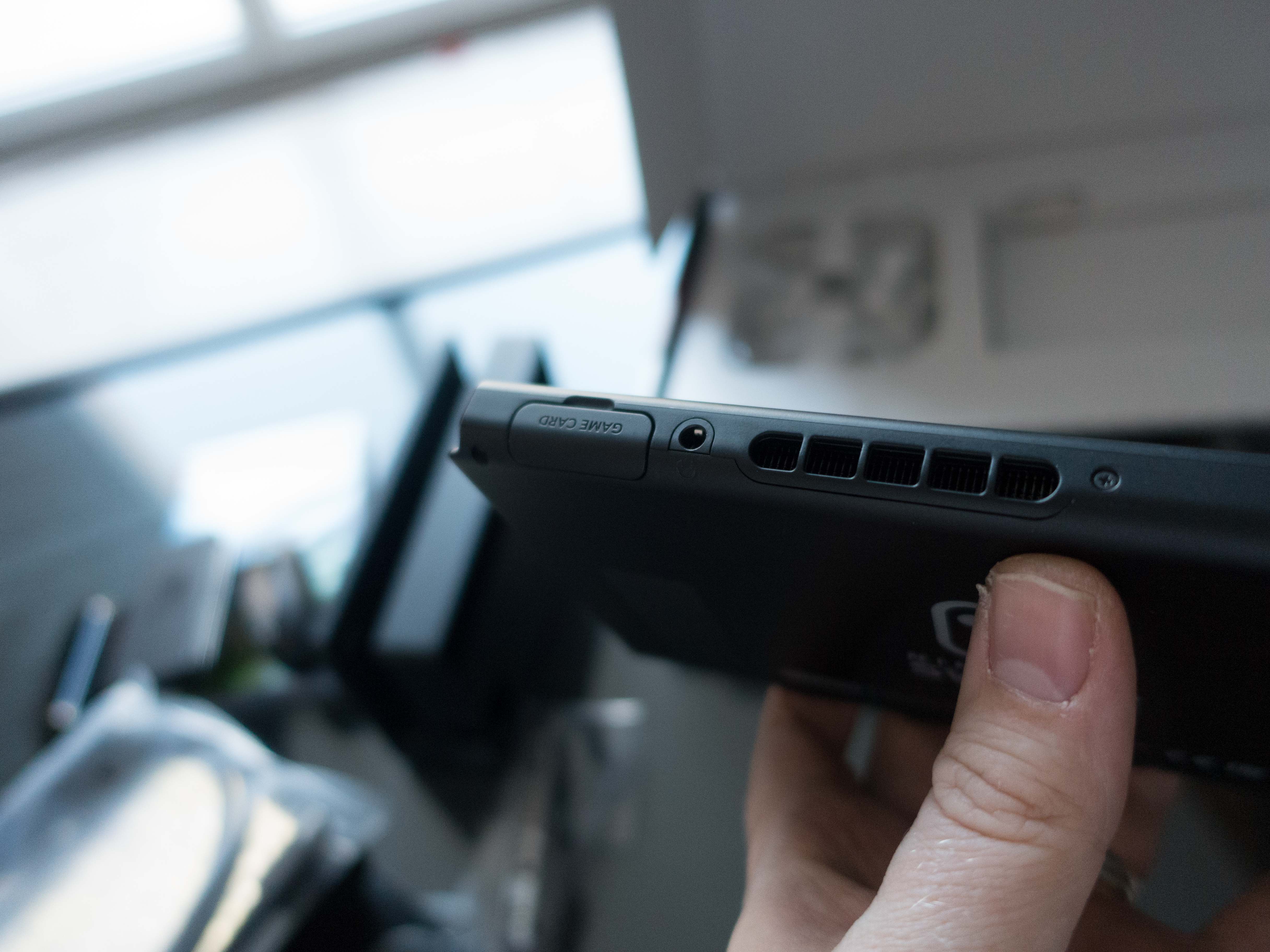 Cette console peut faire fonctionner des jeux sur cartouche, mais aussi on peut télécharger tous les jeux depuis le store Nintendo (attention, prévoir une carte SD de grande capacité). Je découvre donc une petite fente sur le dessus de la console pour y mettre la cartouche en question.