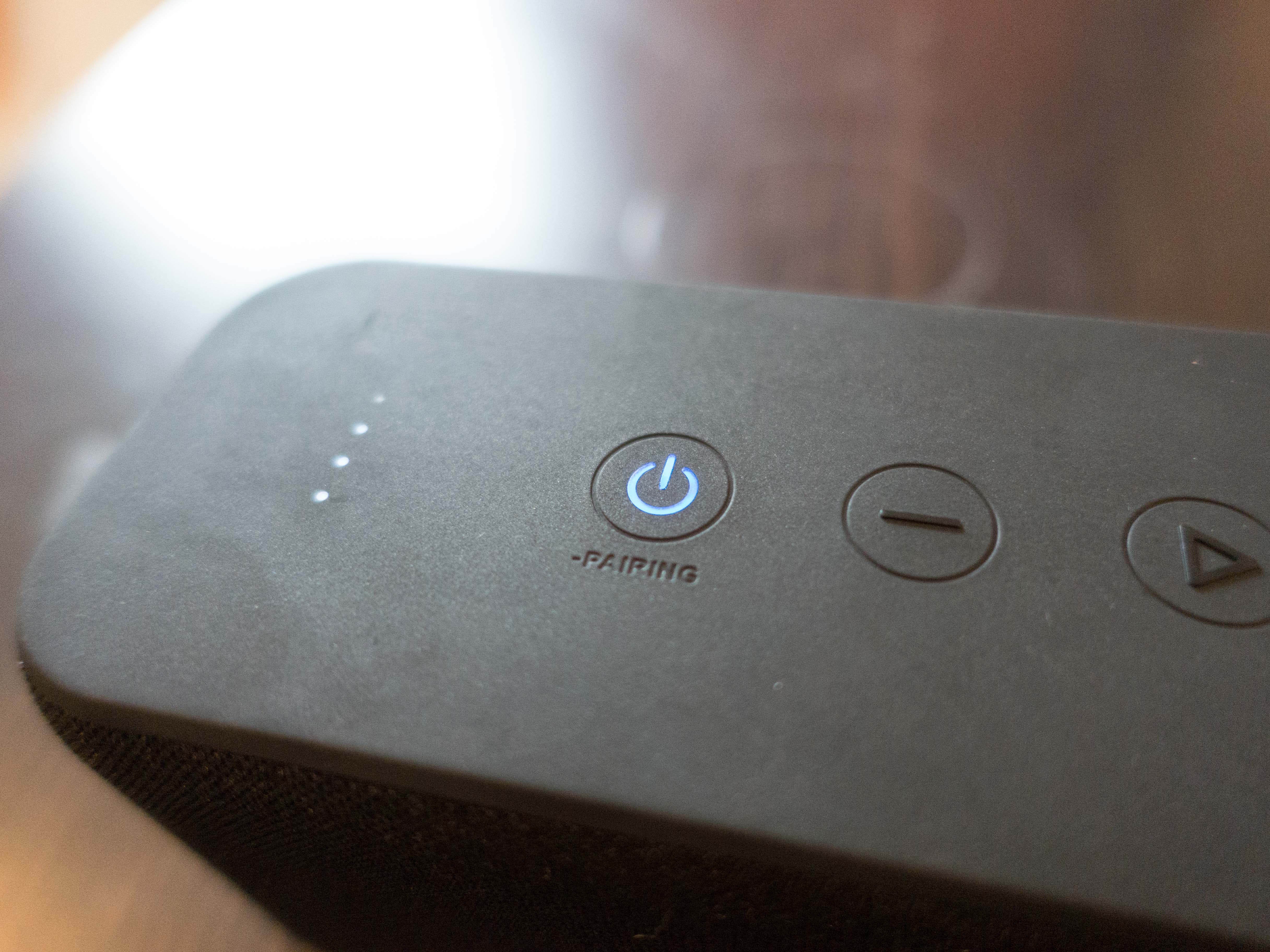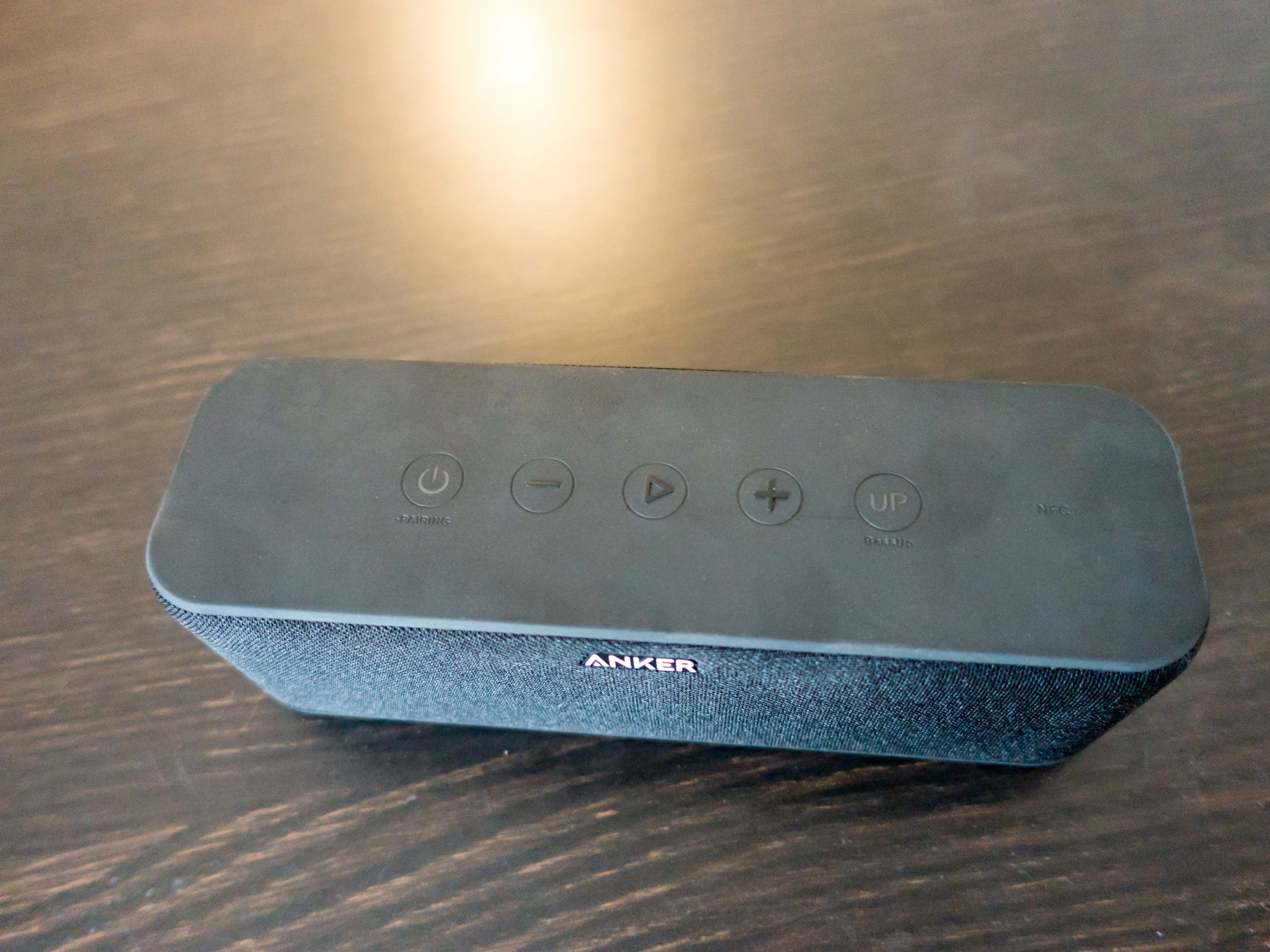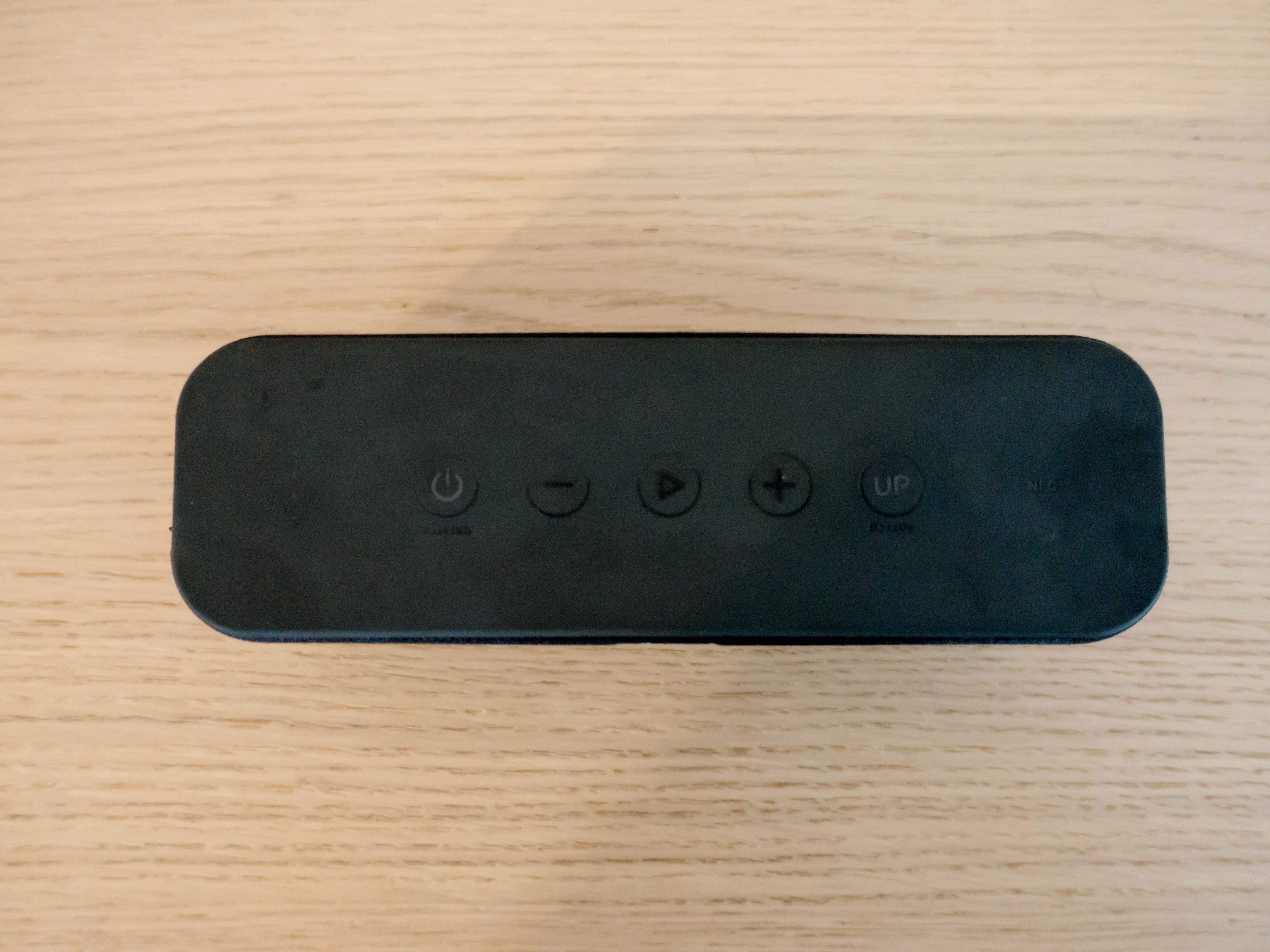 Sur le dessus de l’enceinte, on retrouve plusieurs touches. Un bouton power (qui s’allume et indique le status de l’enceinte au niveau appairage), 2 touches pour le volume, un touche une lecture/pause et un bouton de bass boost (noté UP). Les boutons sont très clean, et on un feeling très propre. Ca clique bien, c’est franc et ça donne une impression de bien meilleure qualité que les touches de la Anker SoundCore précédente.