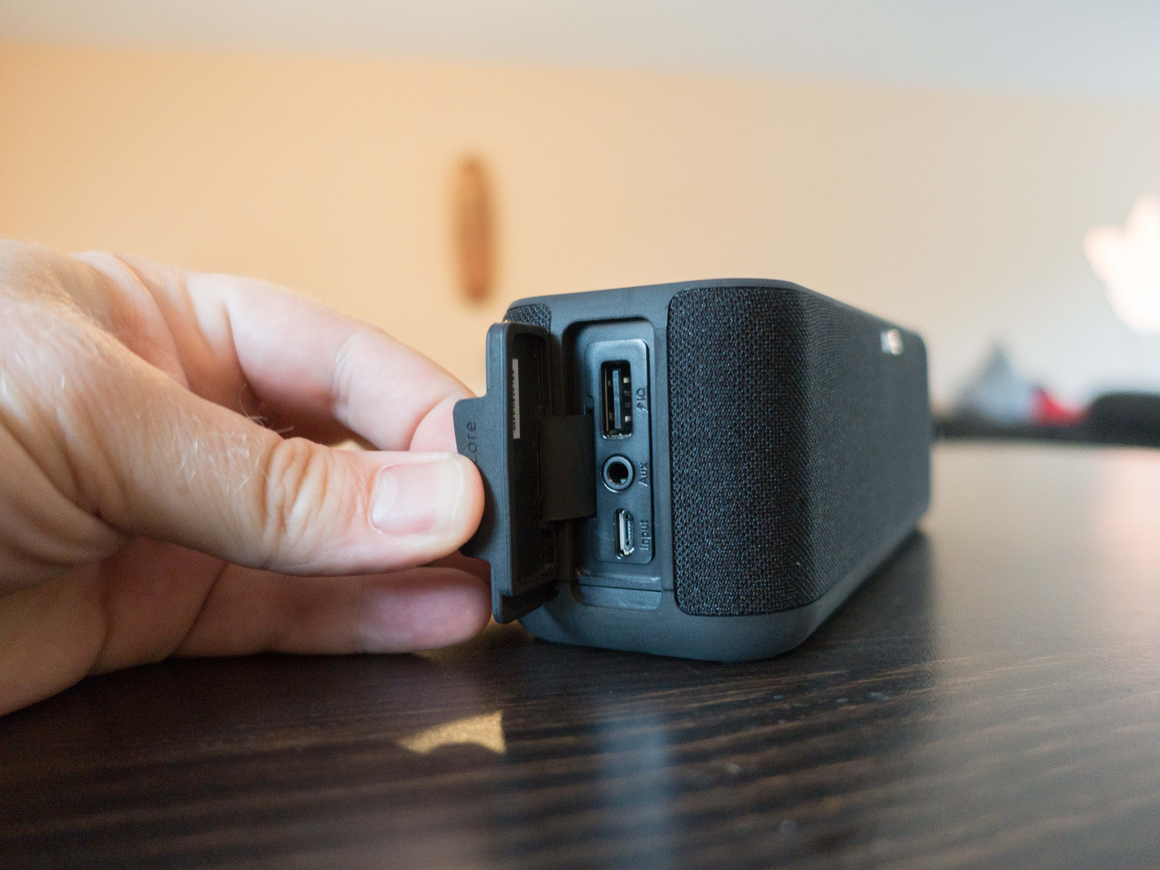 Petit détail sympa, une petite languette caoutchouc est présente sur le coté. Elle ajoute un coté « premium » de cette SoundCore, mais aussi à permettre d’ouvrir le petit capot de protection étanche qui découvre les connections: un microUSB de charge, un USB de décharge (1A) et une prise AUX en format jack). Très propre encore une fois. J’aime !