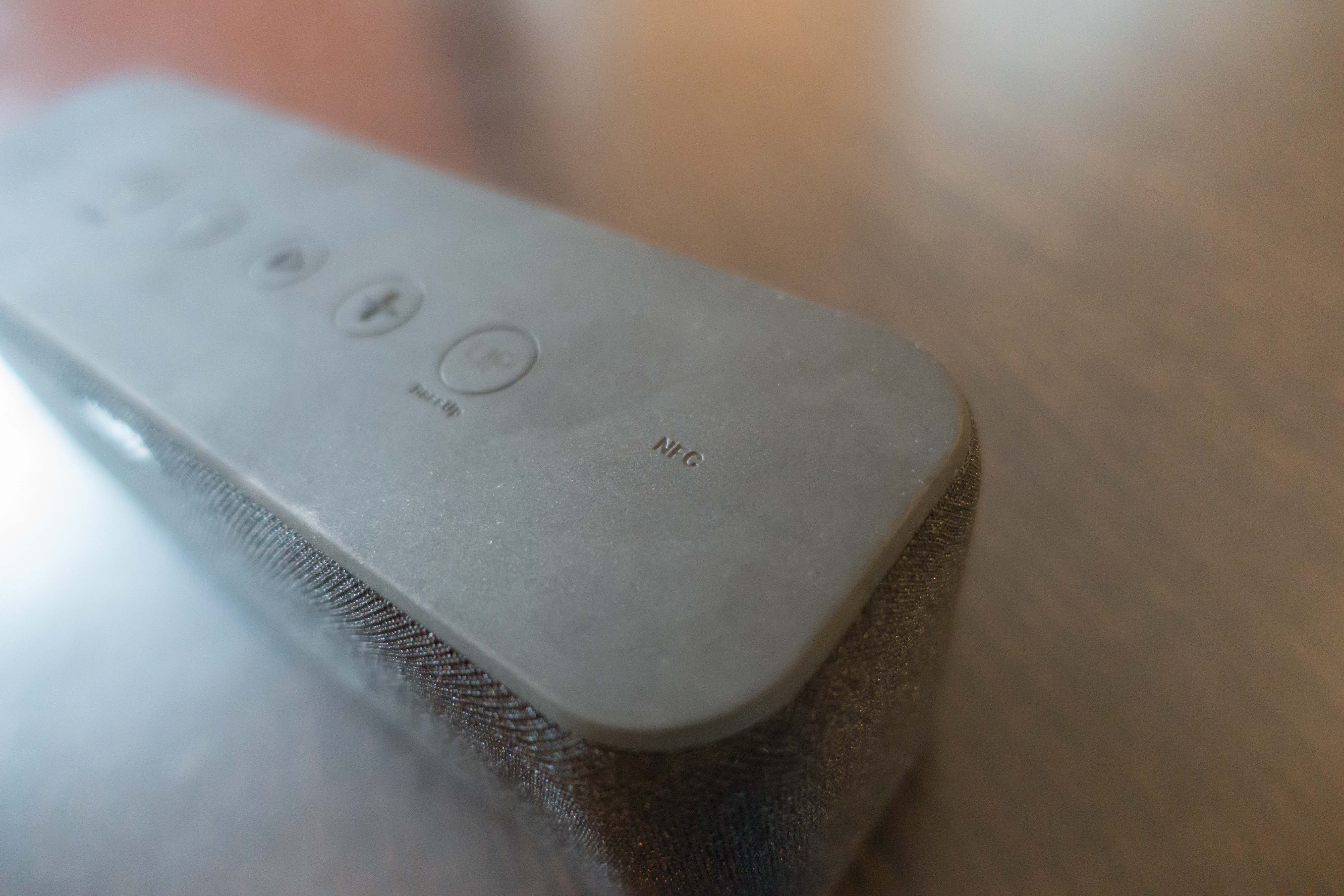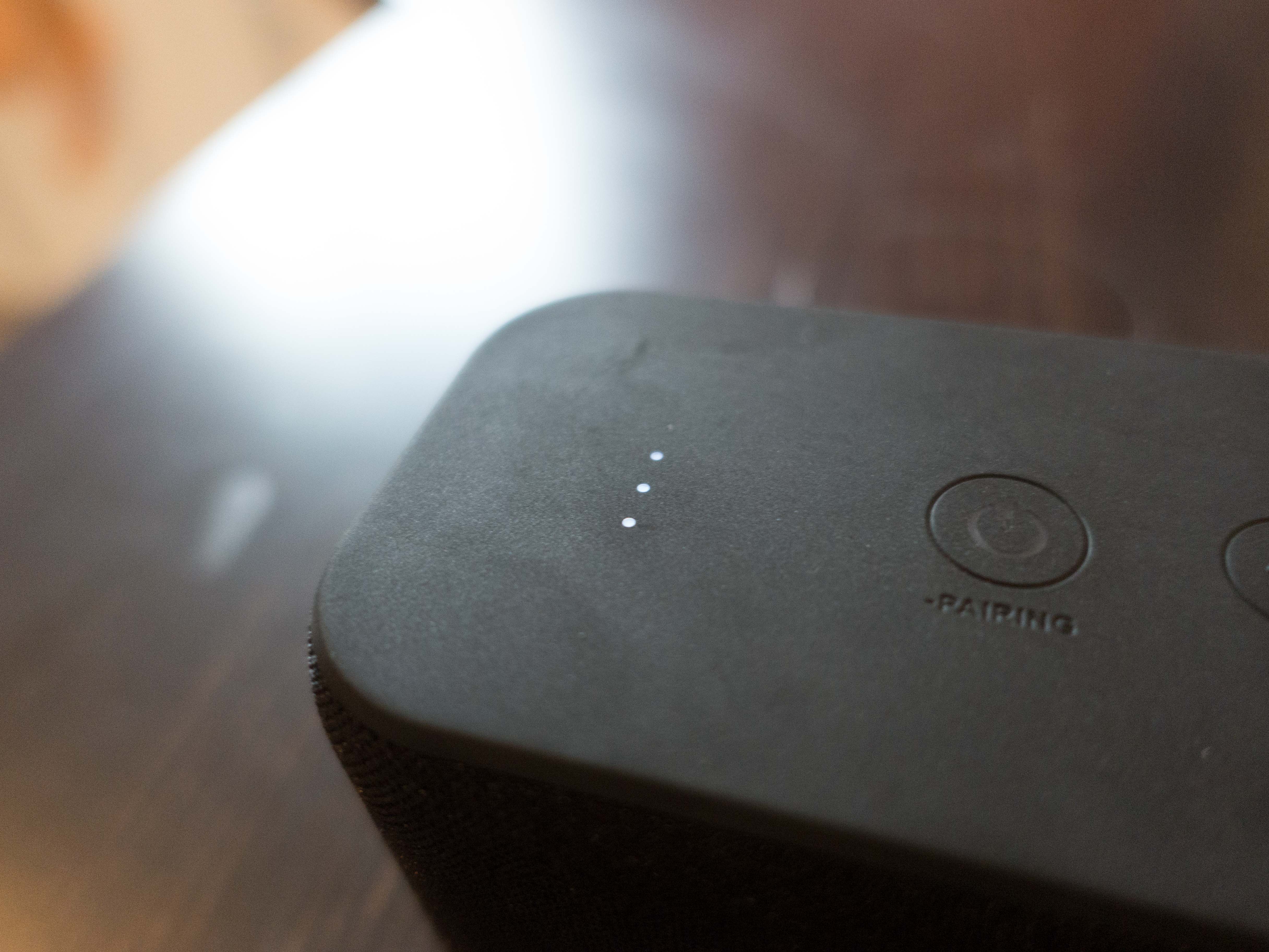 L’enceinte est légèrement plus grosse que ça petite soeur, et fait bien mieux « finie » en main. On a maintenant un tissu de protection (au lieu d’une grille métallique) devant les hauts parleurs, et le produit est magnifique je trouve. Il s’intègrera plus facilement dans une pièce à vivre.