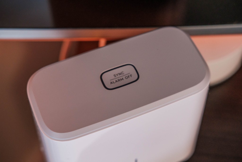 Un gros bouton sur la base permet de couper l’alarme au cas où celle ci se mettrait à sonner… le haut parleur de 100 dB étant lui aussi dissimulé à l’intérieur de la box. Personnellement je trouve le look de cette base plutôt passe partout, du coup, on pourrait imaginer la laisser quelque part dans l’entrée ou le salon de la maison sans que cela risque d’être vraiment trop moche…