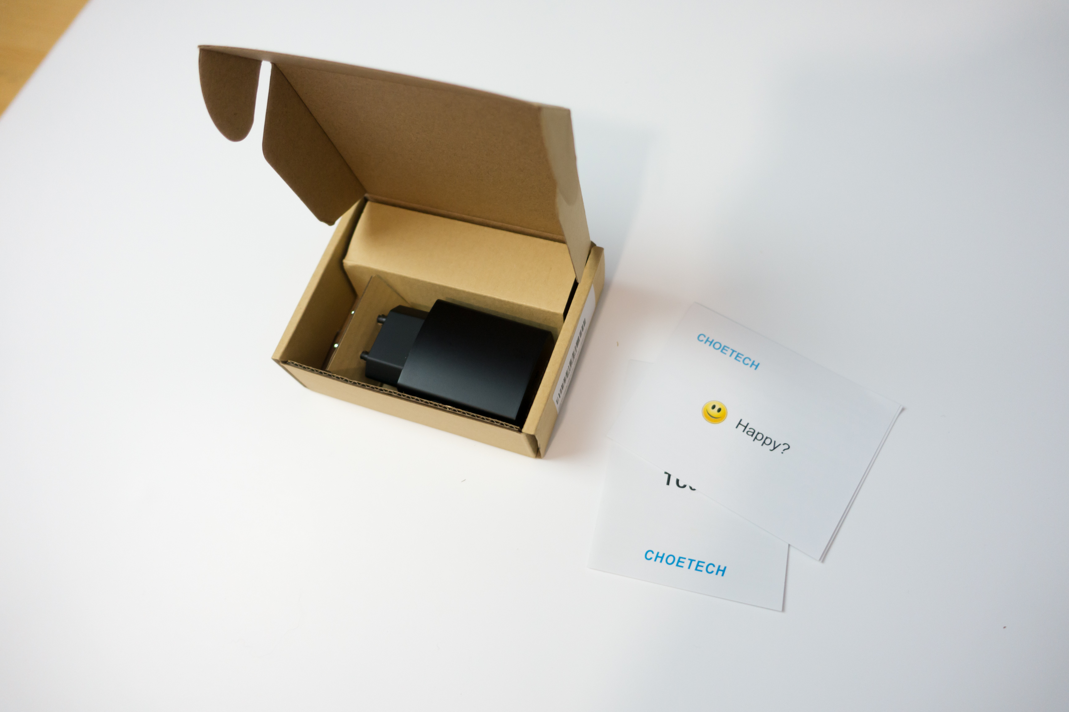 Tout d’abord je vous présente le chargeur USB-C , qui est livré dans une bonne petite boite qui rappellera les accessoires bien connus qui commence par un grand « A »… Le packaging est donc propre et compact, on a même droit à un petit mot de remerciement dans la boite. Le chargeur se présente sous une couleur noire légèrement brillante mais qui ne prend pas du tout les traces de doigt. Le plastique est solide et le chargeur est plutôt léger.
