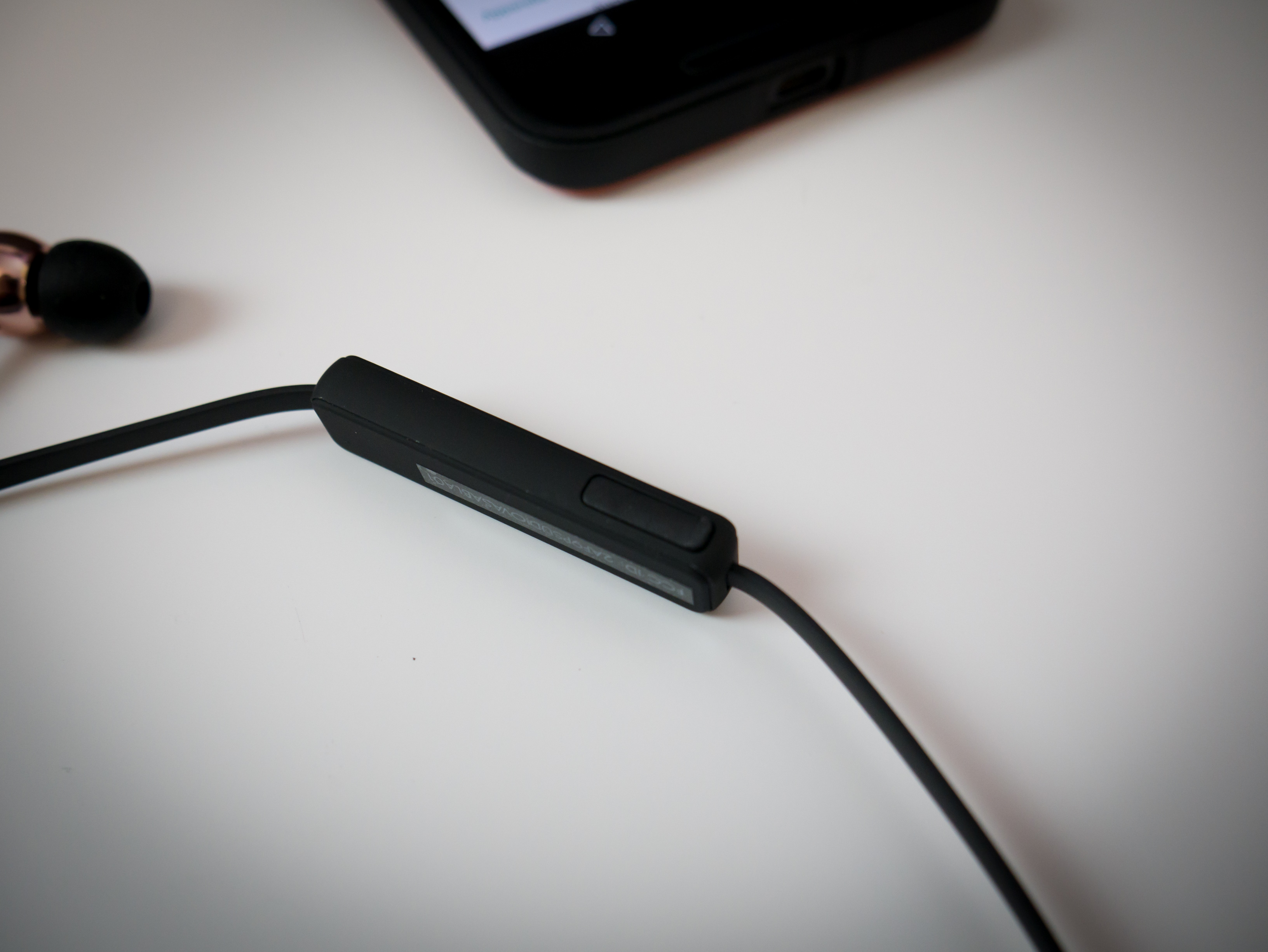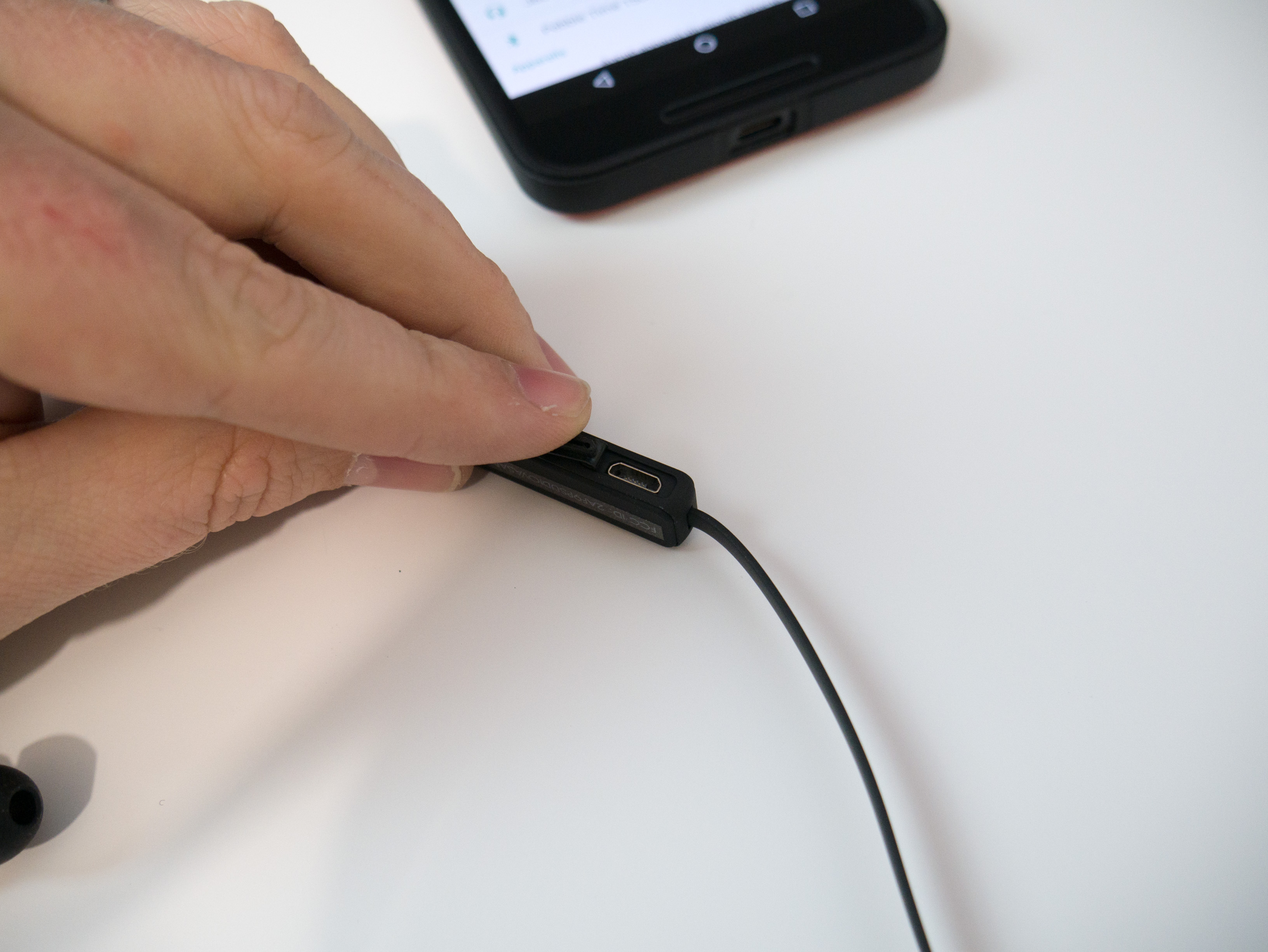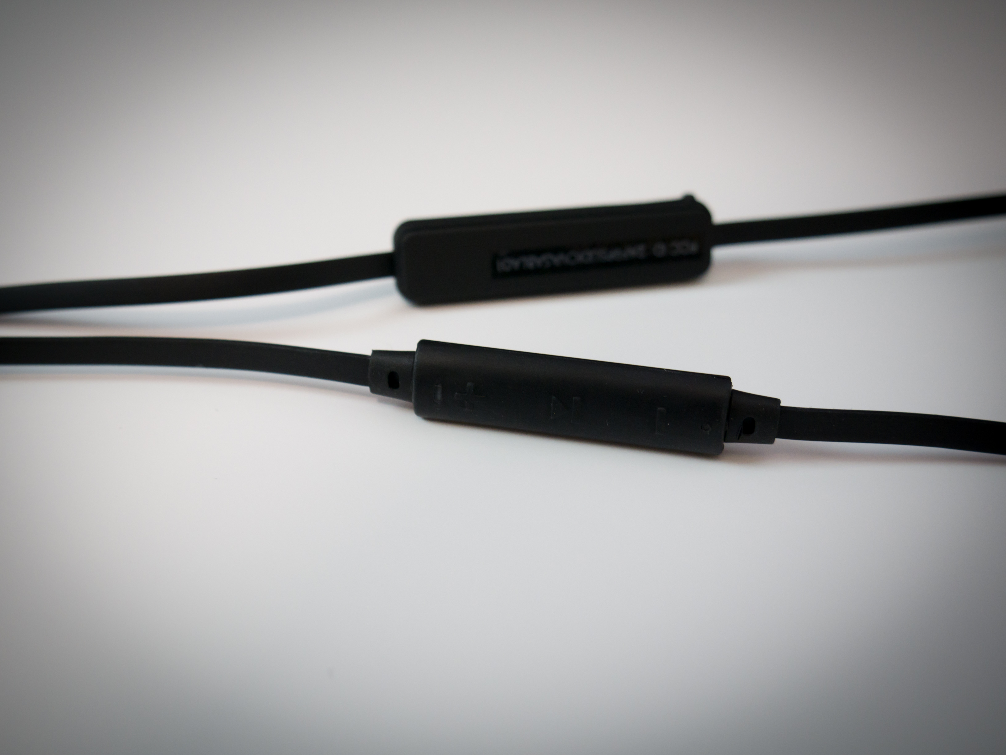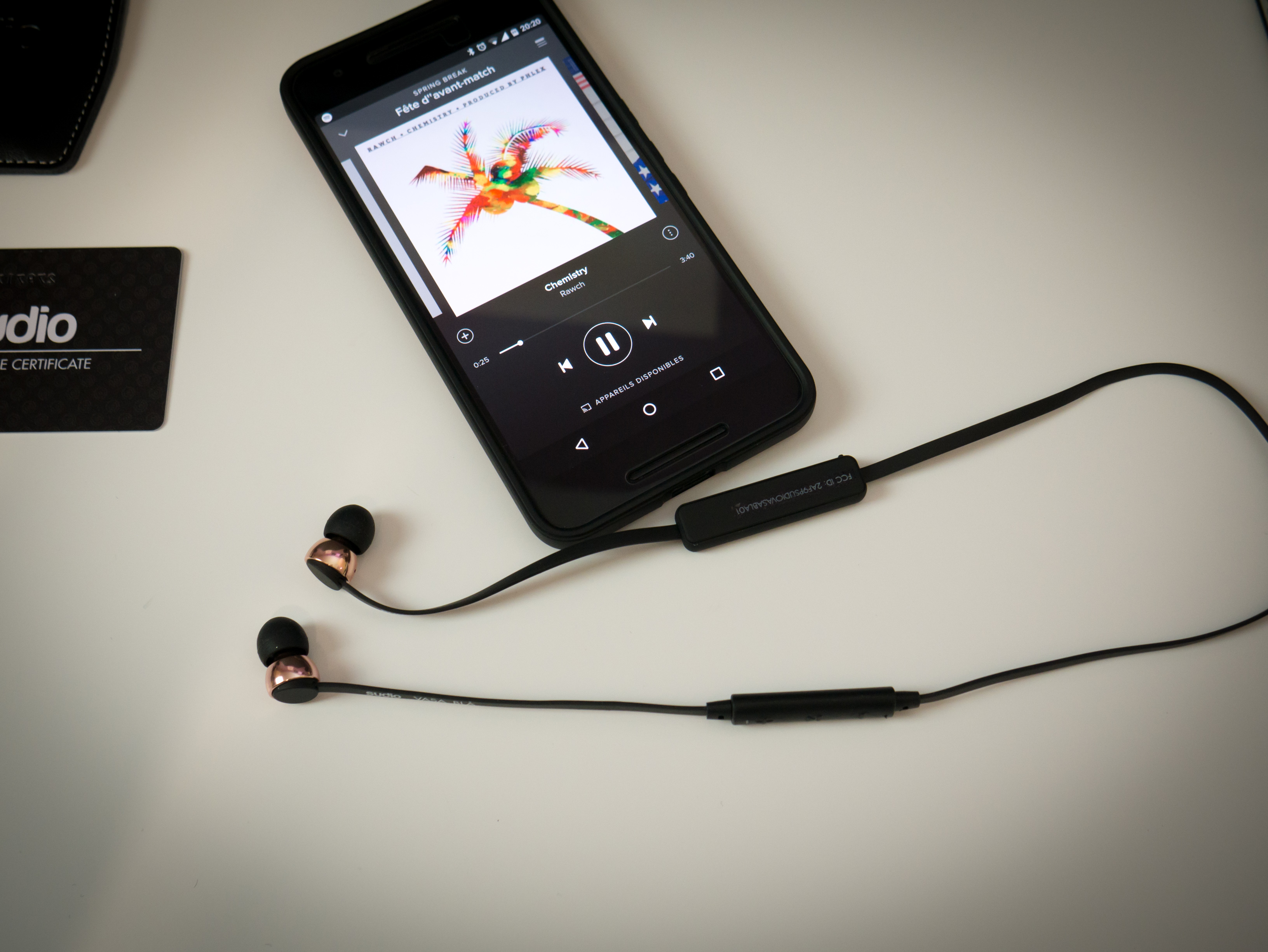 On commence par déballer le casque ; on découvre donc un casque qui est en fait quasiment qu’un long cable plat de 50cm environ, avec les 2 écouteurs aux extrémités et 2 petits boitiers intégrés à chaque tiers de la longueur ; ces boitiers sont en fait la télécommande (+microphone & récepteur bluetooth 4.1), et la batterie.
