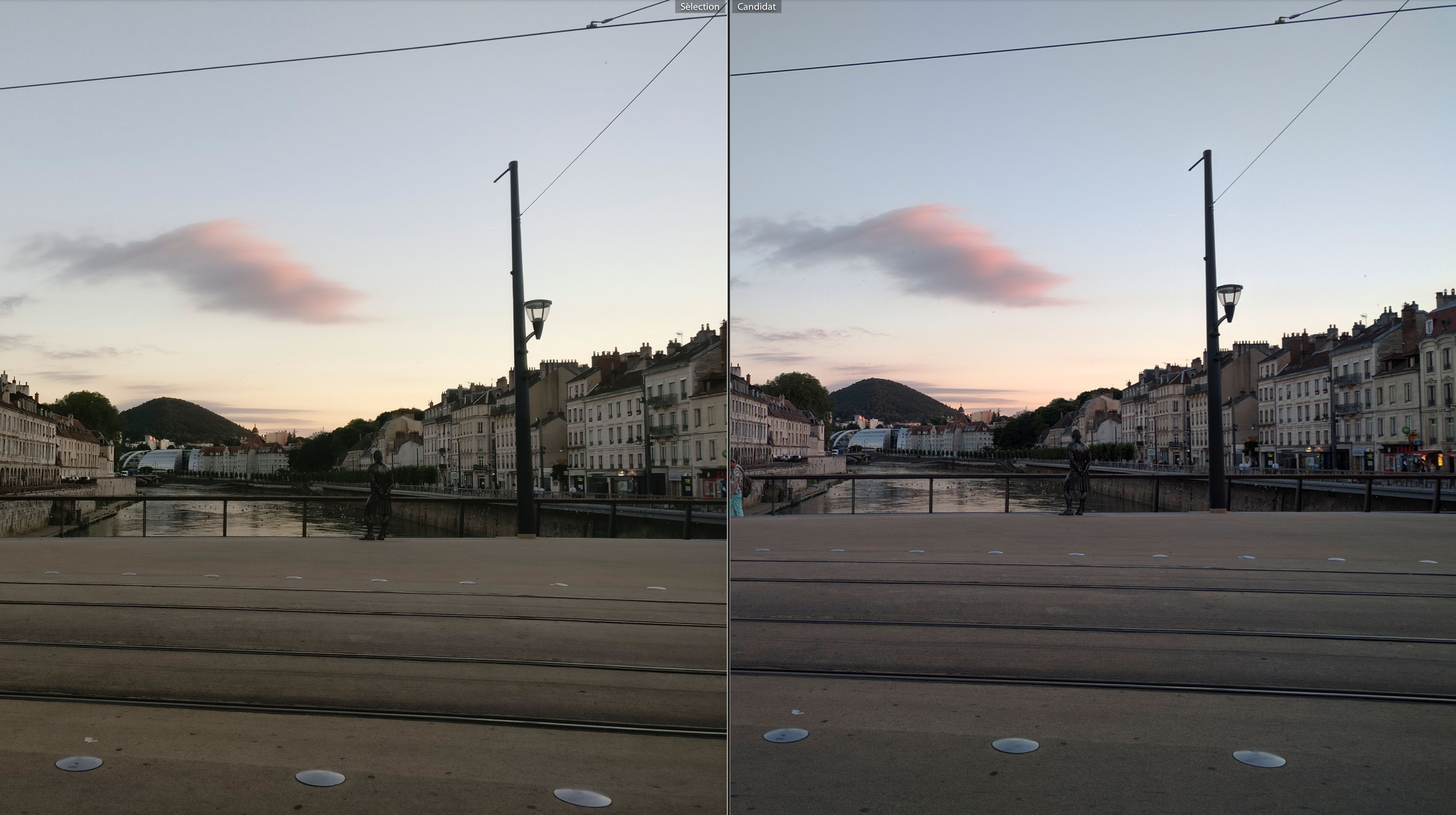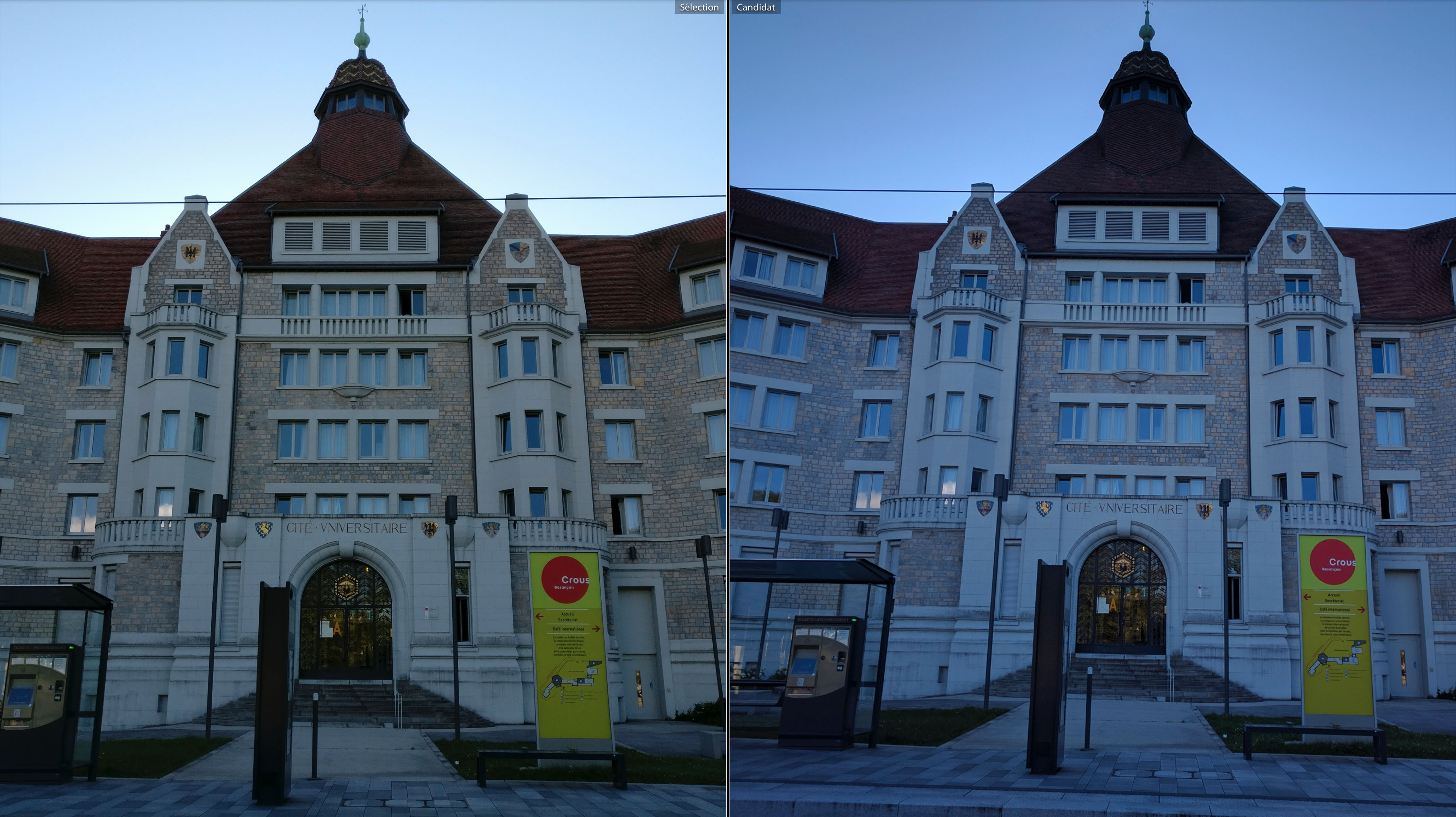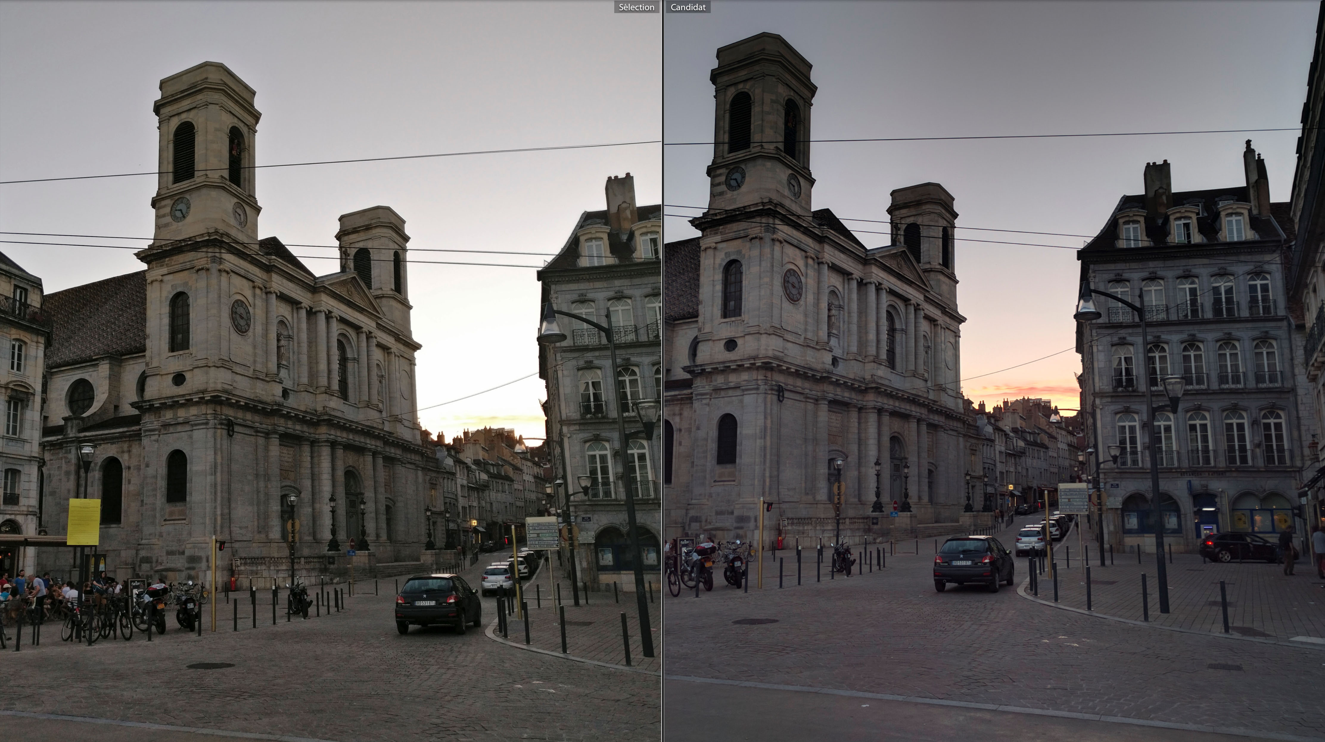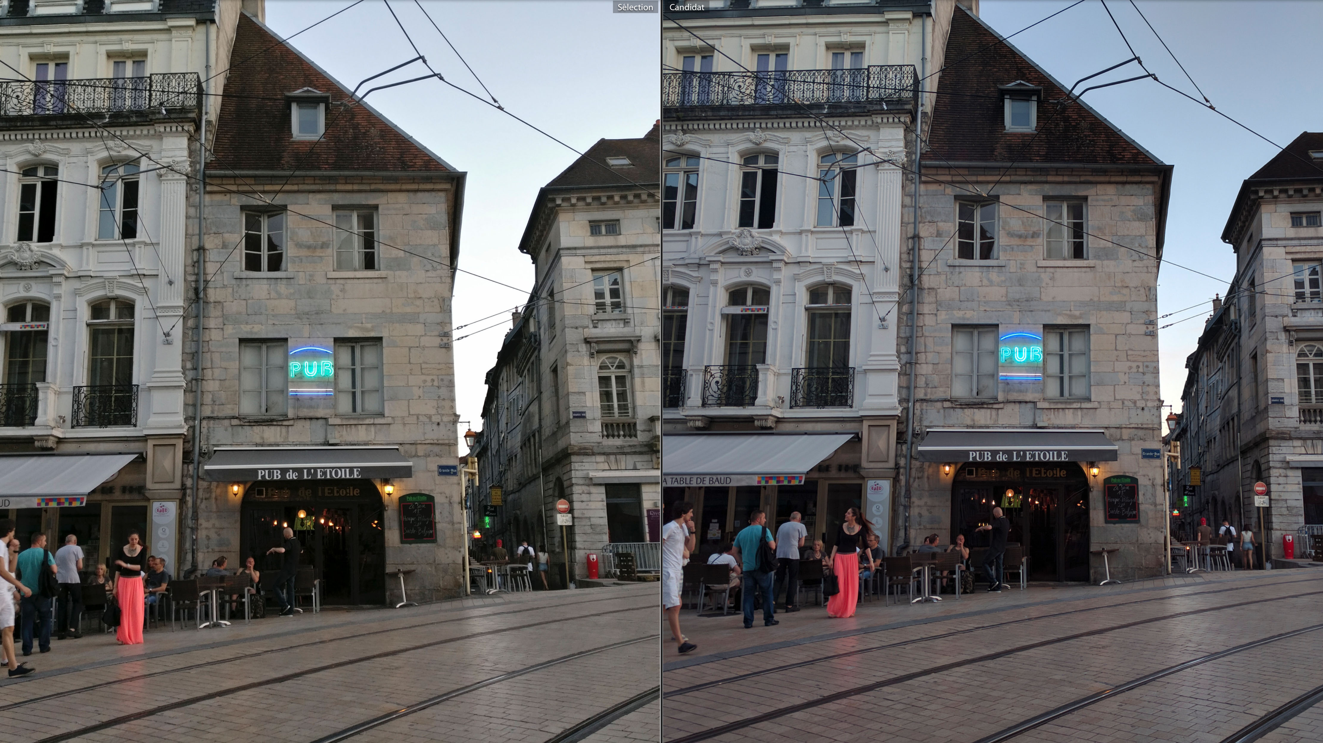 Une soirée passée à Besançon m’a permis de prendre ces clichés ; ils ont été pris en fin d’après midi & en soirée, du coup j’ai des clichés en plein soleil, en contre jour ou par faible luminosité. Dans toutes les photos suivantes, vous trouverez une version OnePlus 3 à gauche et une version Nexus 6P à droite ; l’ensemble des photos ont été prises avec le HDR auto.