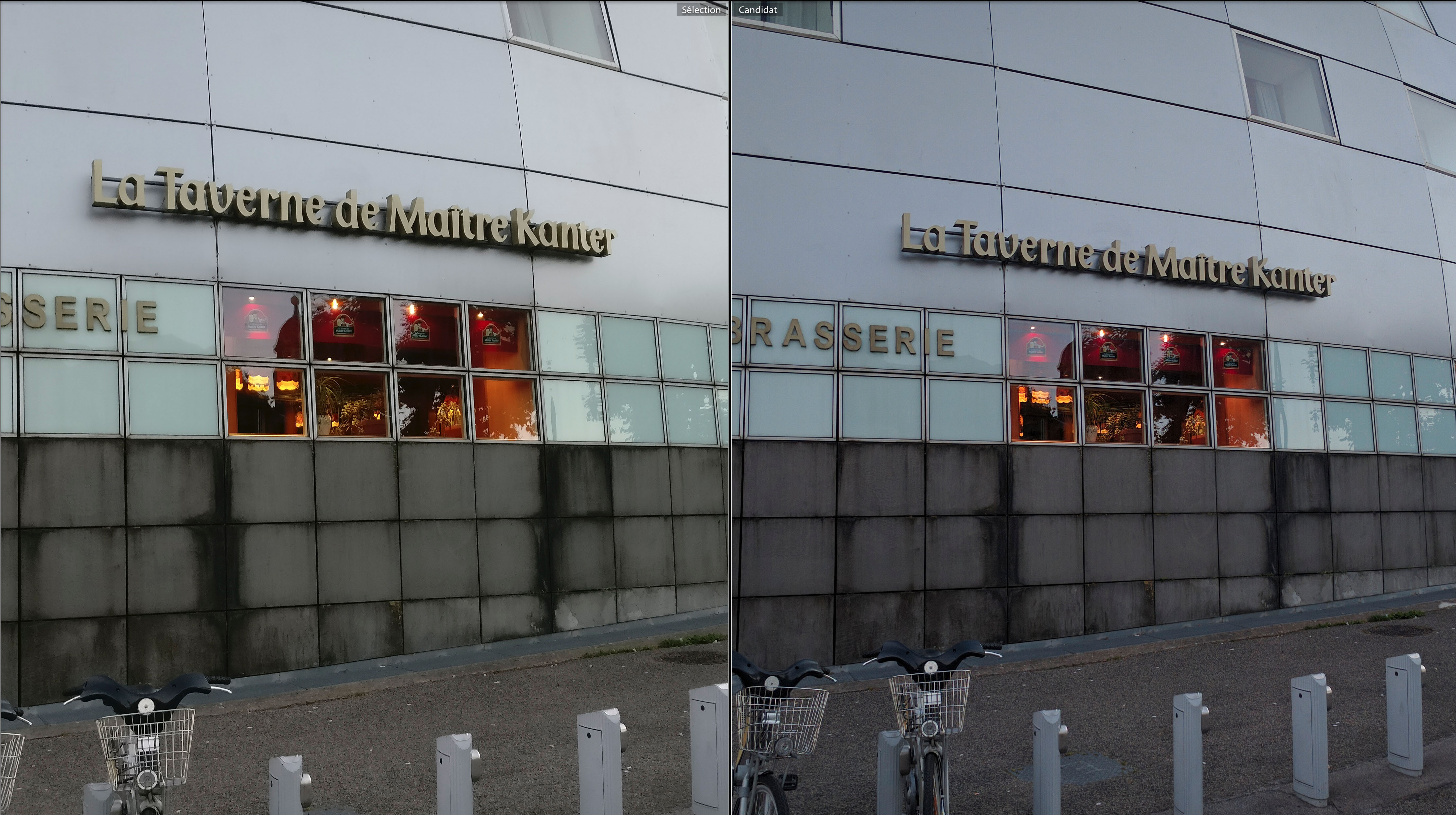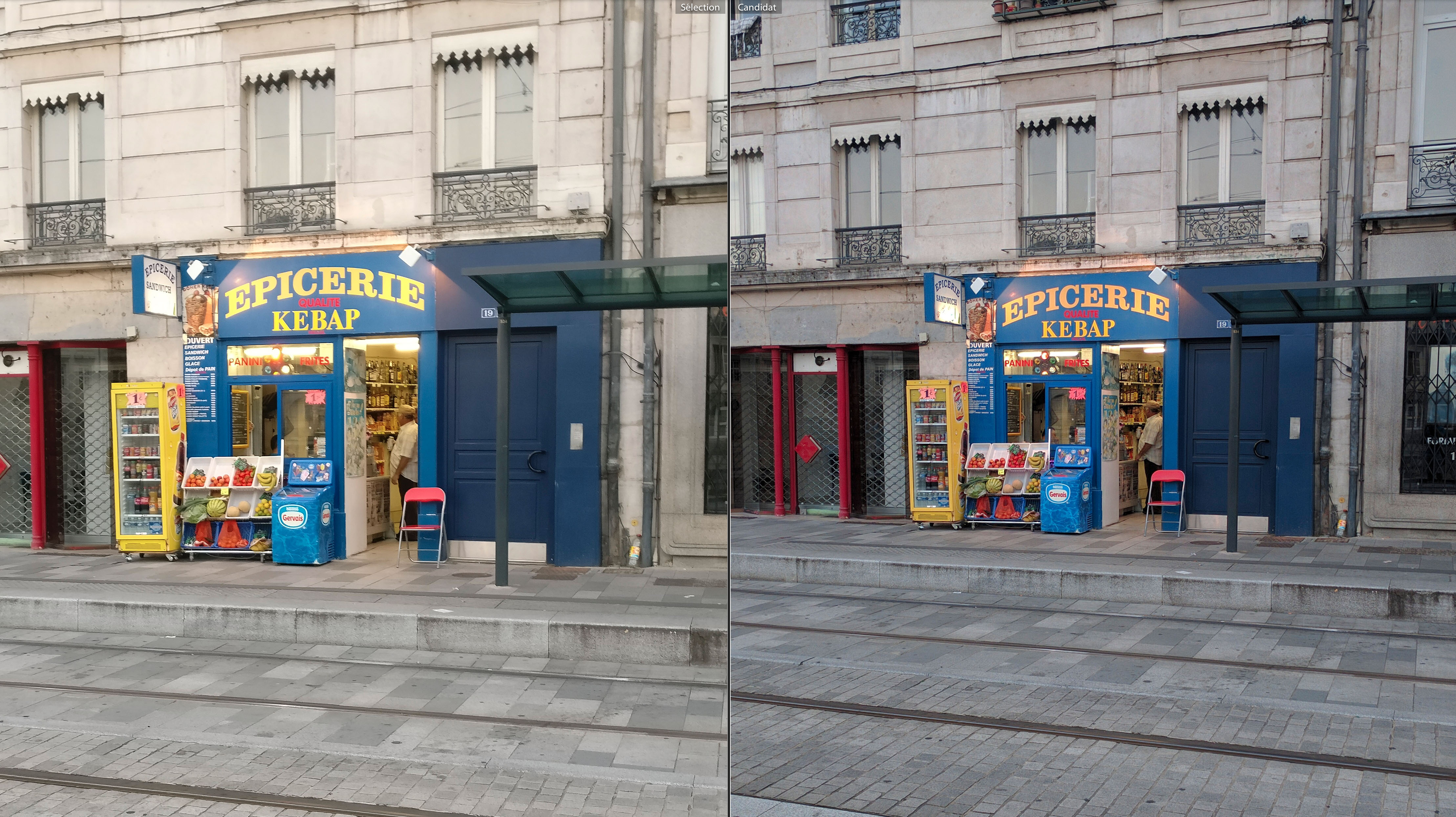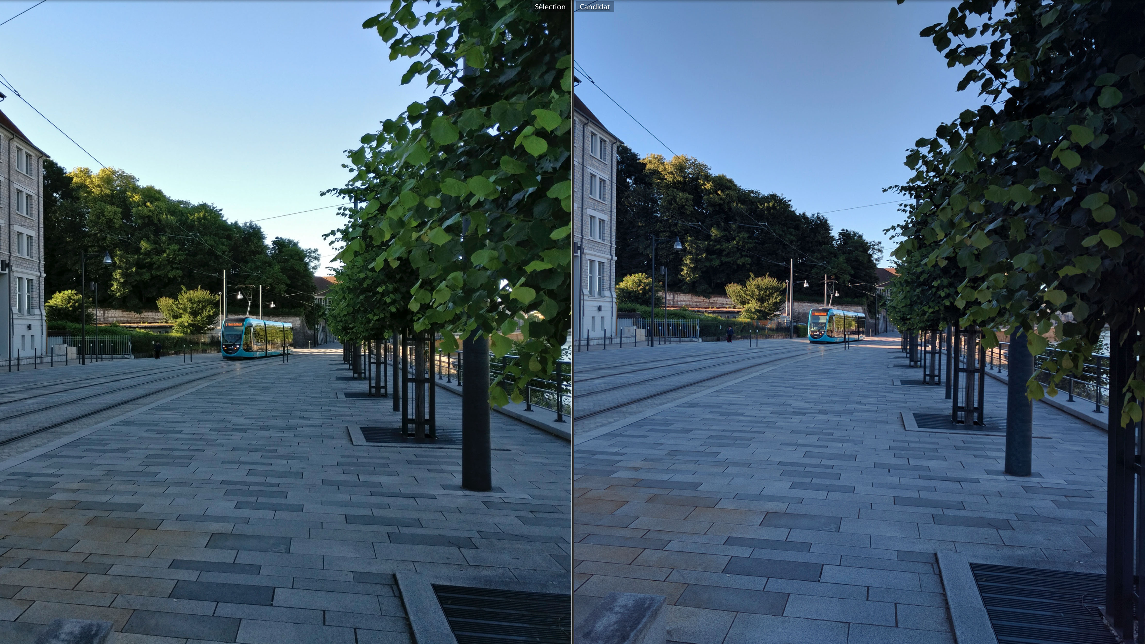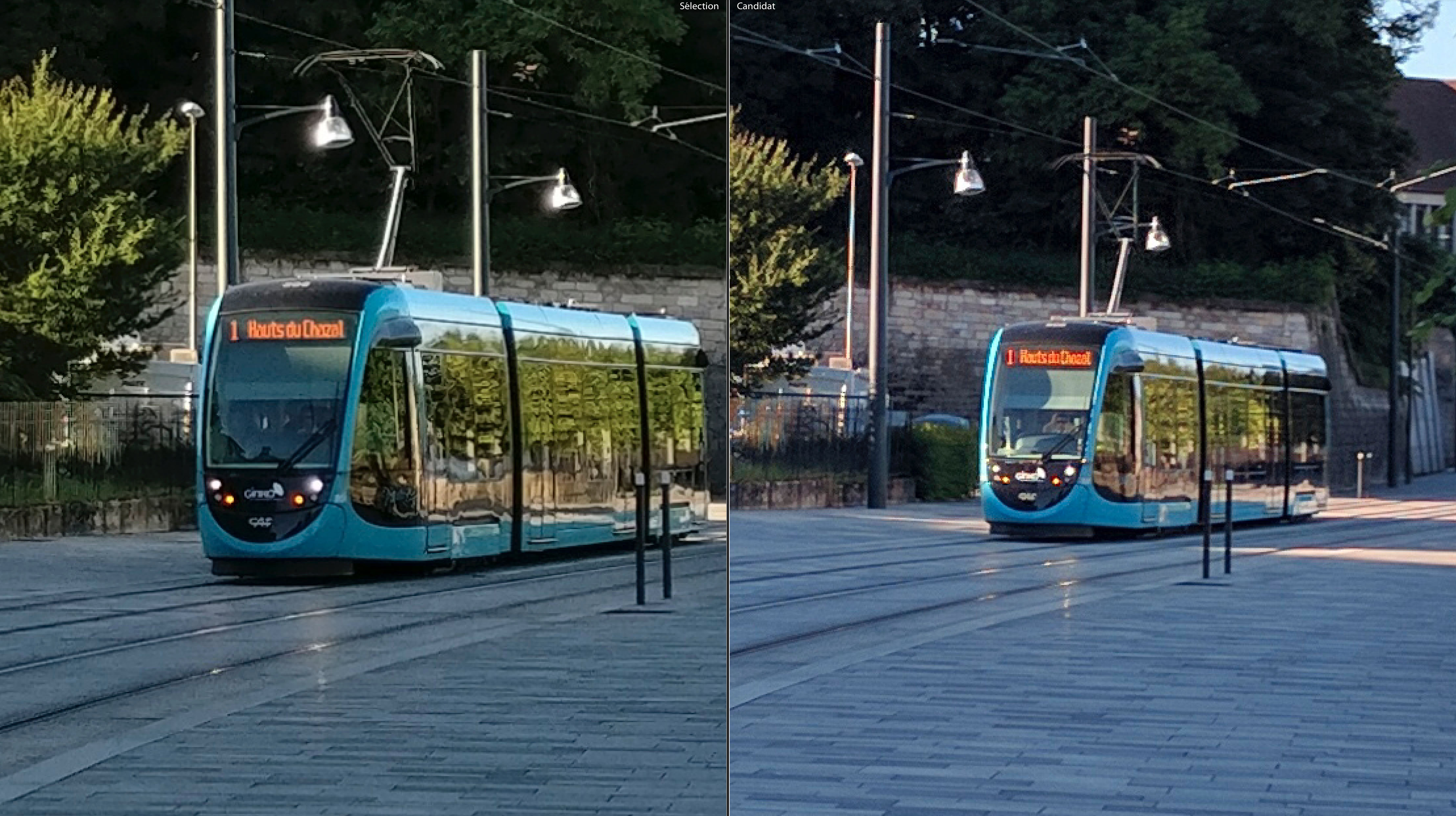 Sur la photo suivante, une image prise dans l’ombre de cette fin d’après midi, on retrouve toujours un rendu excellent sur les 2 appareils. Le zoom montre un niveau de détail un peu plus intéressant sur le OnePlus 3, nous arrivons à lire un peu mieux l’inscription sur le panneau du tram. Par contre, un effet lumineux est visible sur la photo du OnePlus 3 (au niveau des lampadaires), seul petit détail que je pourrai reprocher à l’image.