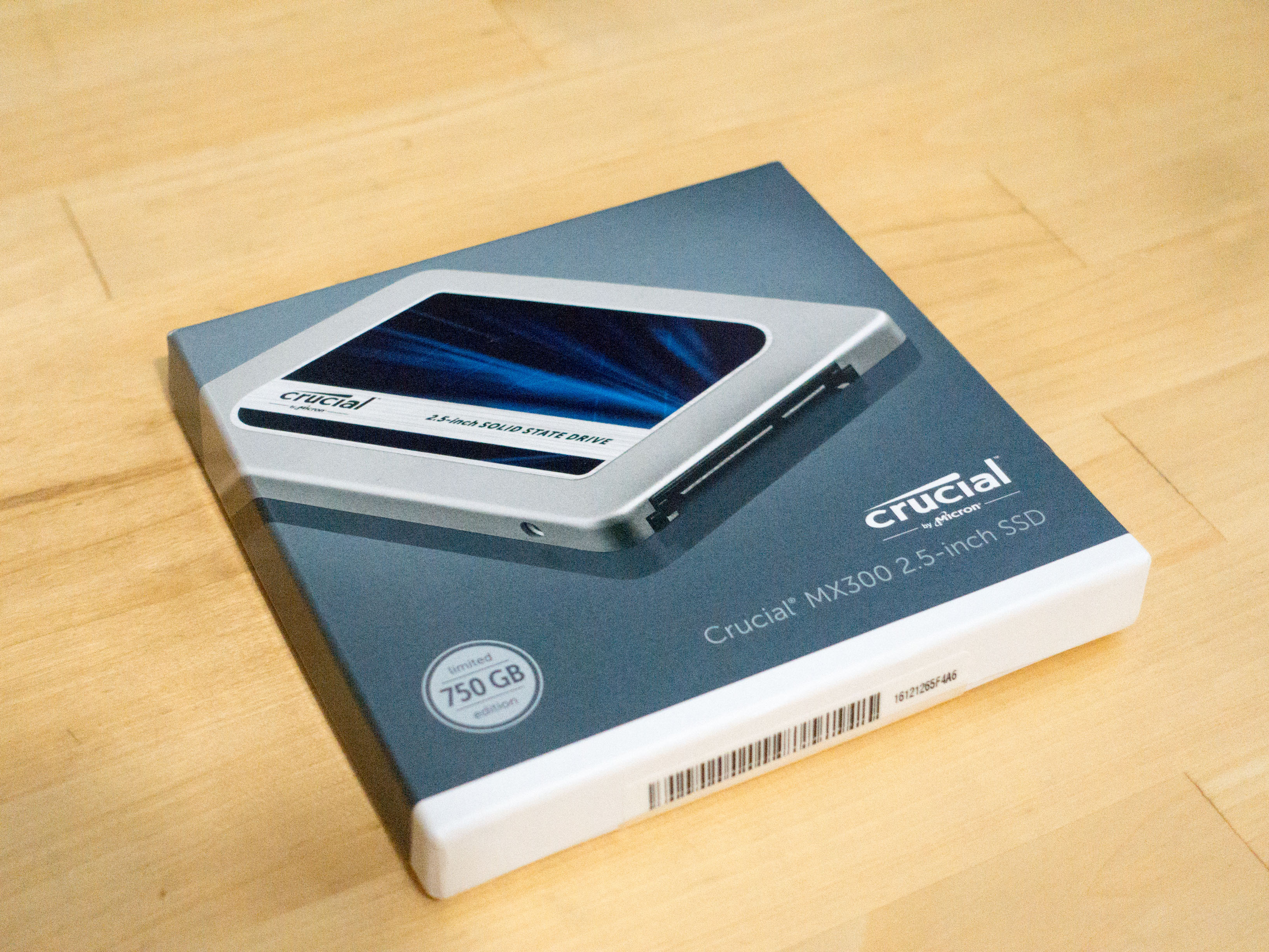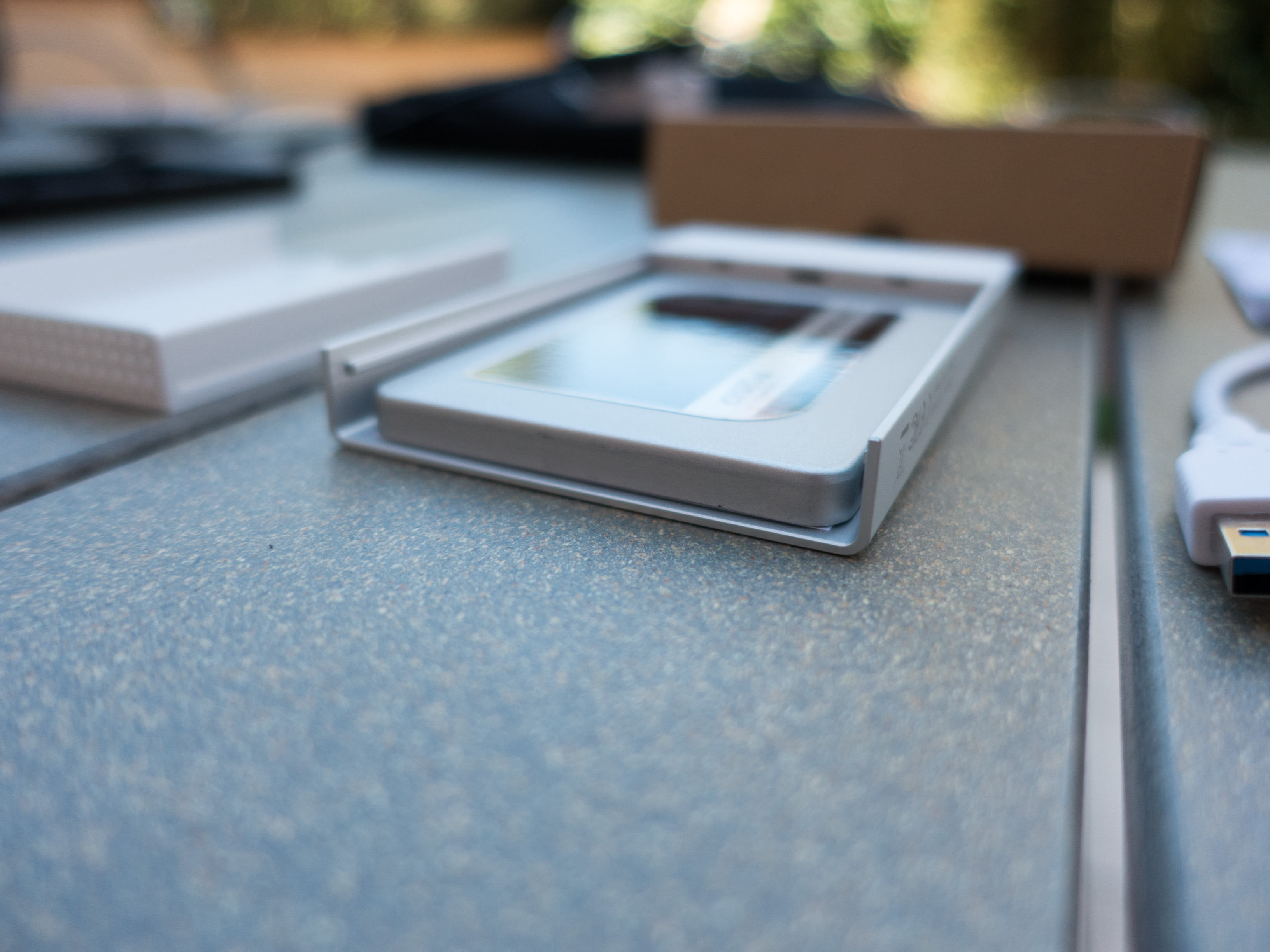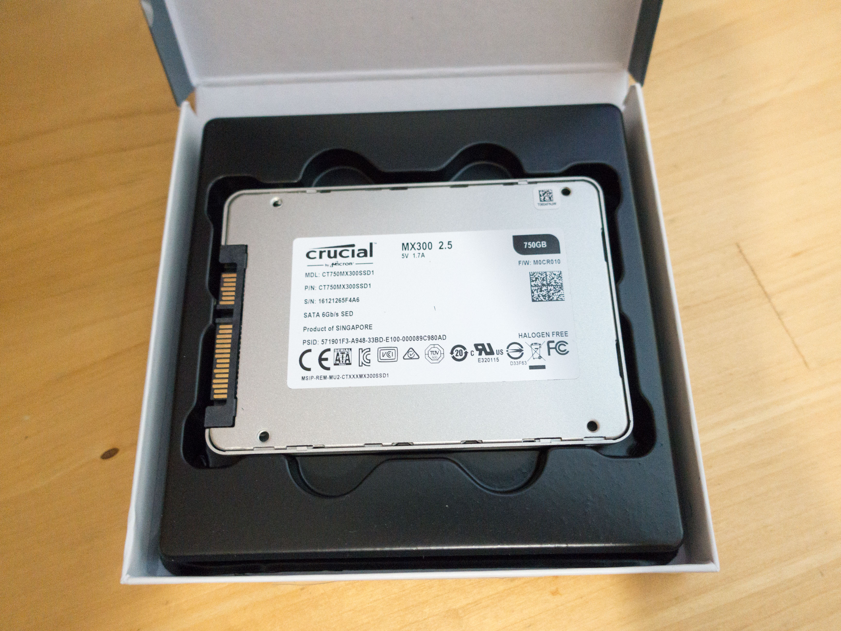 Ma première action fut de trouver un disque dur SSD en 2.5 pouces pas trop cher, et un boitier USB type C pour l’intégré. Mon choix s’est tourné vers le nouveau Crucial MX300 en 750 Go et un boitier Aukey USB3.0 muni d’un port USB C plutôt mignon dans sa robe noire.