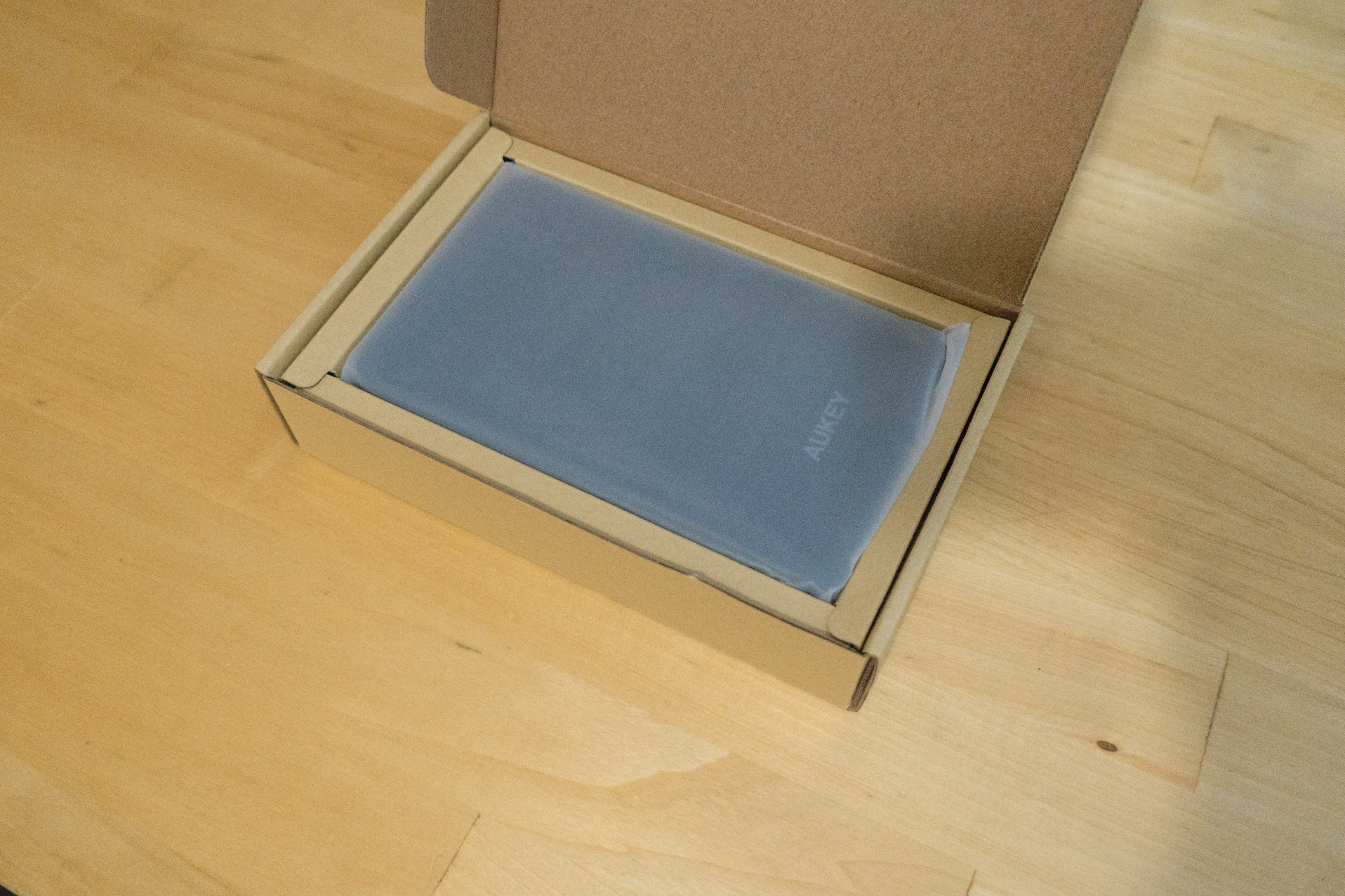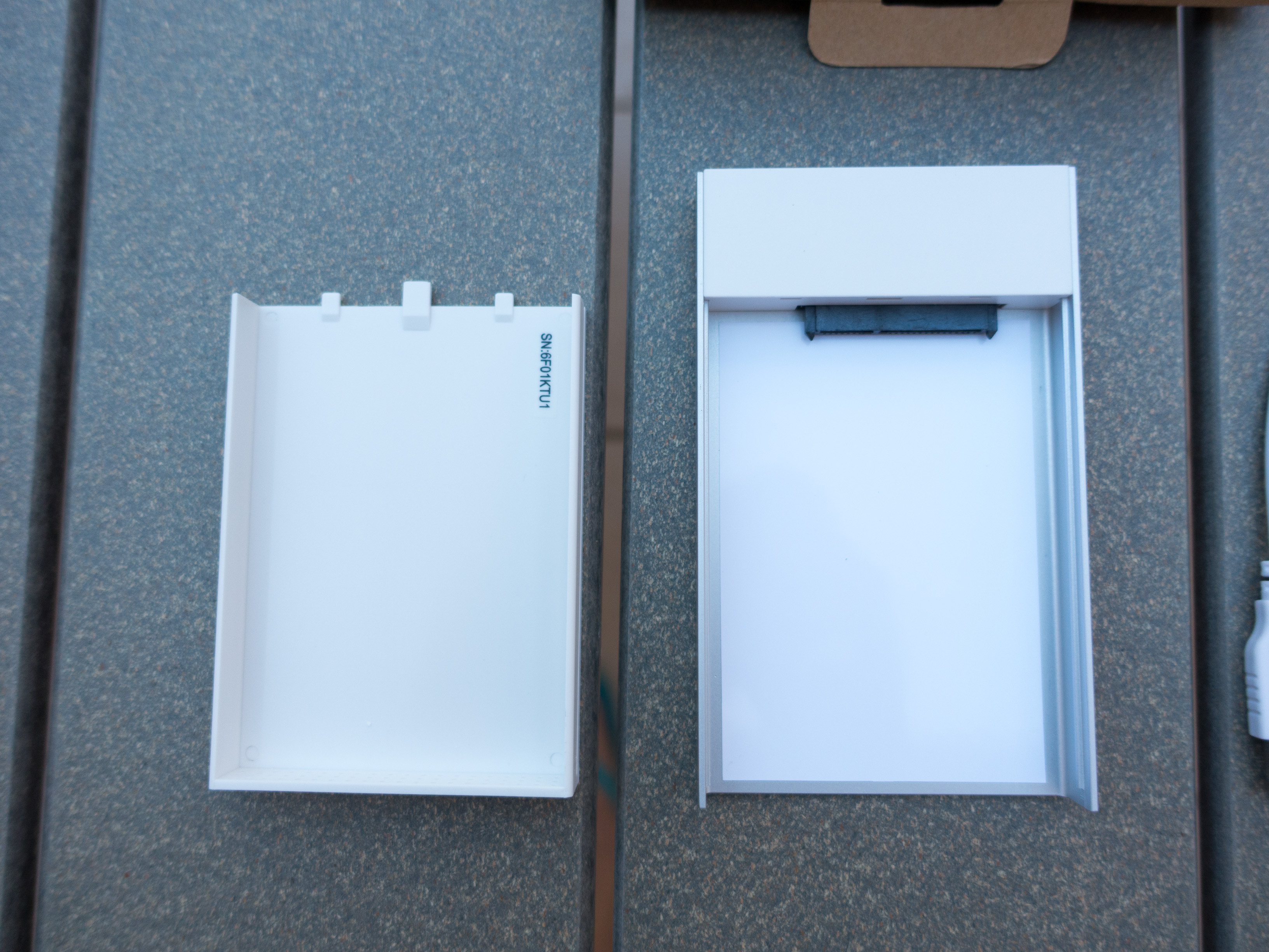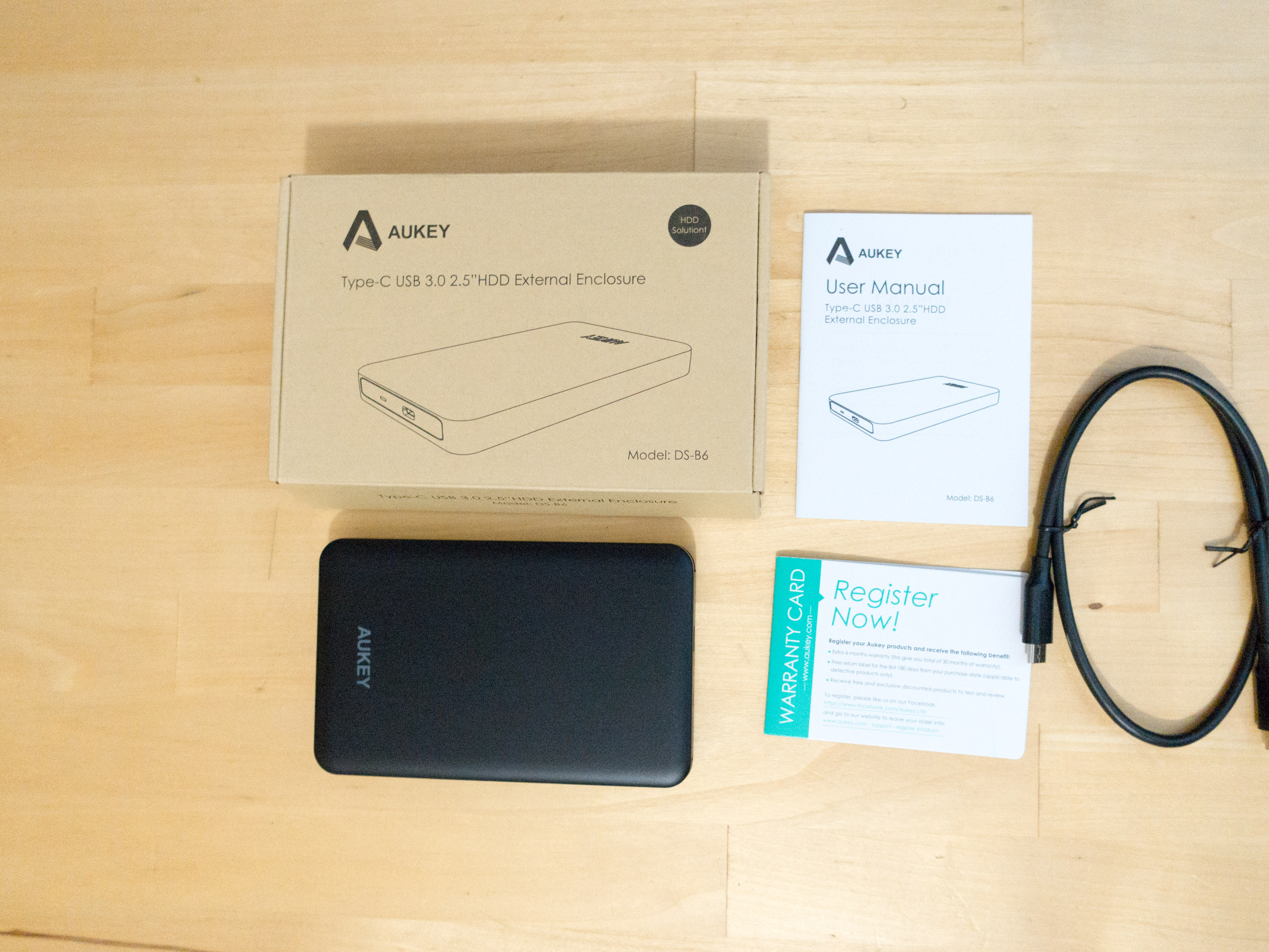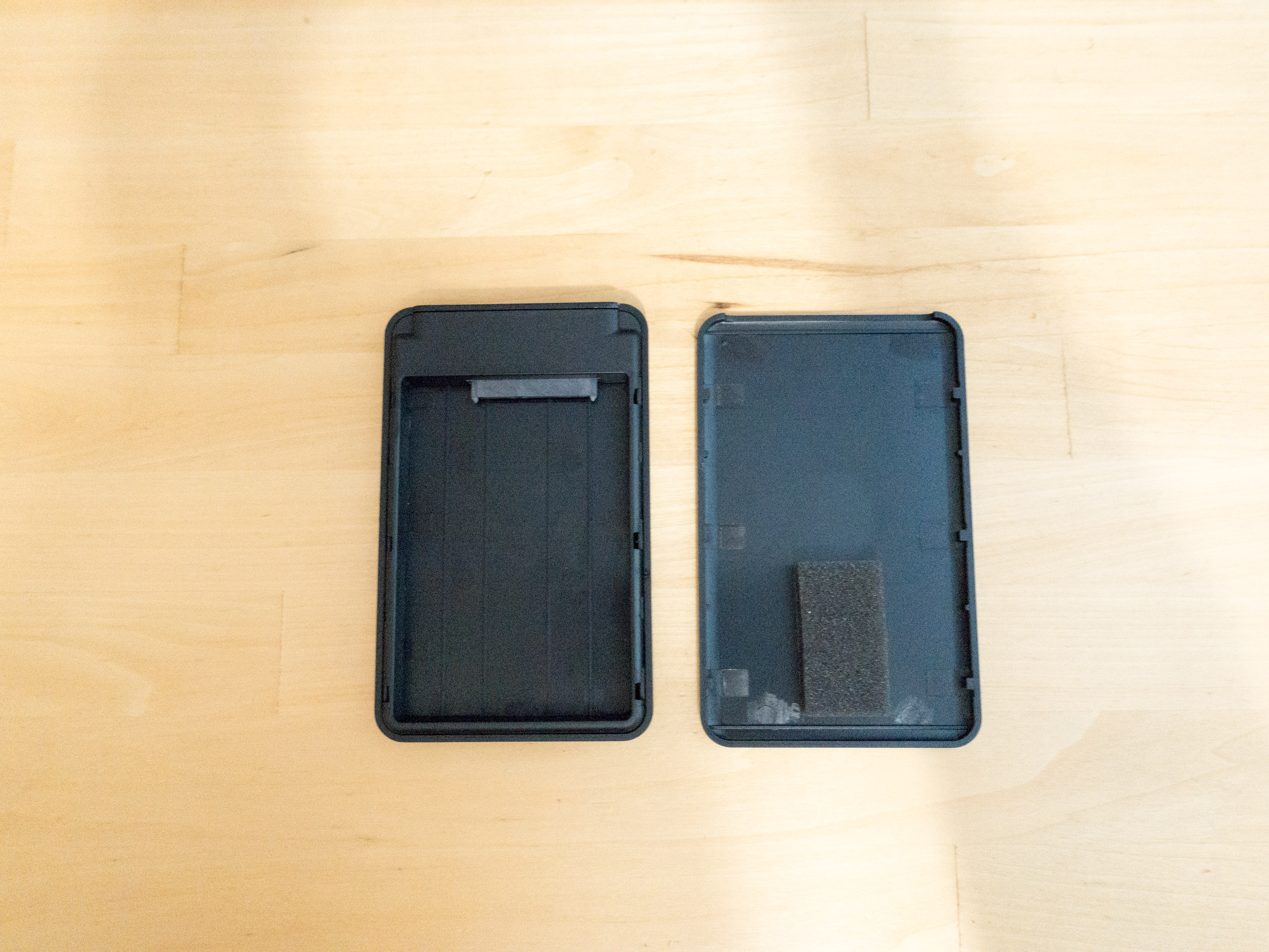 Le boitier Aukey est lui livré dans un emballage cartonné propre à la marque et comporte un cable USB type C. Le boitier s’ouvre en faisant coulisser le couvercle, et un petit patin de mousse permet de caler correctement le disque, quelque soit son épaisseur.
