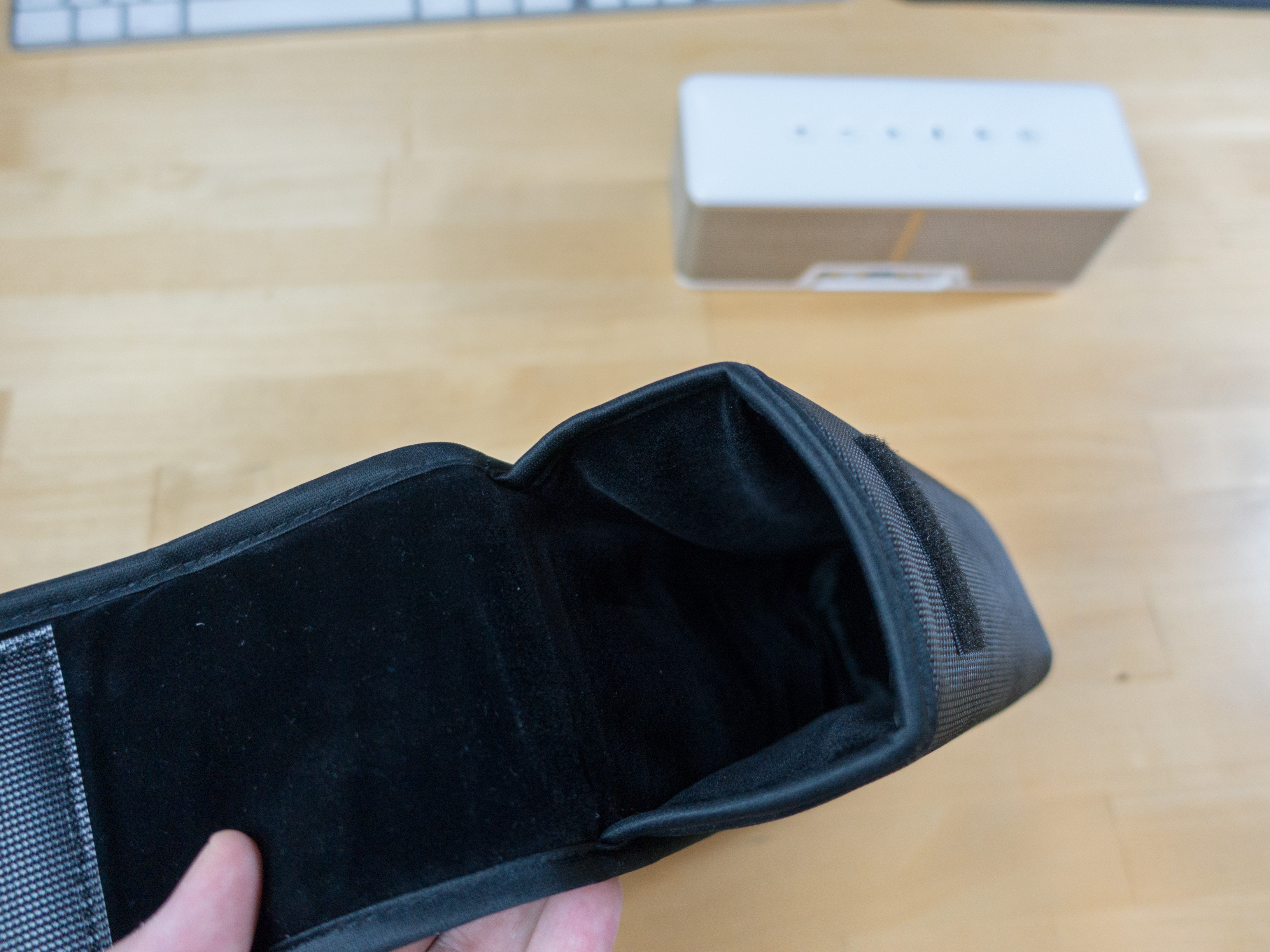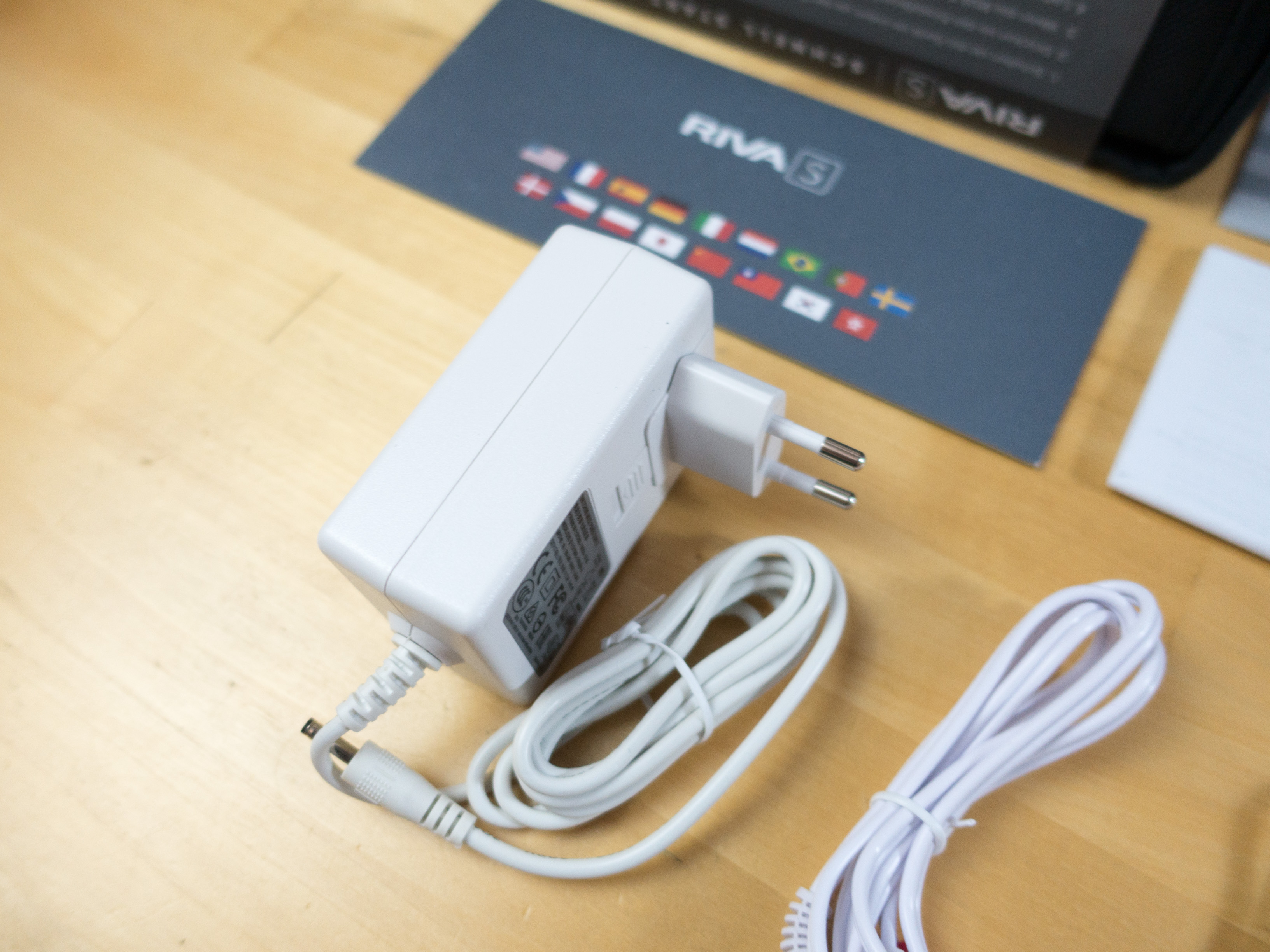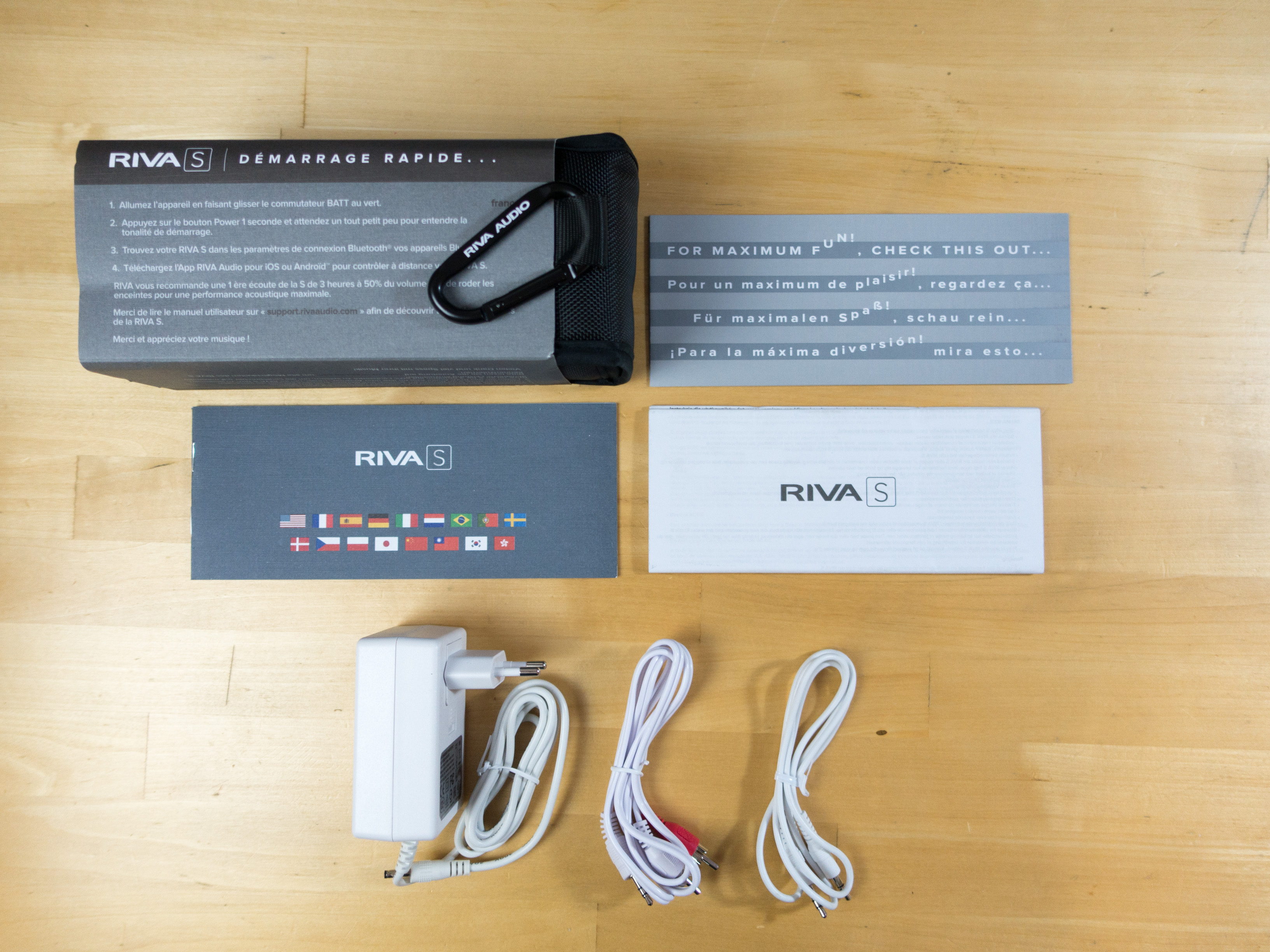 A l’intérieur, Riva nous a gâté et propose un kit vraiment complet : housse de protection (avec crochet) de très bonne qualité, cable audio ( simple et RCA), chargeur secteur propriétaire (grosse déception que ce ne soit pas USB), et différents standards de prises électriques (US, etc…).