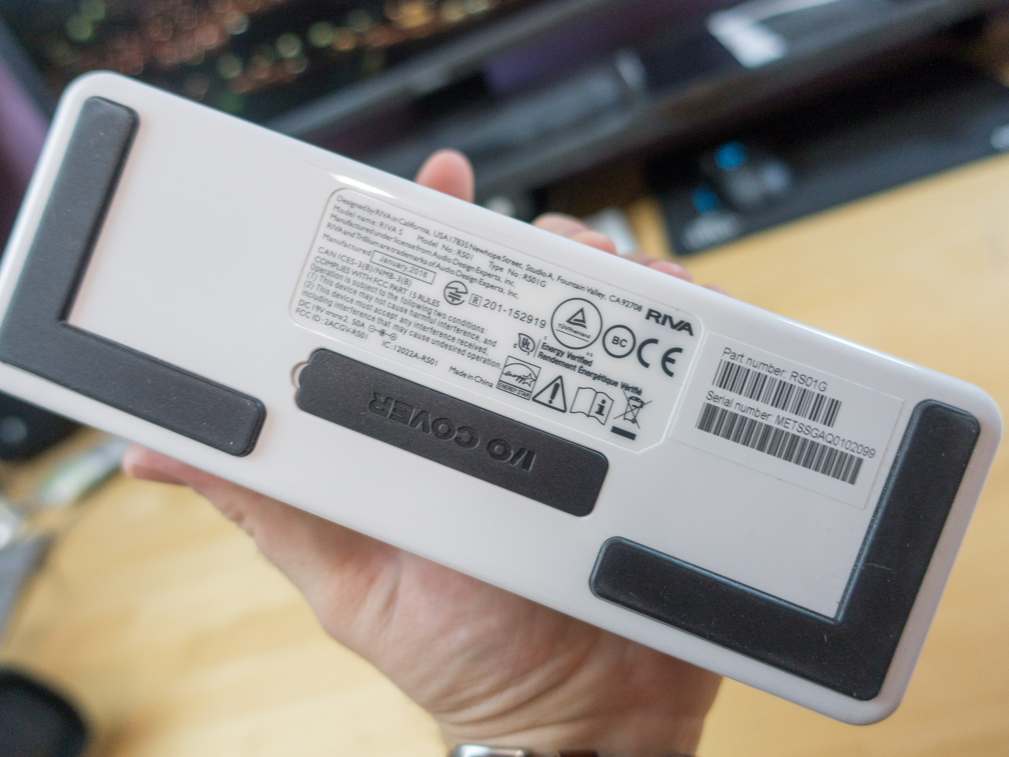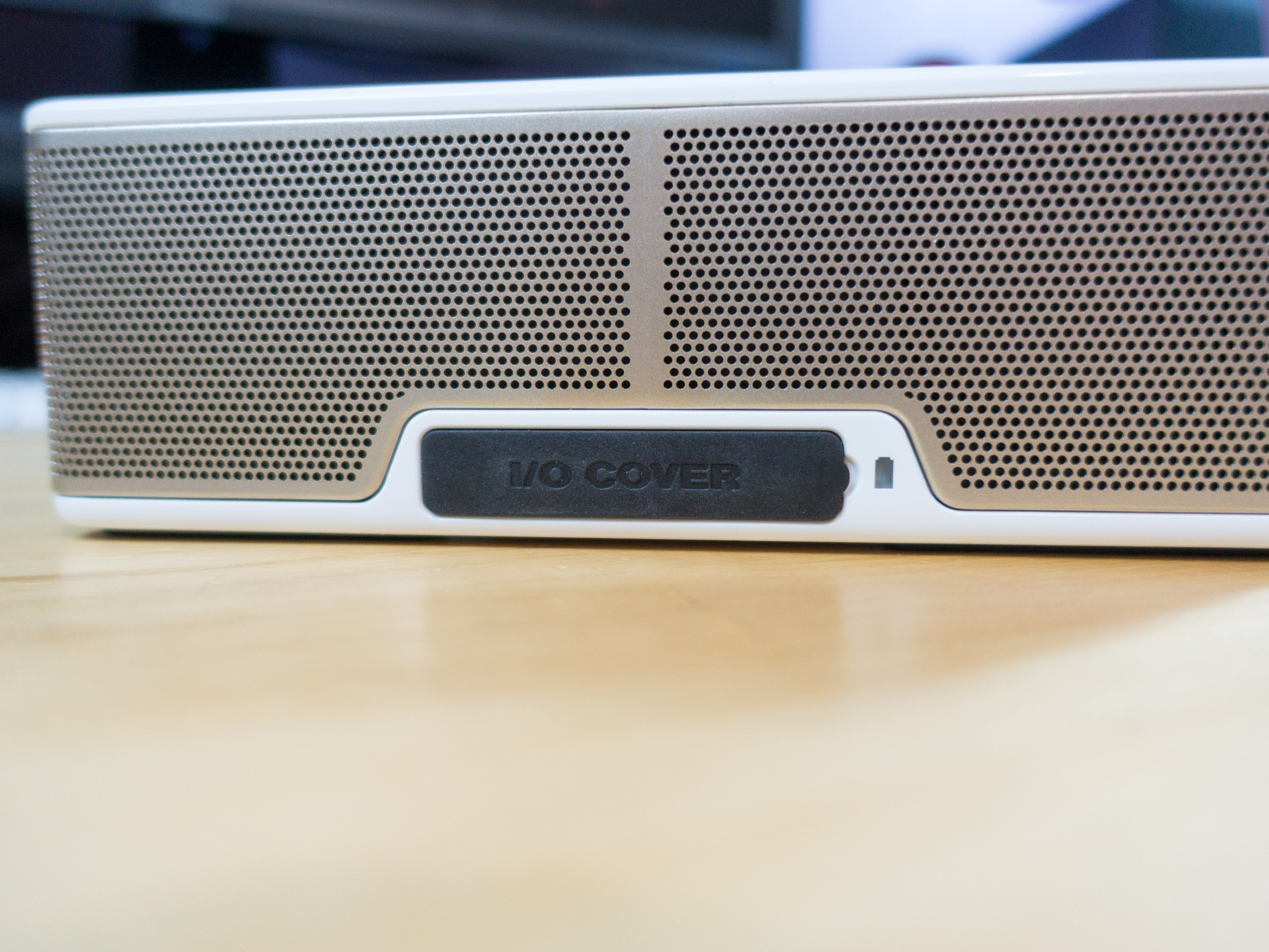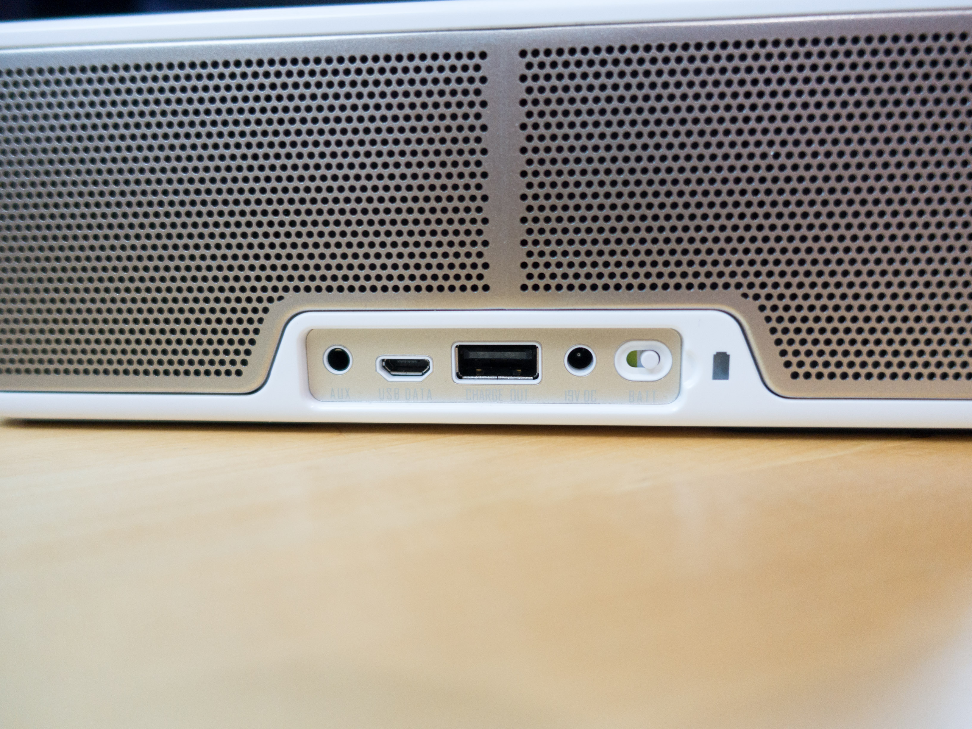 On découvre ensuite l’enceinte bluetooth Riva S et sa finition blanc/or (existe aussi en blanche, et en noir). J’ai choisi cette couleur afin de sortir un peu de l’ordinaire de mes enceintes low cost noires et de mes enceintes premiums blanches. Ça change et je trouve que ce doré est discret et classe. L’enceinte est en plastique blanc laqué sur le dessus & le dessus, et en métal doré sur les côtés. Les finitions sont excellentes je trouve. Sur l’arrière, un petit panneau comporte différentes prises (on y reviendra plus tard) qui peuvent être protégée par un petit morceau de caoutchouc qui peut aussi être stocké sur la face inférieure. Malin.