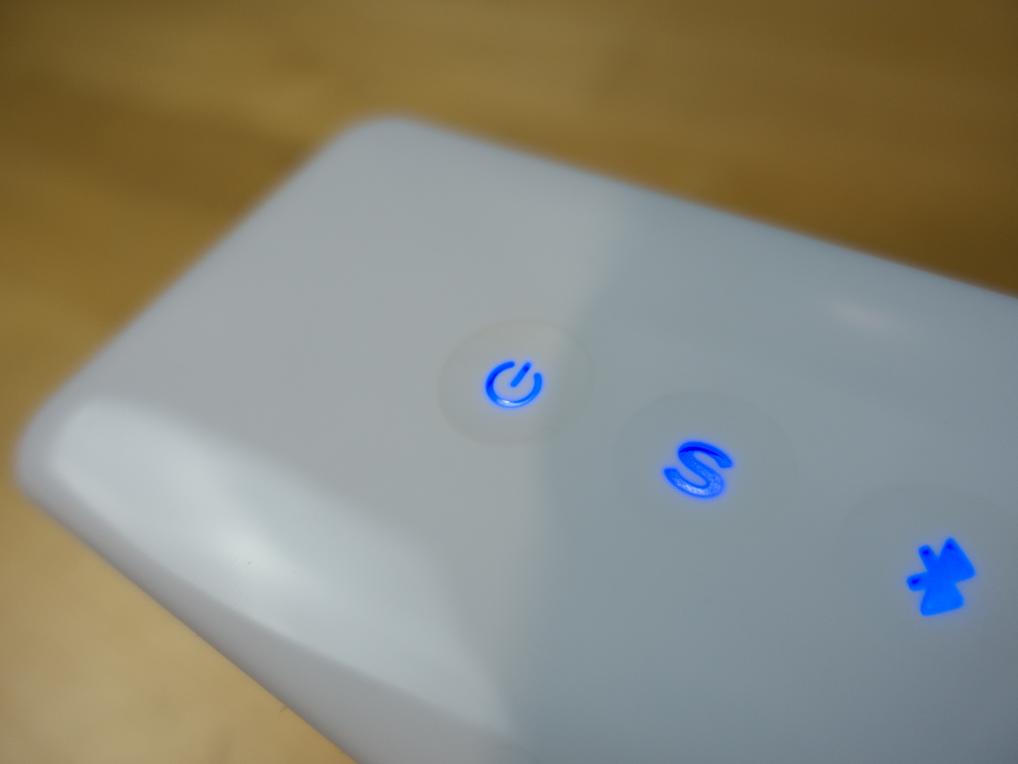 Sur le dessus de l’enceinte, on découvre des touches tactiles, qui s’éclairent en bleu. Ce bleu aurait pu être légèrement plus travaillé, l’éclairage n’étant pas uniforme sur l’ensemble des logos (déformation professionnelle, peut être que j’en demande trop 🙂 ). Je suis moyennement fan des touches tactile ; c’est solide, mais on sait jamais si l’enceinte a pris en compte ou non l’appui.