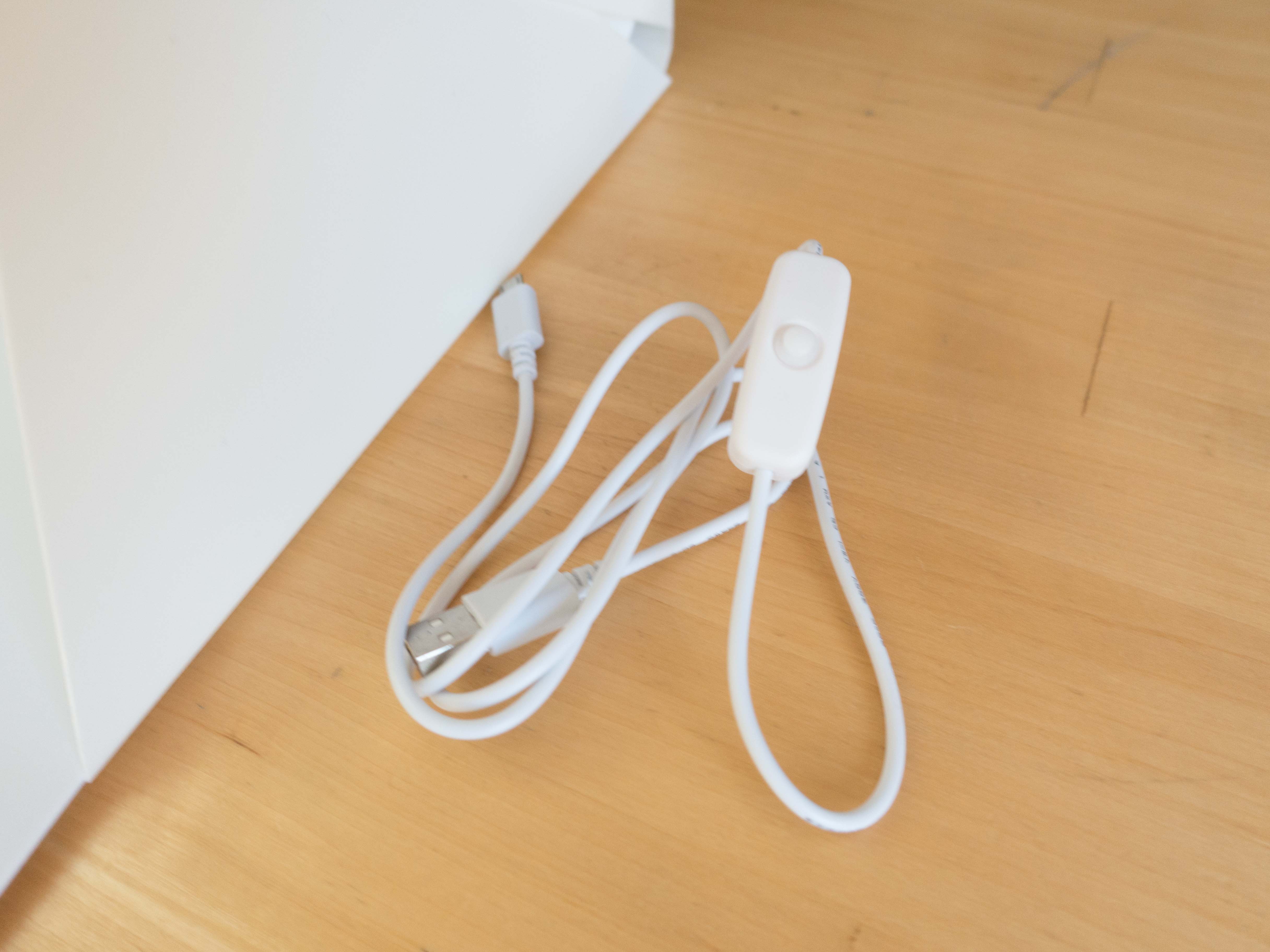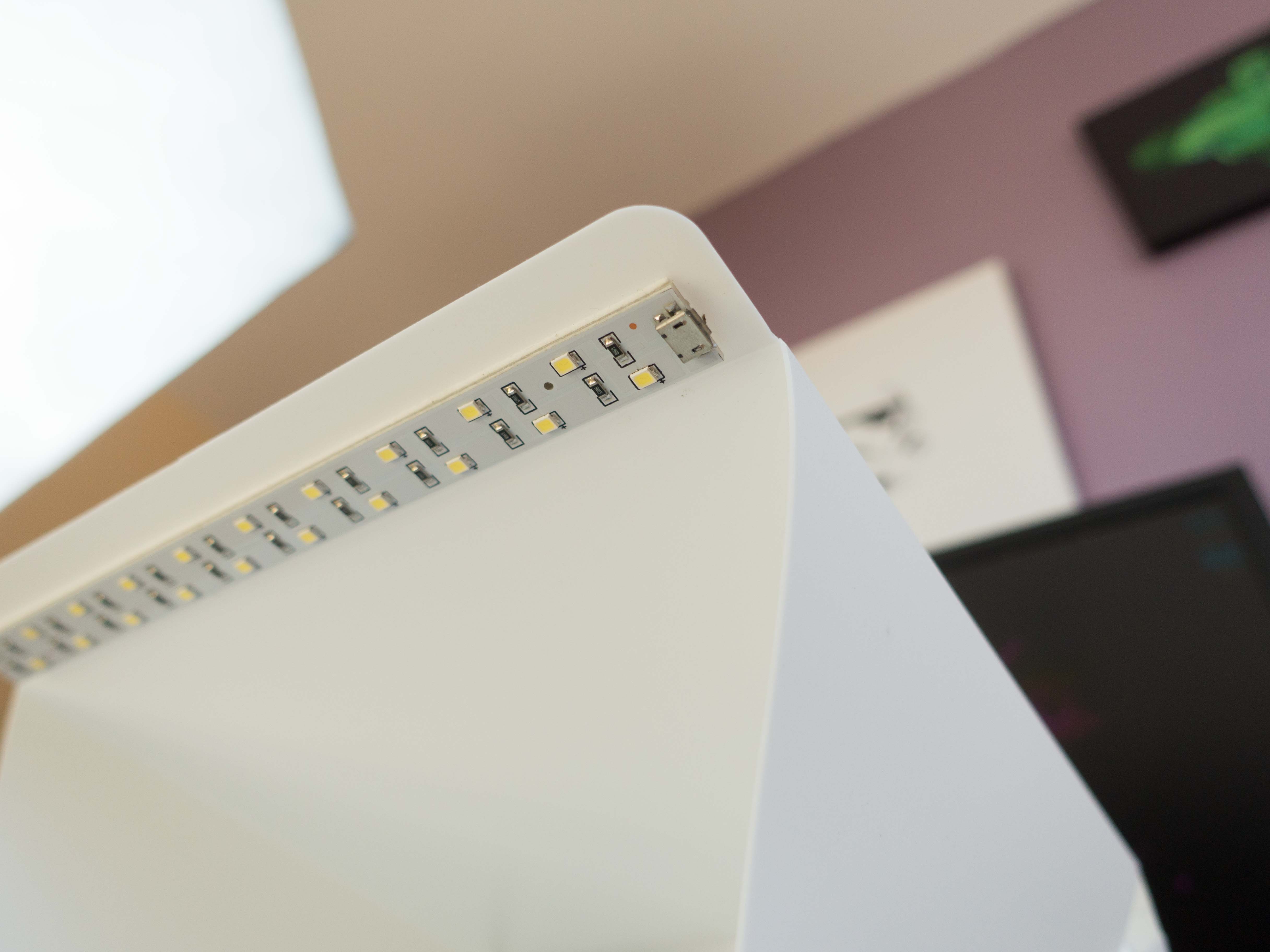 L’armature blanche est en fait une seule & même pièce, qu’il faudra plier (c’est facile) et assembler à l’aide d’aimants. La mise en place se fait littéralement en moins de 1 minute. La barre de LEDs sur le dessus est déjà installée, il ne reste plus qu’à brancher le cable microUSB et à appuyer sur l’interrupteur pour que ça s’allume. On peut difficilement faire plus simple, et j’ai beaucoup aimé avoir juste une prise USB à brancher (avec toutes les batteries et les ports USB qu’on a avec nous, ça ne sera jamais un souci en mobilité).
