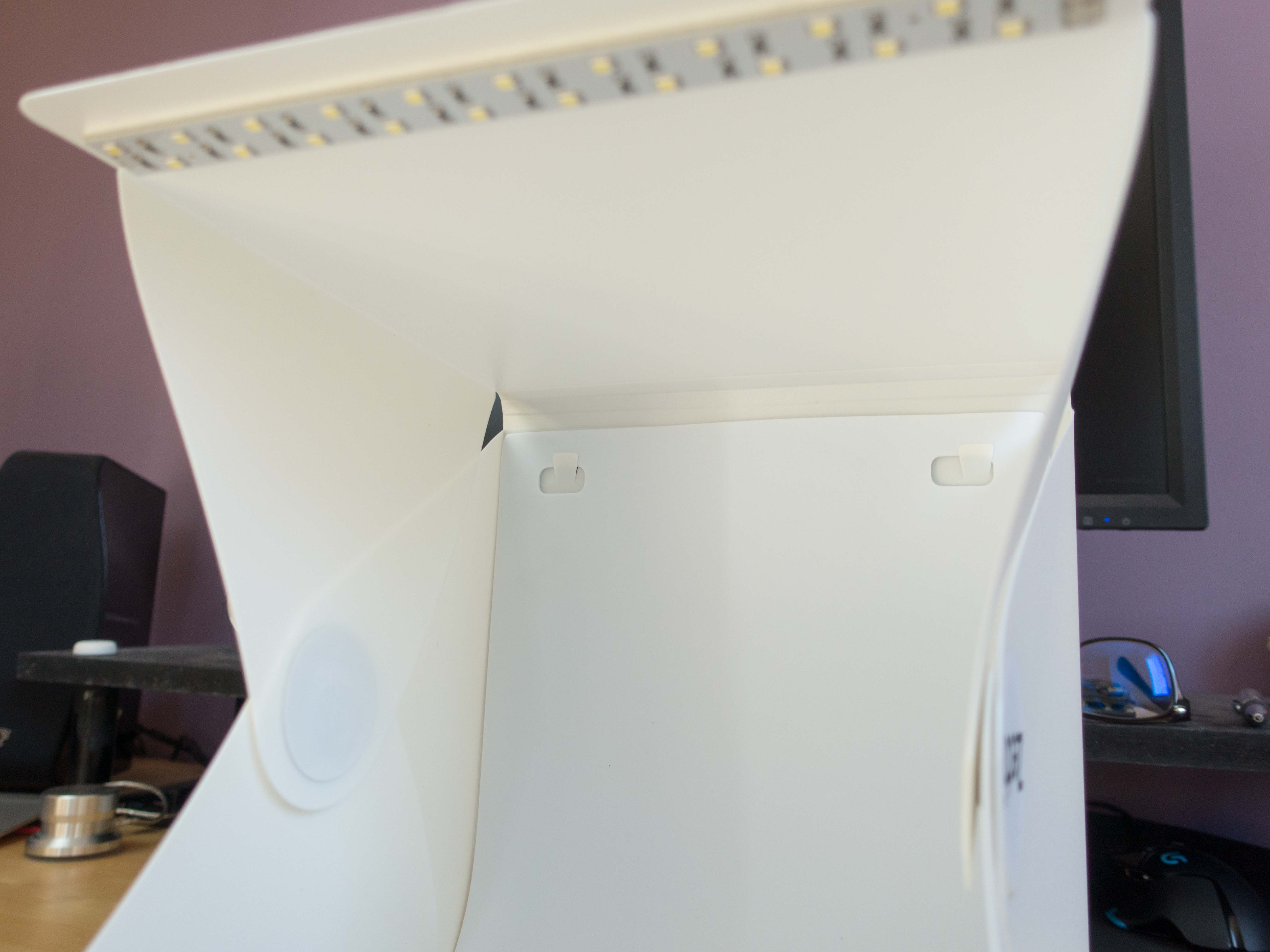 Le fond de couleur s’insère proprement et se fixe dans le coin supérieur du fond. Plutôt pratique à utiliser aussi. Et voici le mini studio photo Zecti une fois monté : c’est plutôt propre, à part le fait que les bords sont toujours un peu pliés vers l’intérieur. A voir si avec le temps ils ont pas tendance à s’écarter un peu. C’est légèrement problématique, on verra ça plus bas.