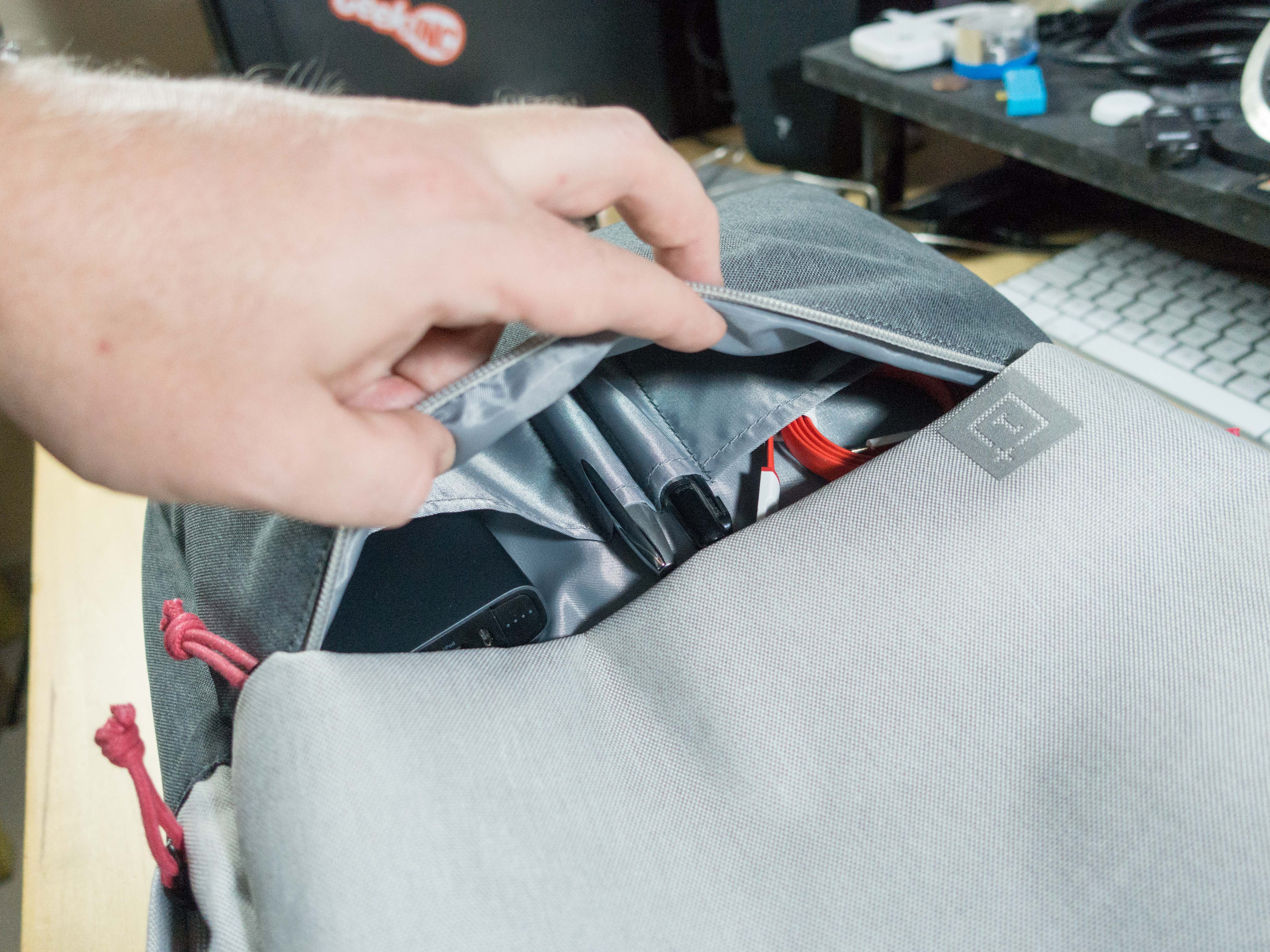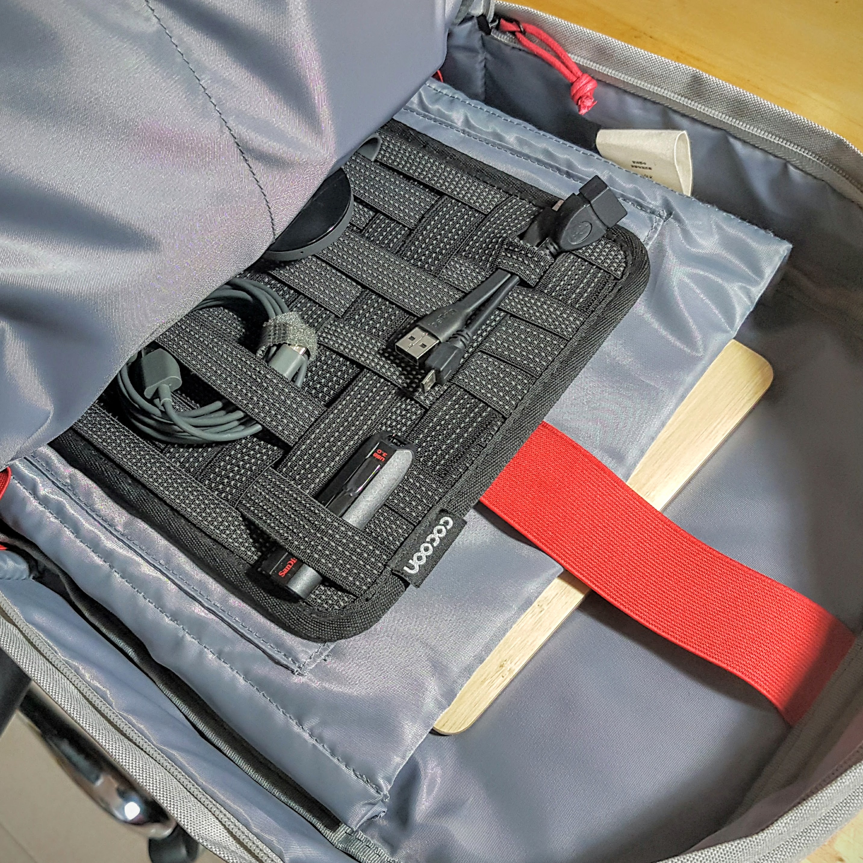 Dans cette grande poche, il sera possible d’installer en vrac les appareils un peu gros : casques audio, grid it, grosse batterie, et même votre appareil photo. Personnellement ce sera l’endroit privilégié pour le Grid-It et mon casque JBL Everest. De chaque côté nous avons 2 strap rouges qui permettent de glisser 2 petites bouteilles ou enceintes de type UE boom. Pratique. Et pour terminer, nous avons deux emplacements pour des smartphones ou batteries externes, une poche qui ferme et qui est parfaitement adaptée à mes chargeurs de laptop et les câbles associés.