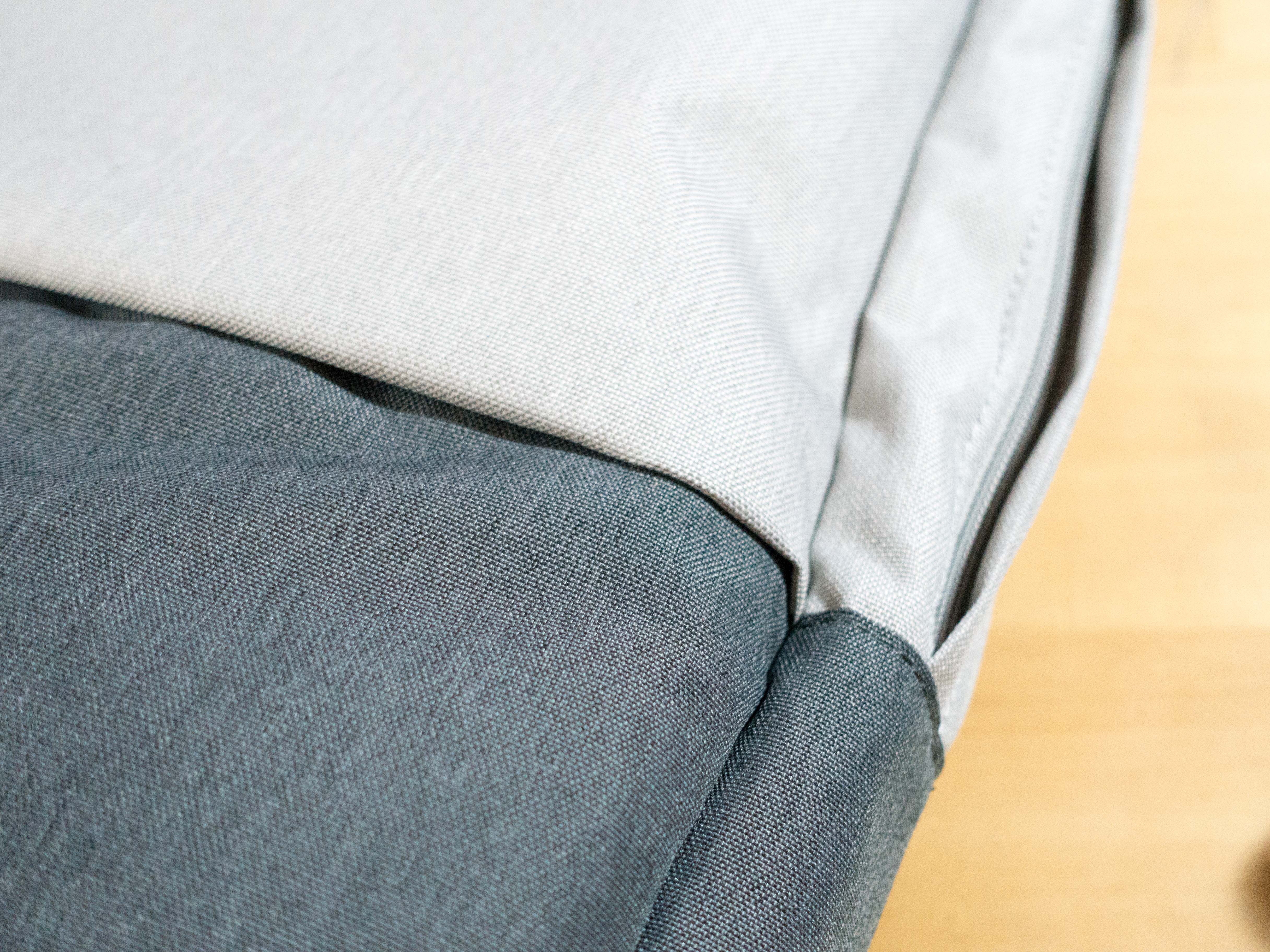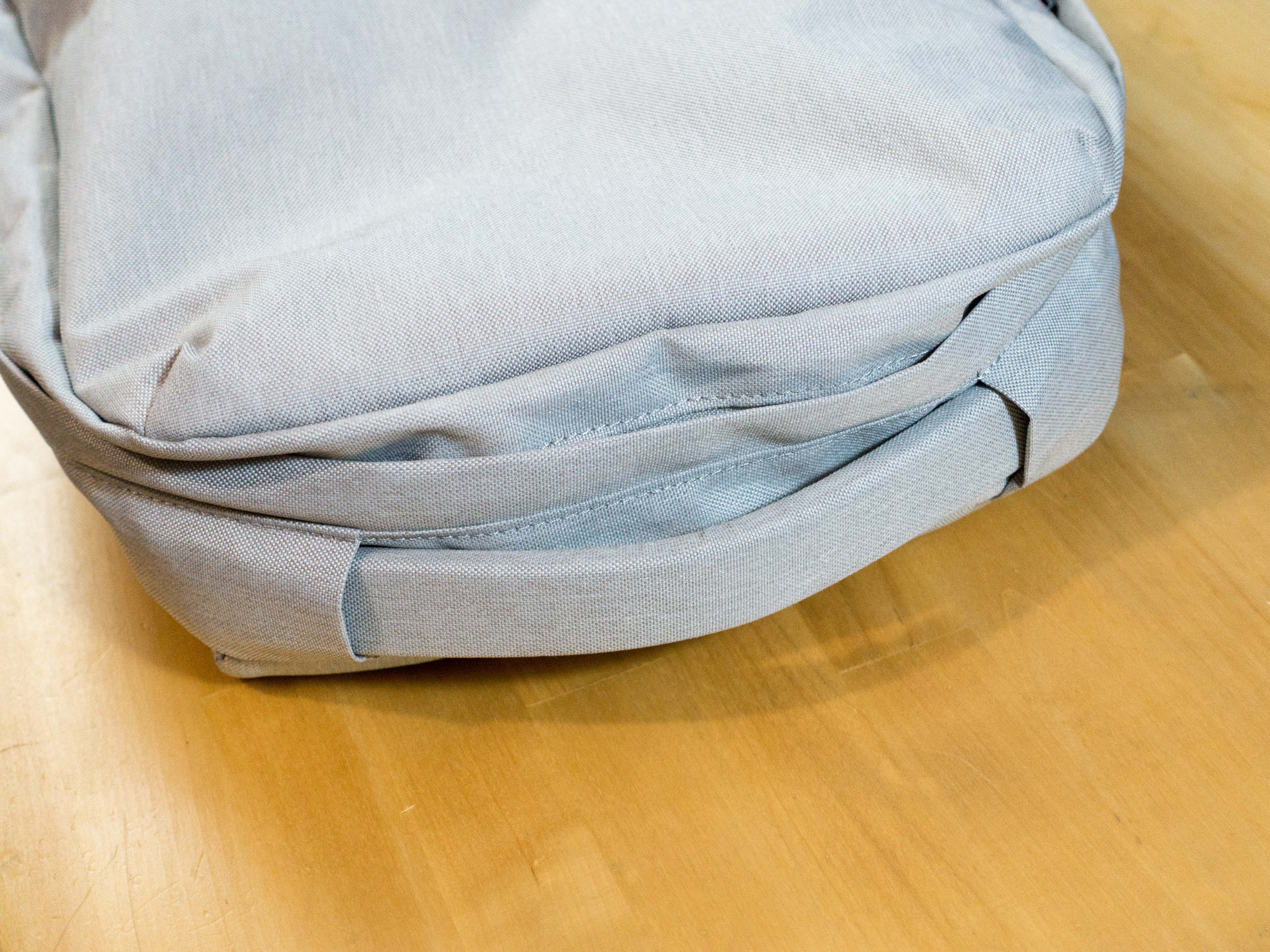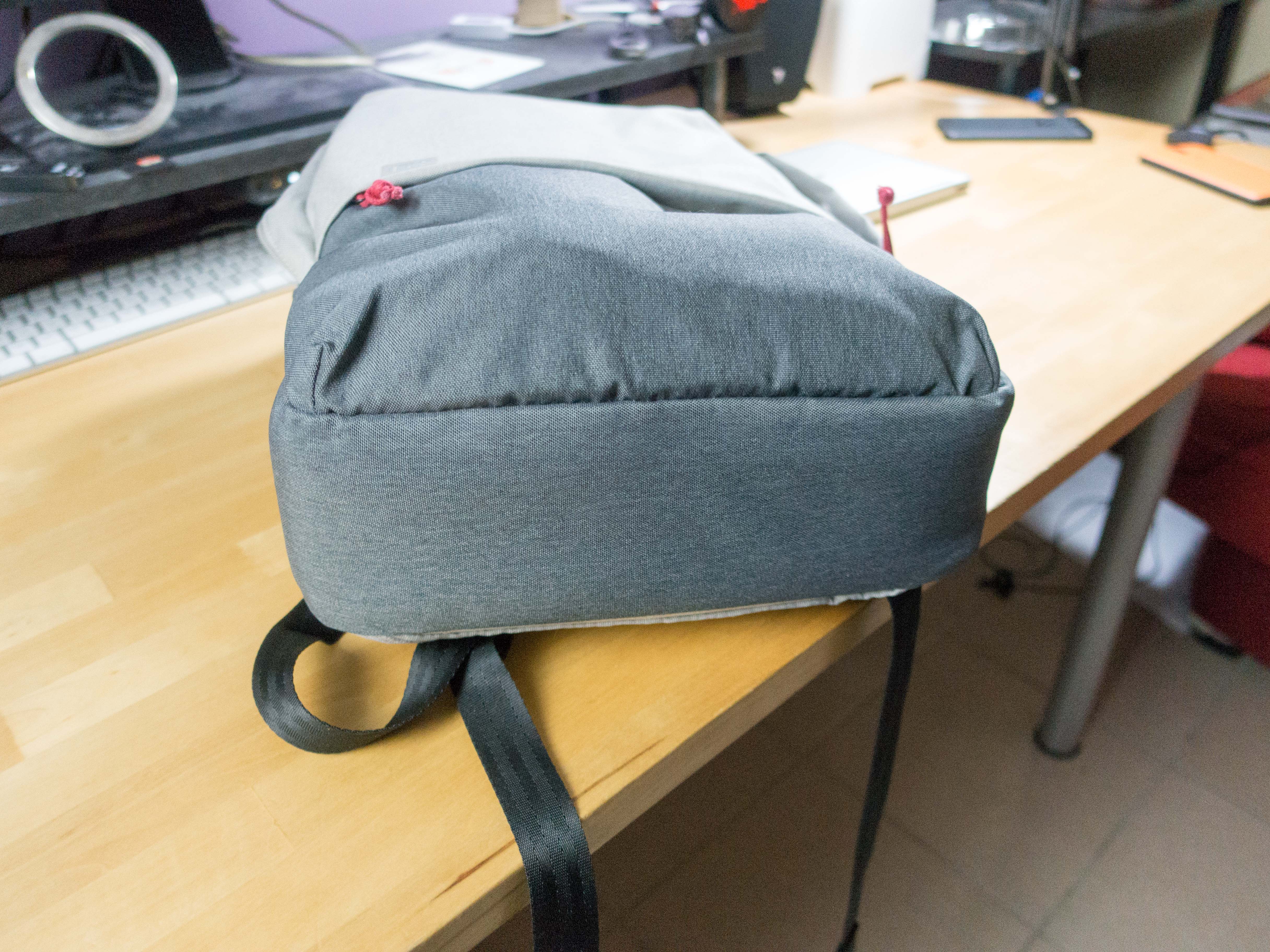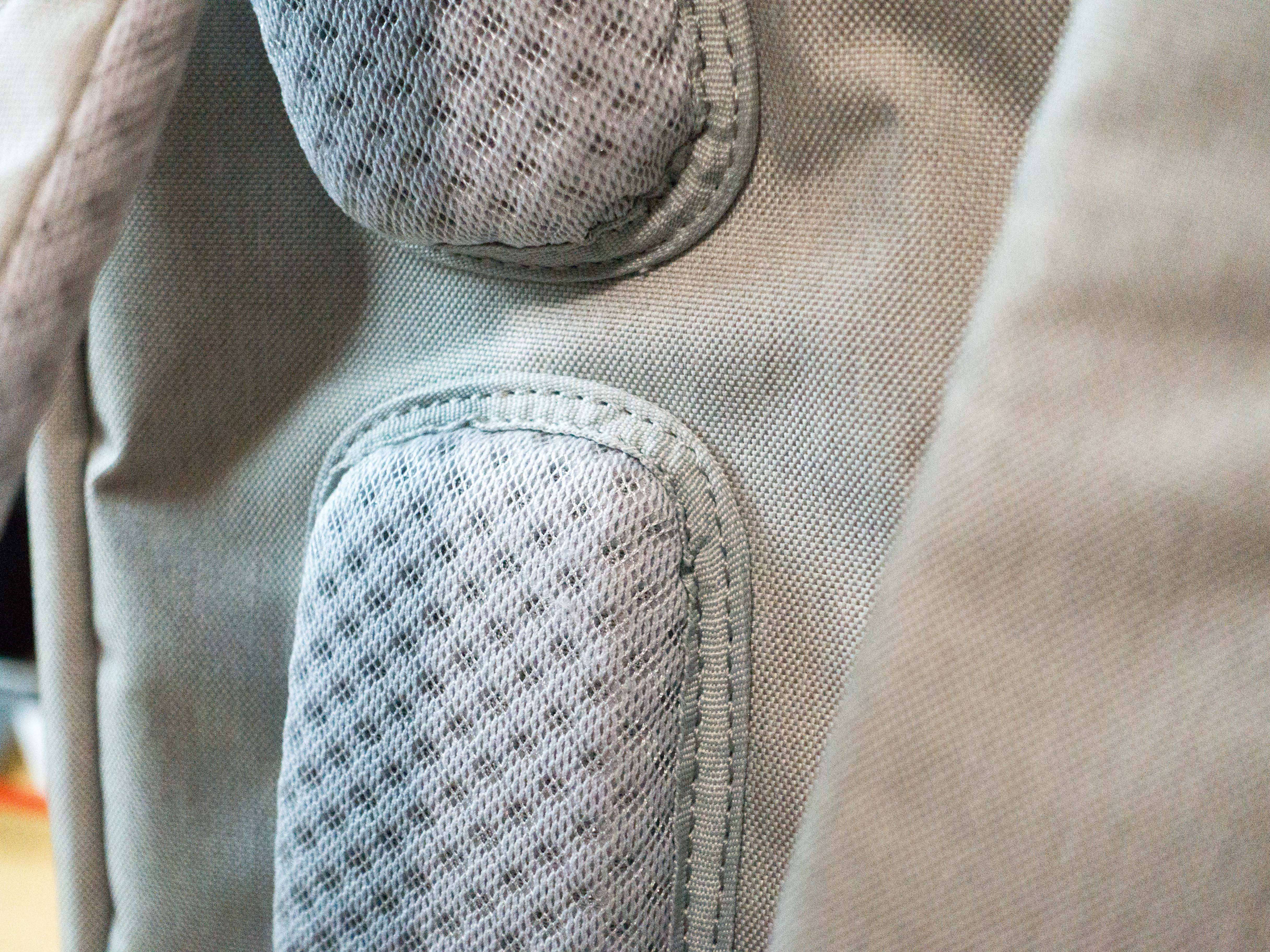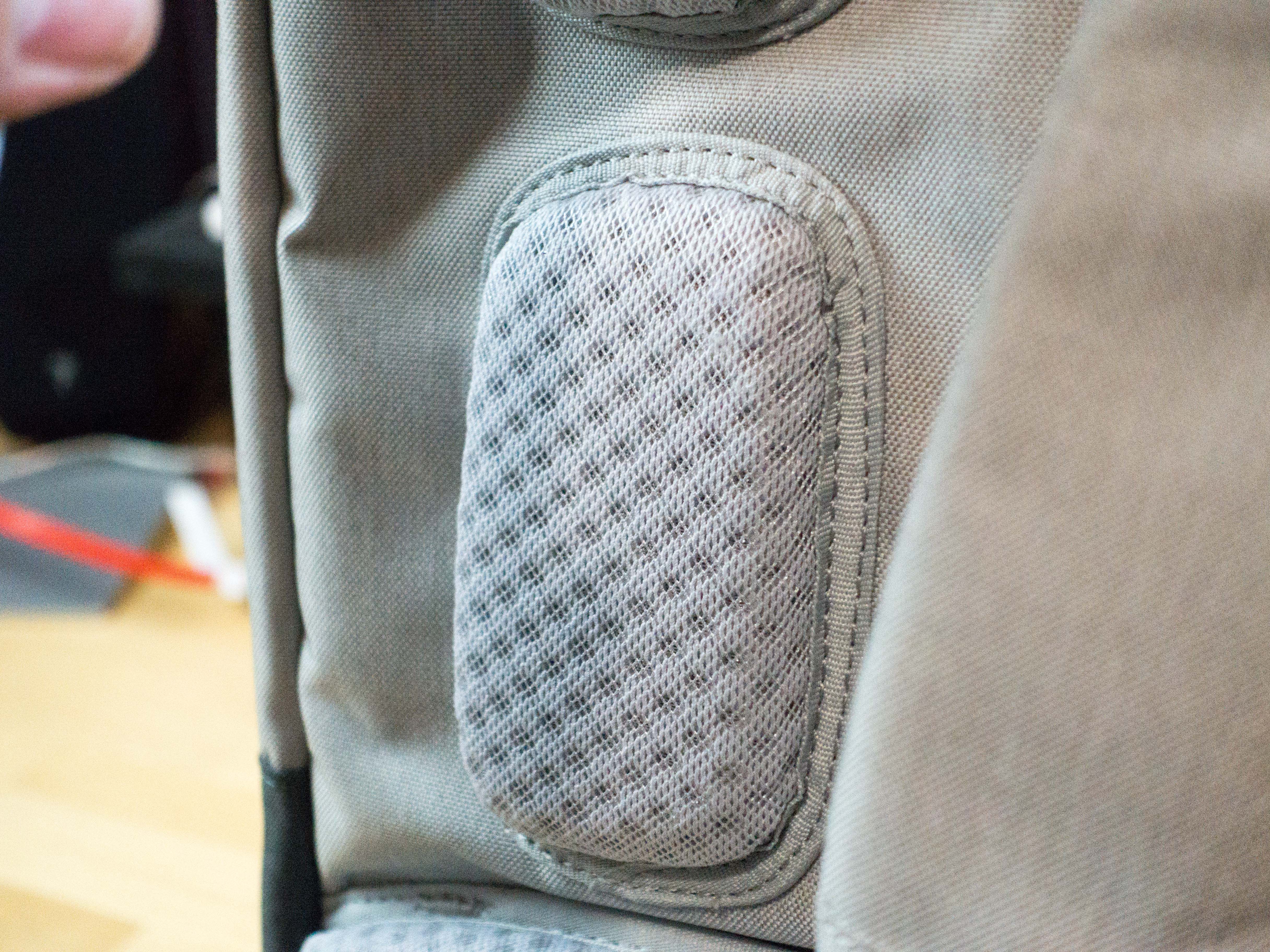 Le premier contact avec le sac est très bon : les coutures sont de qualité, les assemblages parfaitement réalisés, j’ai l’impression d’avoir en main un sac très bien construit. Sur le dessus du sac la poignée me semble parfaitement adaptée, et très solide. Les rembourrages en mousse, présent un peu partout sur le sac, sont plus marqués encore au niveau du dos. Je trouve leur look sous forme de grosses capsules perforées plutôt sympa.