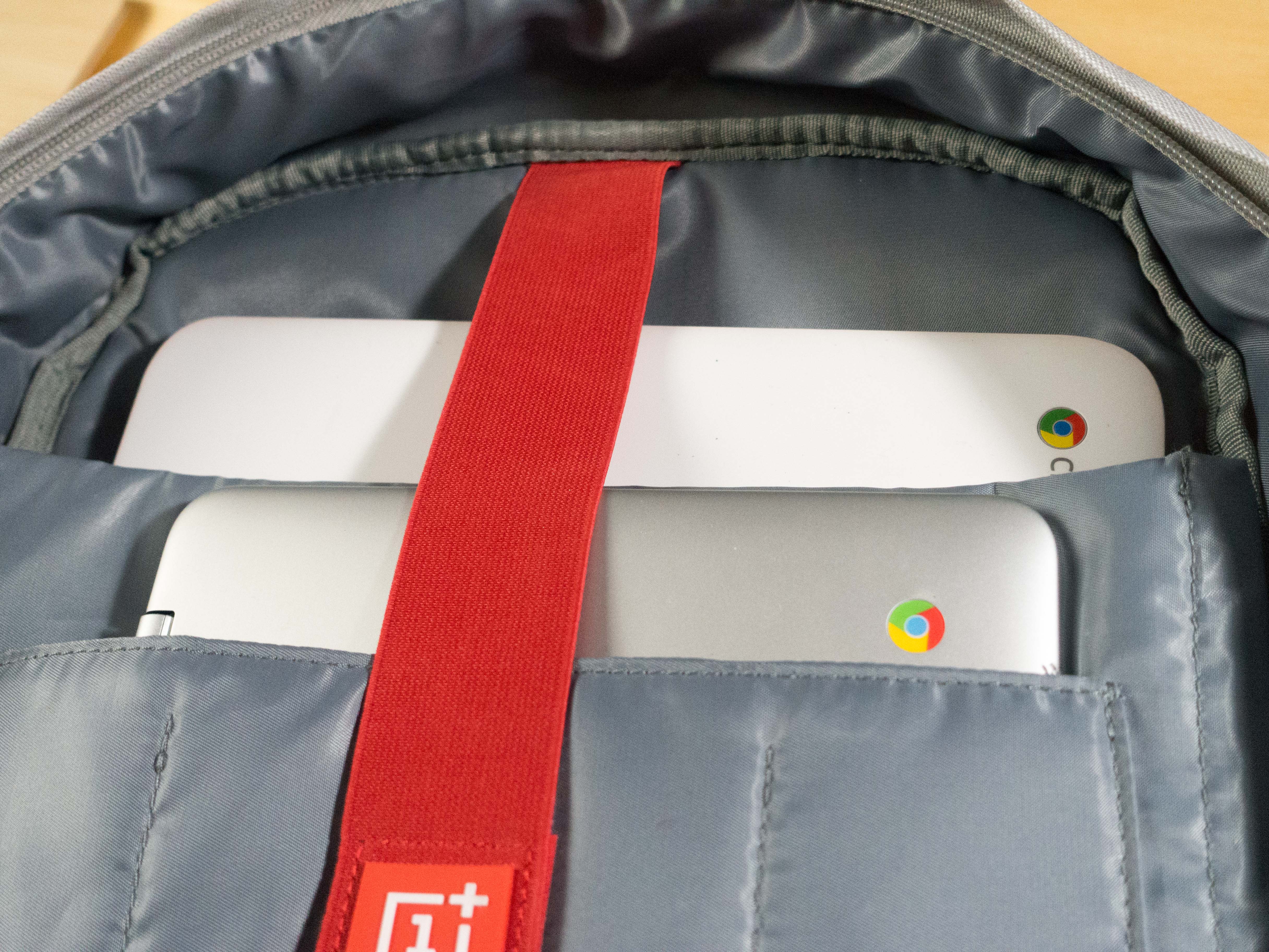 Le sac ne s’ouvre pas sur sa totalité. En effet les deux tiers environ (cela correspond à la zone beige du sac) peuvent être ouverts via le zip. On découvre à l’intérieur plusieurs emplacements pour des tablettes et ordinateurs. Ces emplacements sont largement rembourrés en mousse sur la partie inférieure mais aussi supérieure. Ça permettra donc une bonne protection. Les emplacements sont de deux tailles différentes. Le premier est destiné à une tablette ou un petit laptop. On y rentrera donc facilement un appareil jusqu’à 12 ou 13 pouces je dirais. Le deuxième emplacement est bien plus grand et permet de ranger un gros laptop. J’ai réussi à y glisser un chromebook de 14 pouces énorme (OnePlus annonce des laptop de 15,6 pouces max).