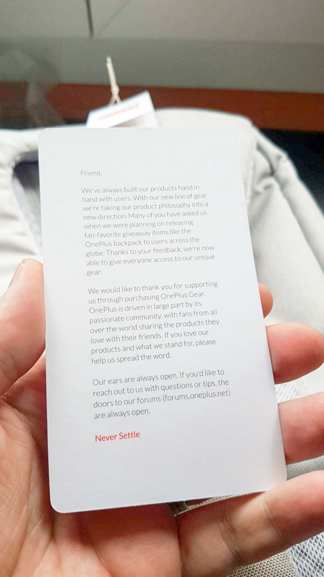 Le sac arrive dans un emballage assez propre, qui laisse découvrir l’esthétique du produit. À l’intérieur on reçoit le traditionnel message de remerciements de l’équipe OnePlus.