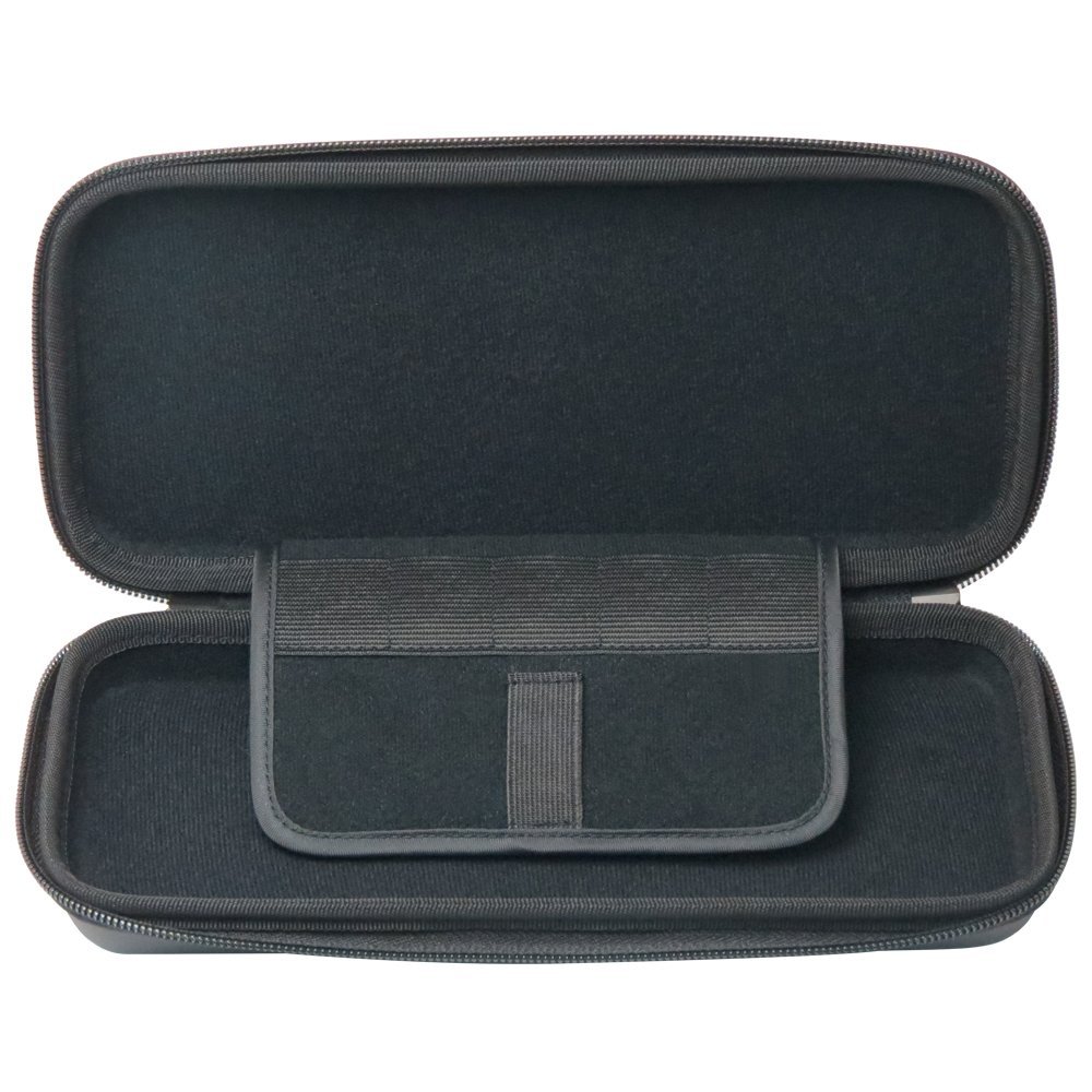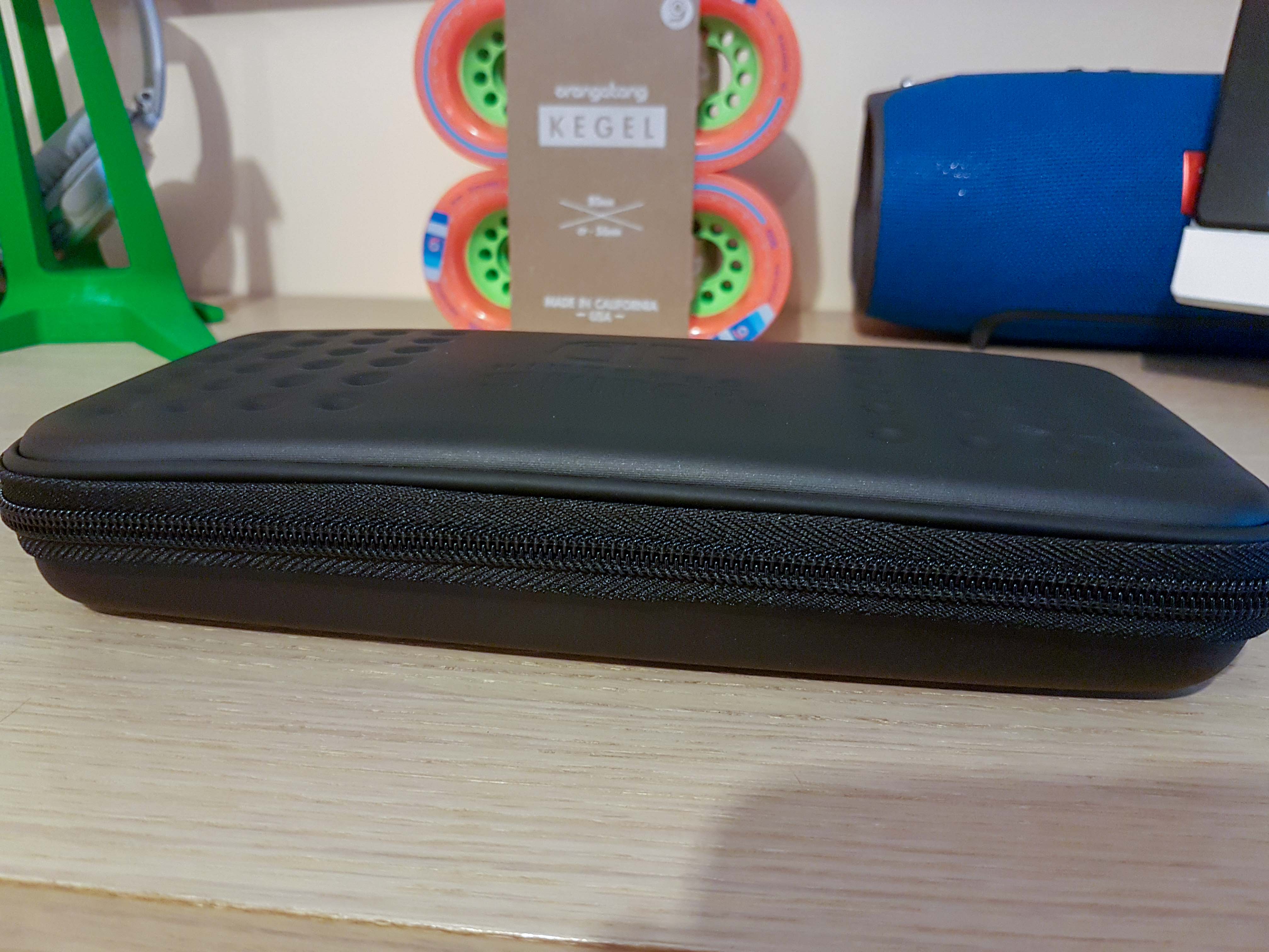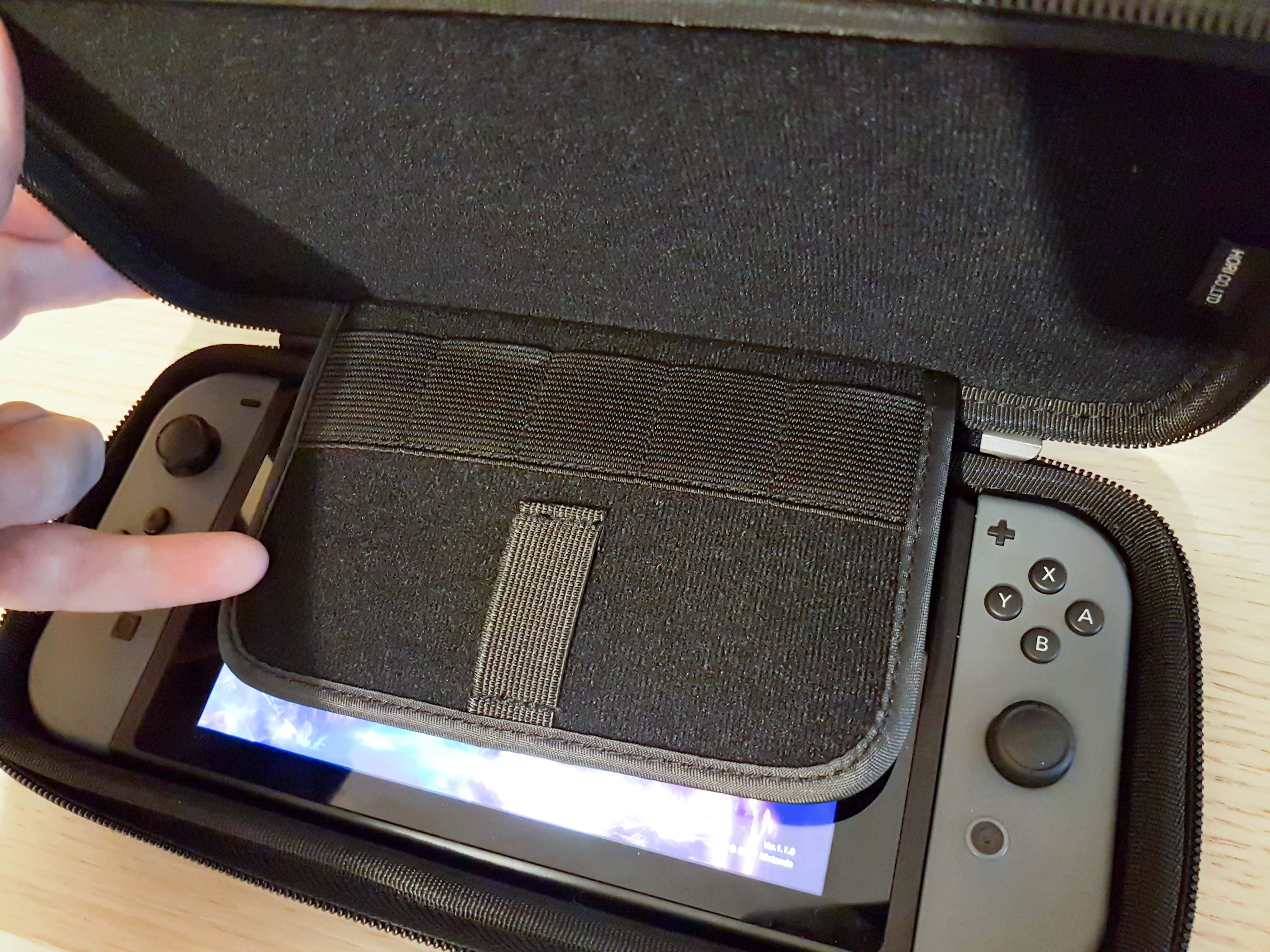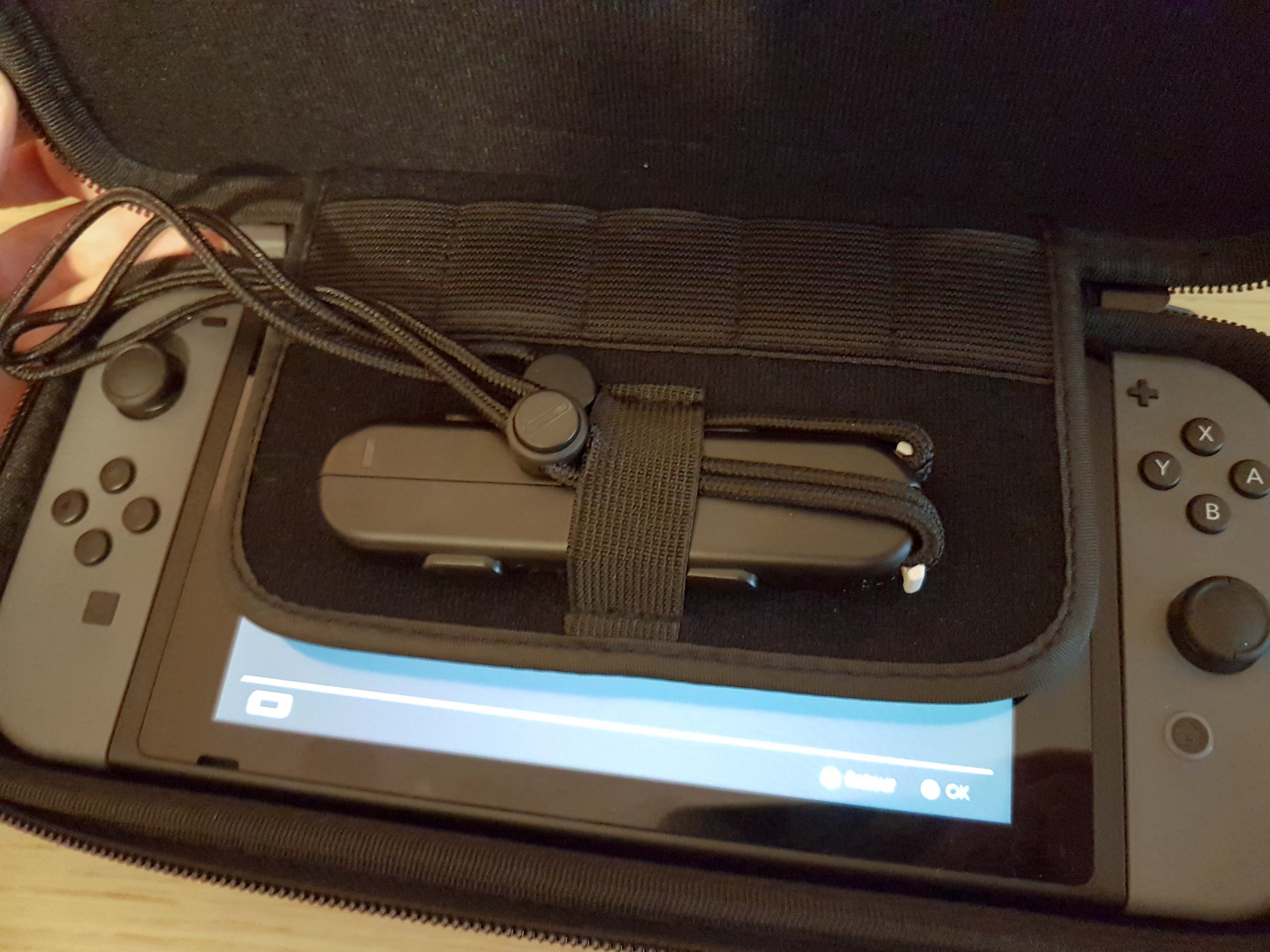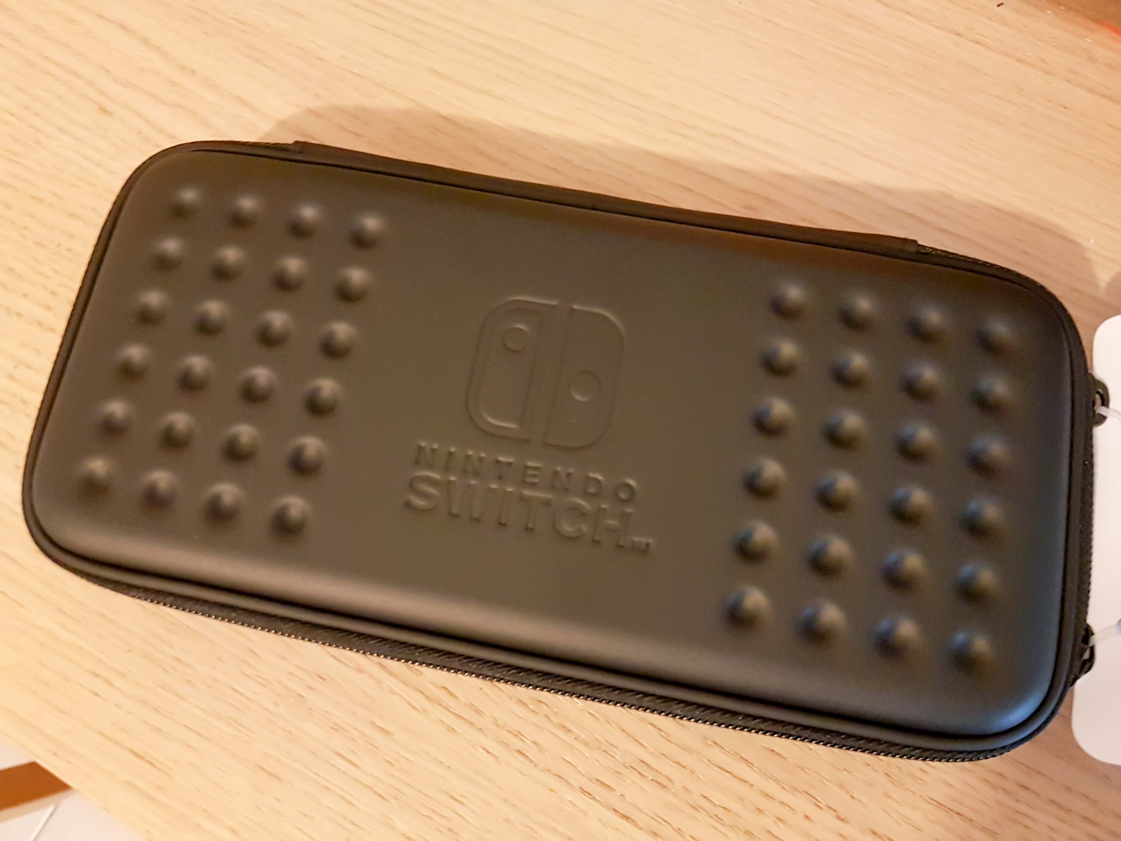 Cette housse est taguée comme « accessoire officiel » Nintendo, gage de qualité, et elle est actuellement vendue pour 26€ sur Amazon (prix qui variera surement). Elle est rigide, noire matte, en un matériau EVA (sorte de plastique souple très doux au toucher) et doublé mousse à l’intérieur. La housse est suffisamment grande pour ranger la console et ses 2 joy cons, 5 cartouches (si on considère qu’on en laisse une dans la console) et un petit accessoire supplémentaire (les dragonnes, un cable USB-C etc…).