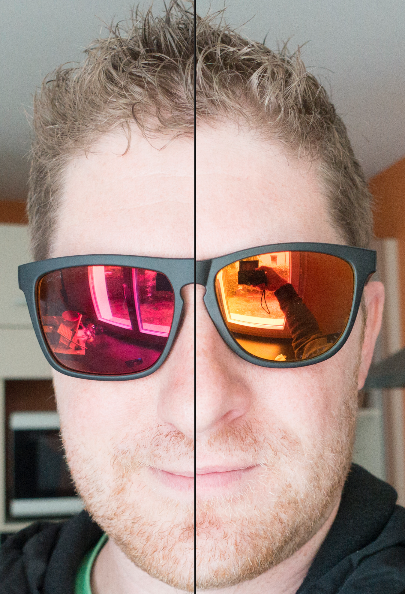 Comme vous pouvez le voir dans le photos ci dessus, le rouge a parfois des reflets orangés, selon l’angle de vue… mais le verre est quand même bien différent du 4KO FIRE déjà existant ! Au niveau de la qualité du verre, le SunGod 4KO RED est aussi foncé que mes précédents verres bleus : adapté à la conduite, et suffisamment puissant pour le plein soleil sur la plage !