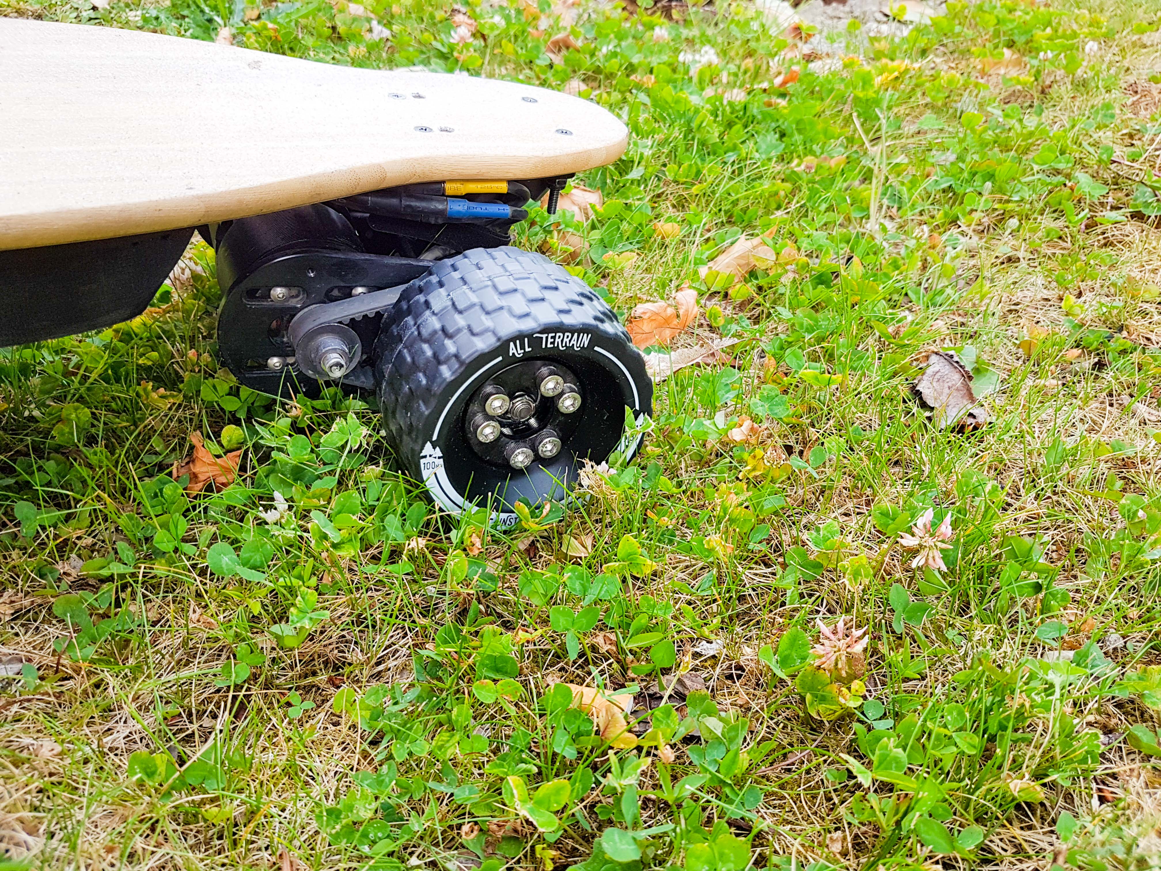 J’ai ensuite essayé de rouler sur des terrains en terre et mélange de terre & herbe. Ca passe niquel ! Certes on sera limité à des vitesse très basses, car les irrégularité du terrain auront vite fait de vous éjecter de la board. Mais les roues apportent une certaine motricité sur les sols mous, et j’ai pas eu l’occasion de faire patiner les roues à la moindre accélération.