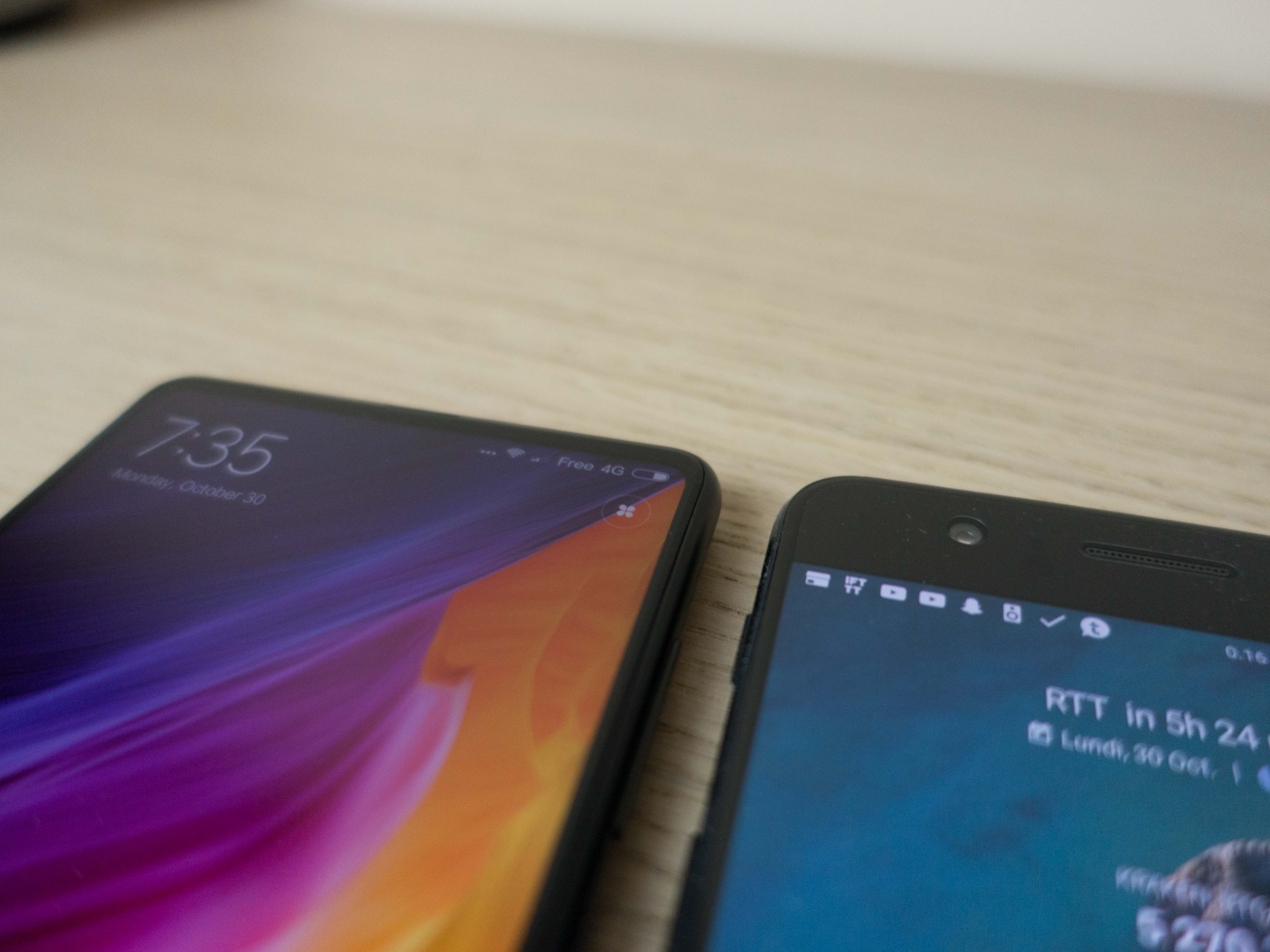 Une comparaison avec mon OnePlus 5 est très parlante : on voit la différence entre un smartphone classique et un smartphone avec des bordures réduites : au final un écran plus long pour le Mi Mix 2, dans un encombrement identique à un « gros » téléphone avec écran 5.5 pouces. Ici l’écran fait quasiment la même largeur mais il s’est étiré vers le haut, comme le LG G6 (d’ailleurs allez jeter un coup d’oeil à mon test, mon coup de gueule est toujours valable ici).