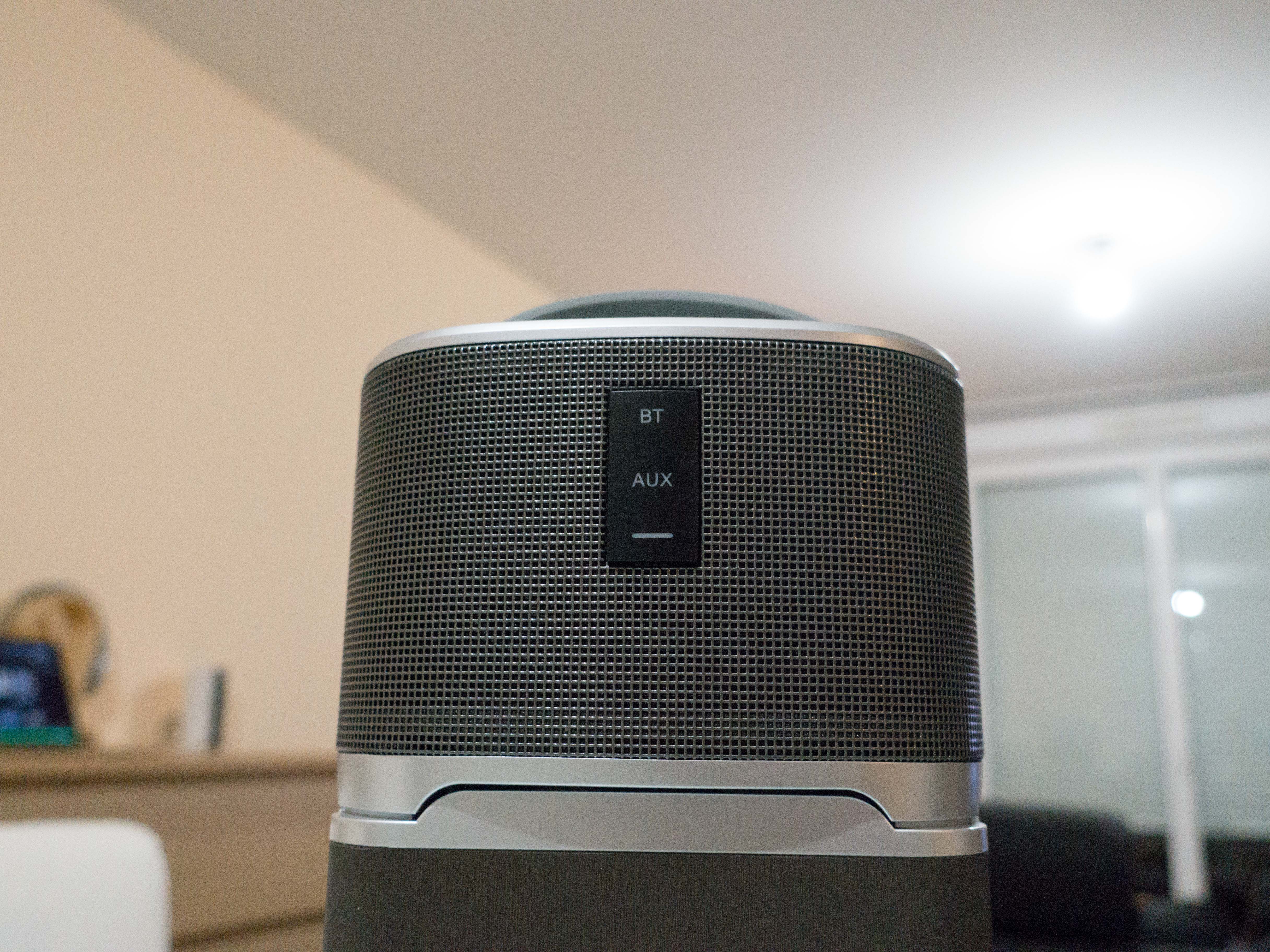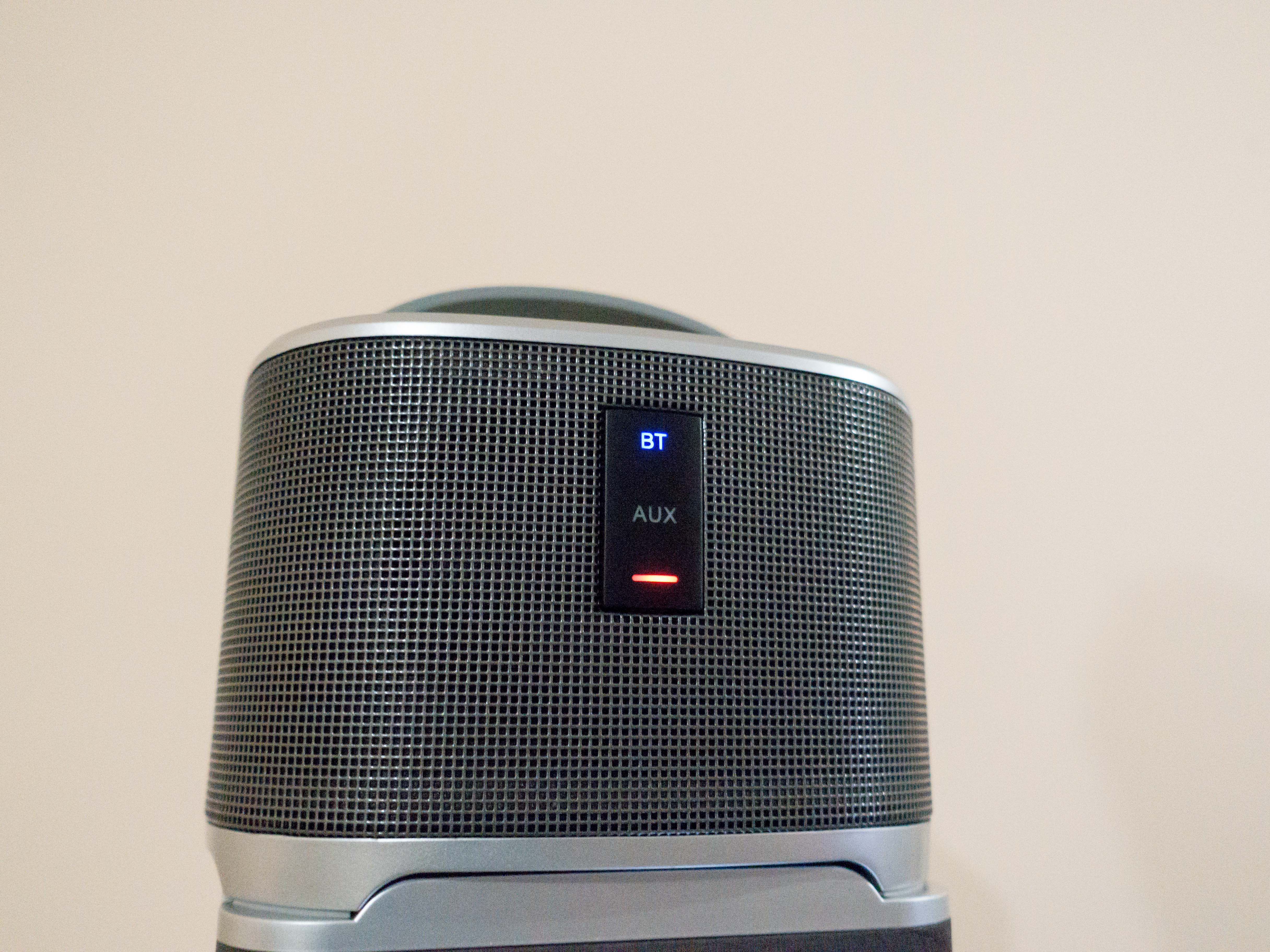 Revenons sur la partie haute détachable, elle est plutôt bien finie et jolie. Un mélange de plastique clair & foncé, et un petit panneau de commande qui indiquera si le bluetooth ou si la prise auxilaire 3.5mm est branchée.
