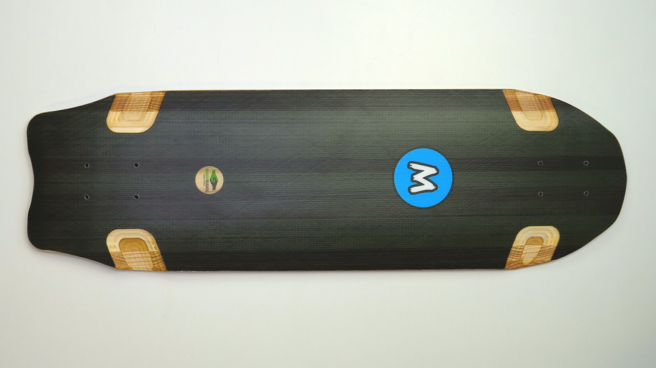 Sur la face inférieure on note un traitement technologique (fibres), qui renforce clairement la planche et qui participera à la dynamique (très importante) de ce setup. En effet, le Cruiser propose une rigidité importante, une souplesse basse mais en même temps assure une très bonne filtration des vibrations venant du sol. La combinaison de différentes couches de bois & d’une couche de fibres (« green » elles aussi) rend ce Mellow Cruiser très intéressant. De plus, cela contribue à lui donner un look que j’adore, avec ce gros « M » bleu en plein milieu.