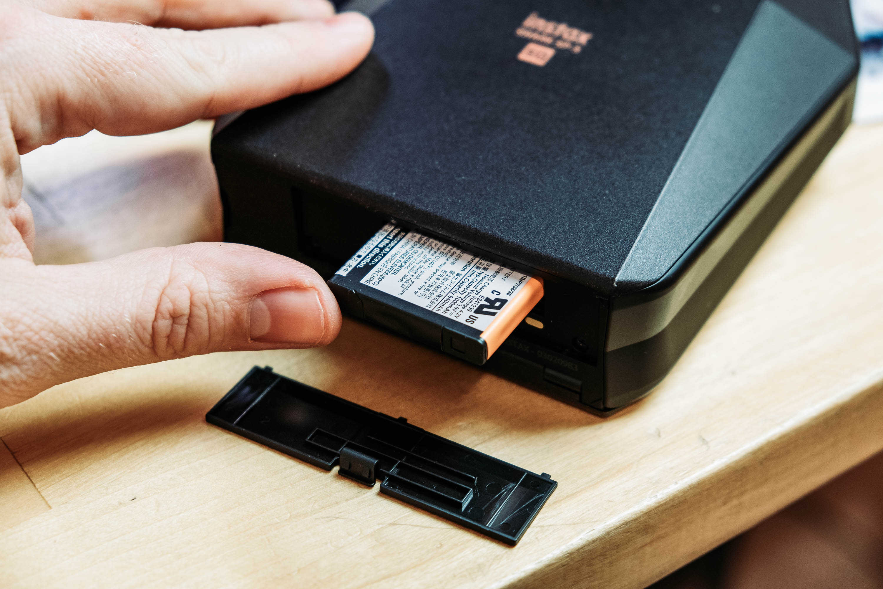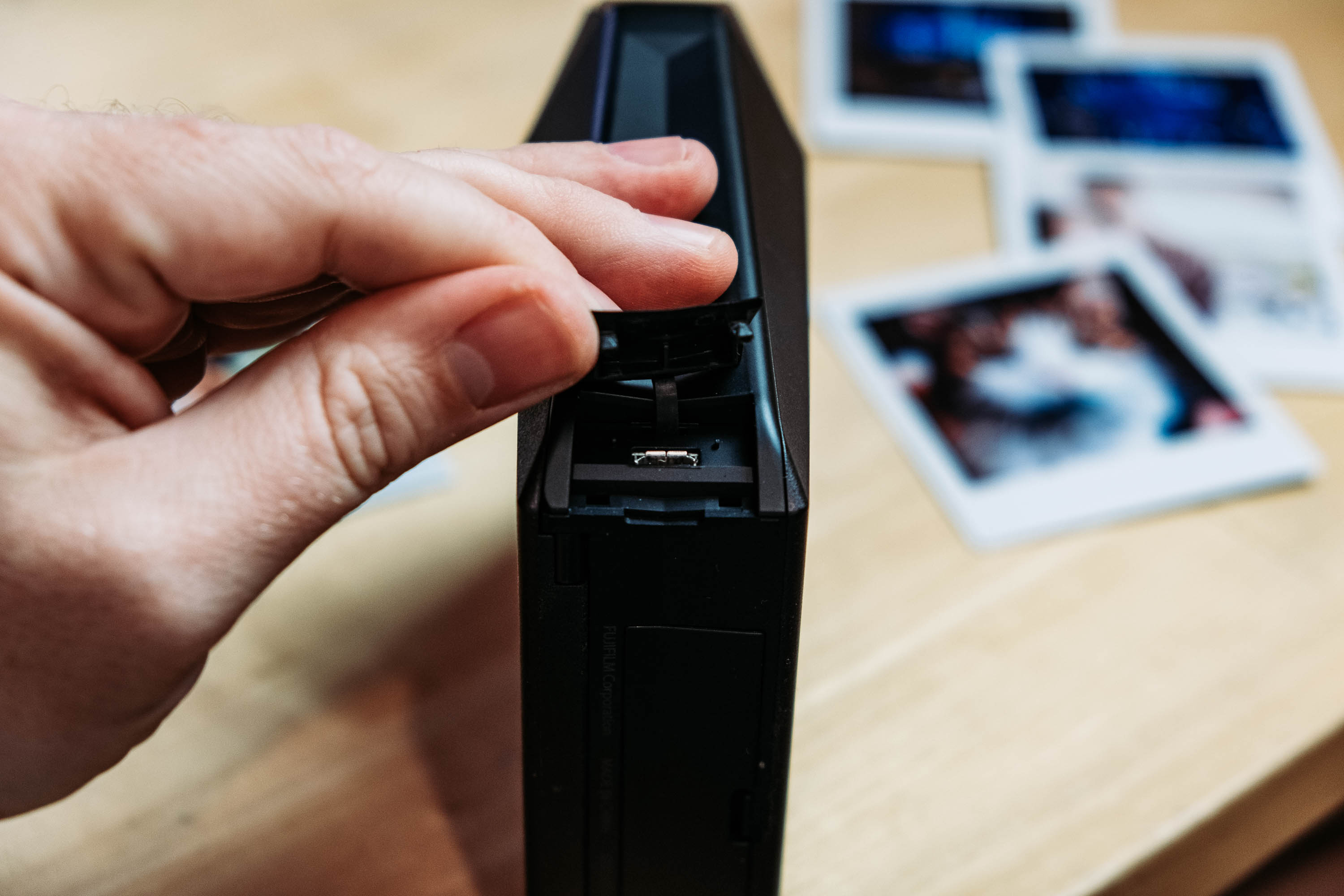 L’imprimante Fuji Instax Share SP-3 comporte 2 boutons : un bouton On/Off, un bouton « reprint » (imprimer de nouveau la précédente photo). Elle comporte aussi un port de charge micro USB et un rangement pour une batterie standard. D’ailleurs, la batterie est tellement puissante qu’elle peut imprimer largement plusieurs dizaines de photos. La spec donne 150 / 160 photos, de quoi partir en vacances sans la recharger une fois !