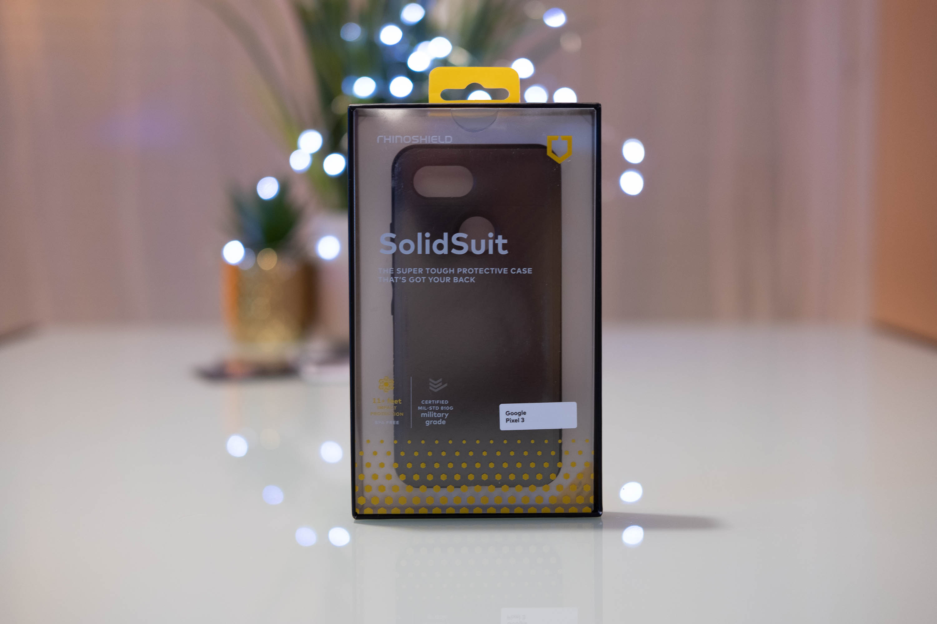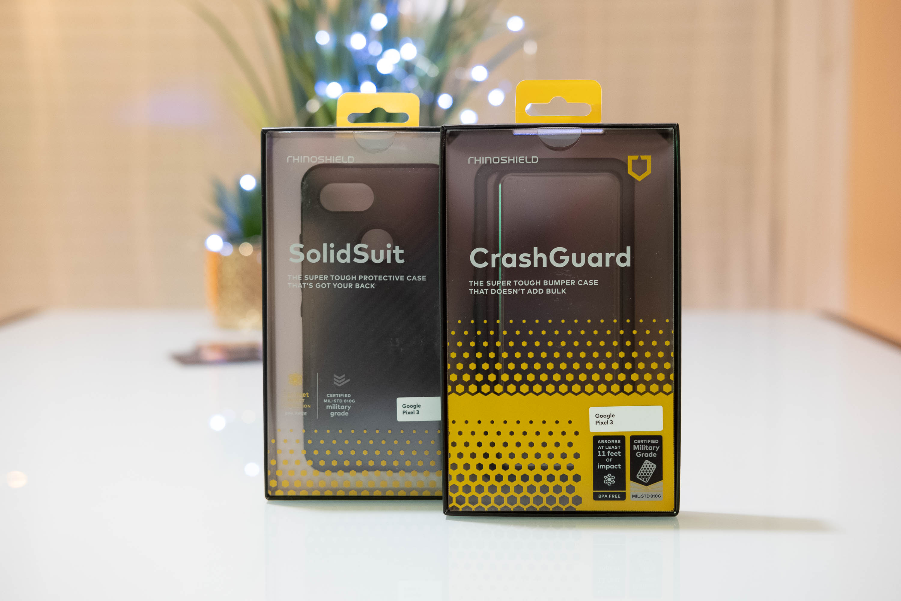 Dans cet article on abordera 3 produits : 2 coques Rhinoshield pour Pixel 3 (bumper CrashGuard & coque SolidSuit) existant en 3 couleurs, et 1 objectif photo 2 en 1, appelé « Grand angle HD 4K + Macro » et qui se fixe facilement sur la coque SolidSuit via un embout métallique dédié.
