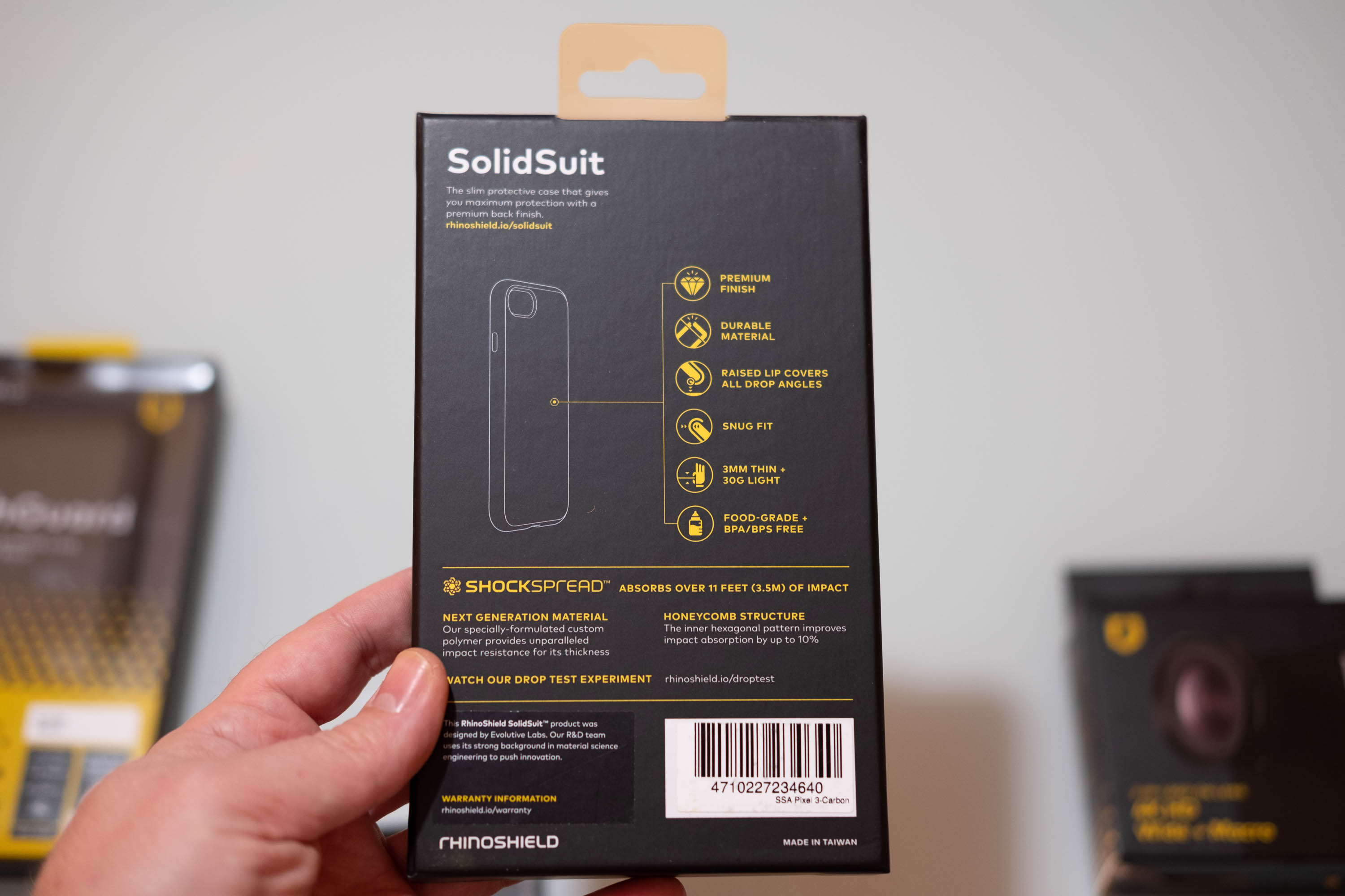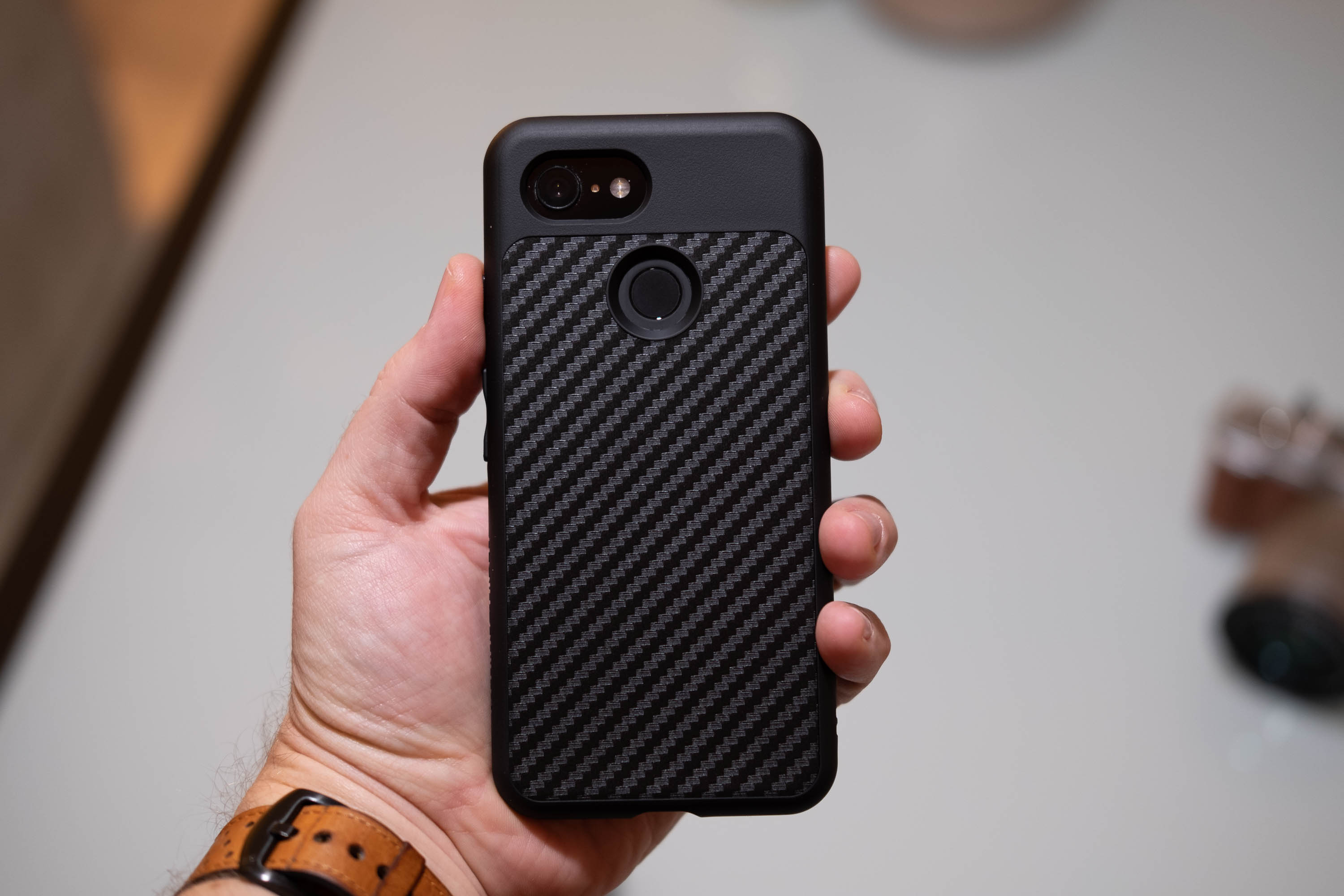 Le premier contact avec la coque SolidSuit est identique à ce que j’ai pu voir sur Pixel 2 : très rigide, très bien finie, compacte et fine. Elle donne vraiment une sensation de solidité. Elle est aussi assez difficile à installer (il faut un peu forcer) et encore plus difficile à enlever : parfaitement ajustée, elle n’aura pas du tout tendance à sortir.